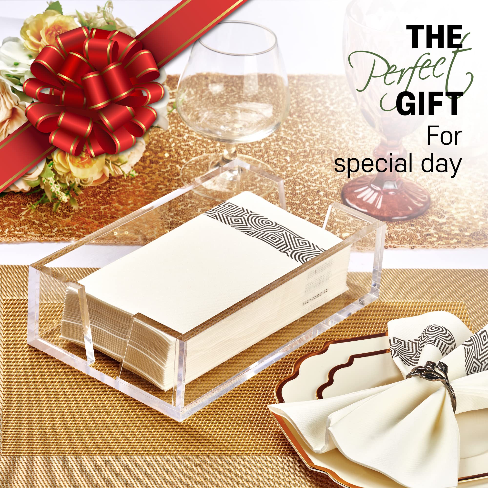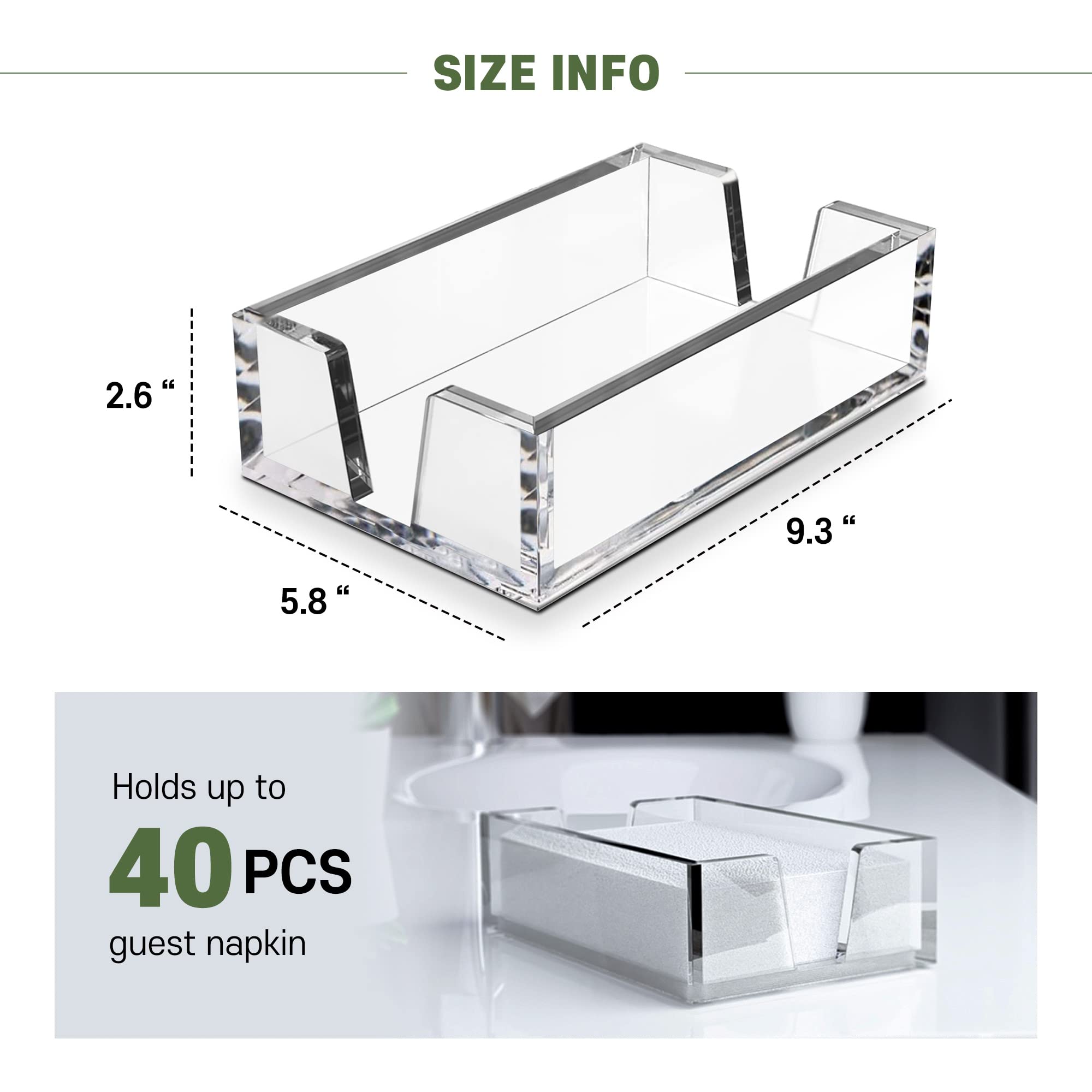 Standard Size : The napkin holder is designed for standard 8.5"x4.5" guest towel napkins. The holder is 2.6" tall, giving ample room for napkin storage. It occupies a small footprint on your table while accommodating a variety of napkins including paper napkins, cloth napkins, tissues and more DESIGN : Design: V-shaped openings on the side for easy access to one paper towel each time, keeping it clean and tidy at all times without messing up others. High Quality Acrylic : Made of 8mm thick high quality acrylic, stronger than glass, easy to clean and maintain. The acrylic surface is polished and does not rust or oxidize over time, making it suitable for bathrooms and dining tables.perfect for indoor or outdoor use. GREAT DECOR : This is the first new product on the market with a V-shaped opening. We designed our napkins and paper towels to be easier to use. The simple and modern design of clear and transparent colors goes well with any place. Stylish storage space for bathrooms, dining tables, restaurants and countertops. Manufacturer's Warranty : We value your experience. We will replace or refund you if there are any quality or shipping damage issues. We respect your choices.
