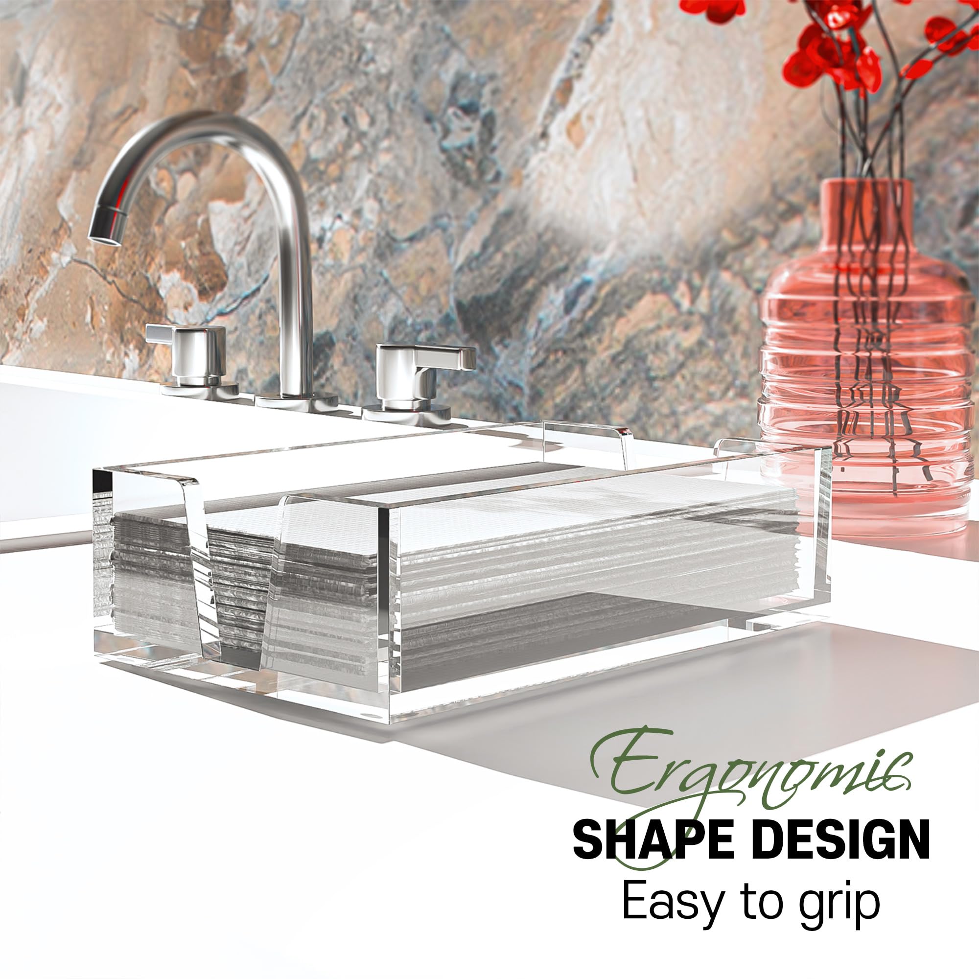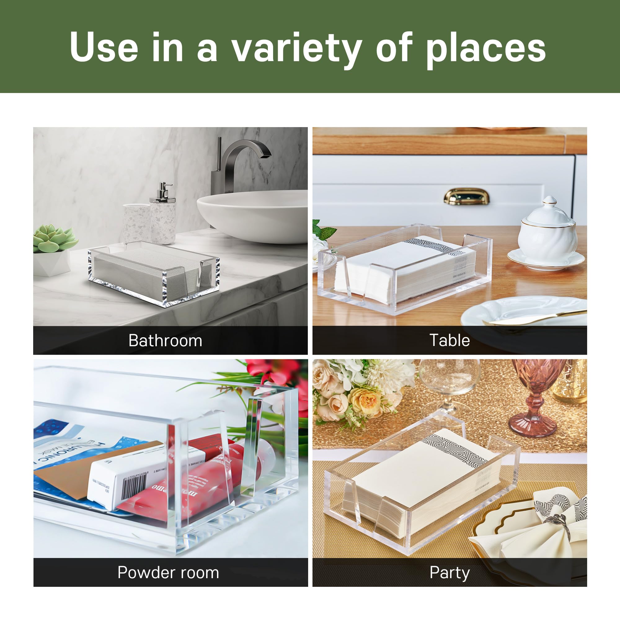 GREAT DECOR : This is the first new product on the market with a V-shaped opening. We designed our napkins and paper towels to be easier to use. The simple and modern design of clear and transparent colors goes well with any place. Stylish storage space for bathrooms, dining tables, restaurants and countertops.