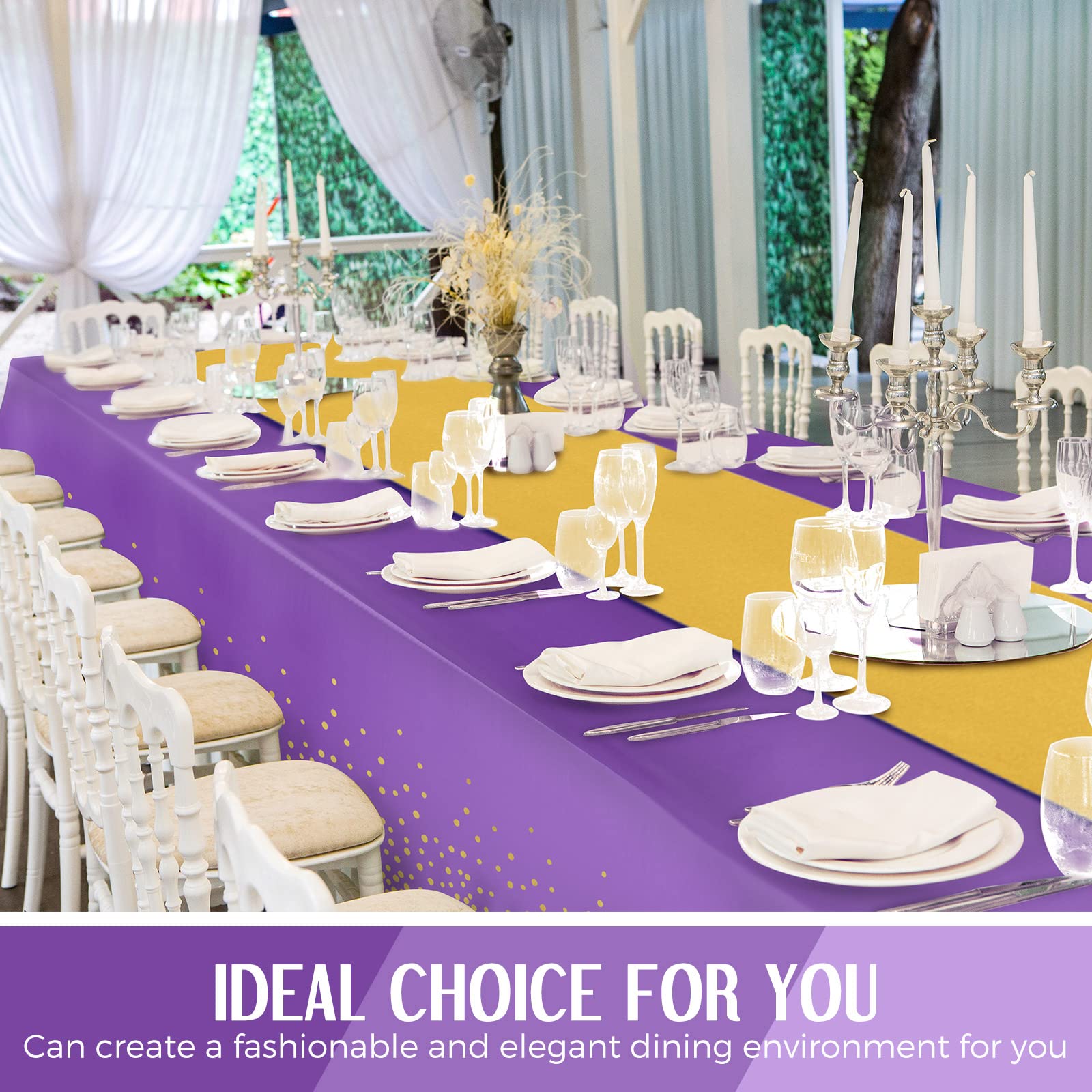 Features: Pleasant using experience: The set of rectangle table cloth is suitable for wedding banquet decoration and any other indoor or outdoor occasions. In other words, it could play a decorative role while protecting your table from stains, bringing yourself and guests a pleasant experience. Preparation before use: Due to long distance transportation, these centerpieces for party tables may be a little crumpled, which is the normal phenomenon. You can use an iron to smooth and flatten these clothes before using them. Specifications: Material: satin and plastic Main color: purple gold Size of table cloth: approx. 54 x 108 inches Size of table runner: approx. 12 x 108 inches Package includes: 12 x Plastic table cloths 12 x Satin table runners Notes: Manual measurement, please allow slight errors on size. The color may exist a slight difference due to different screen displays