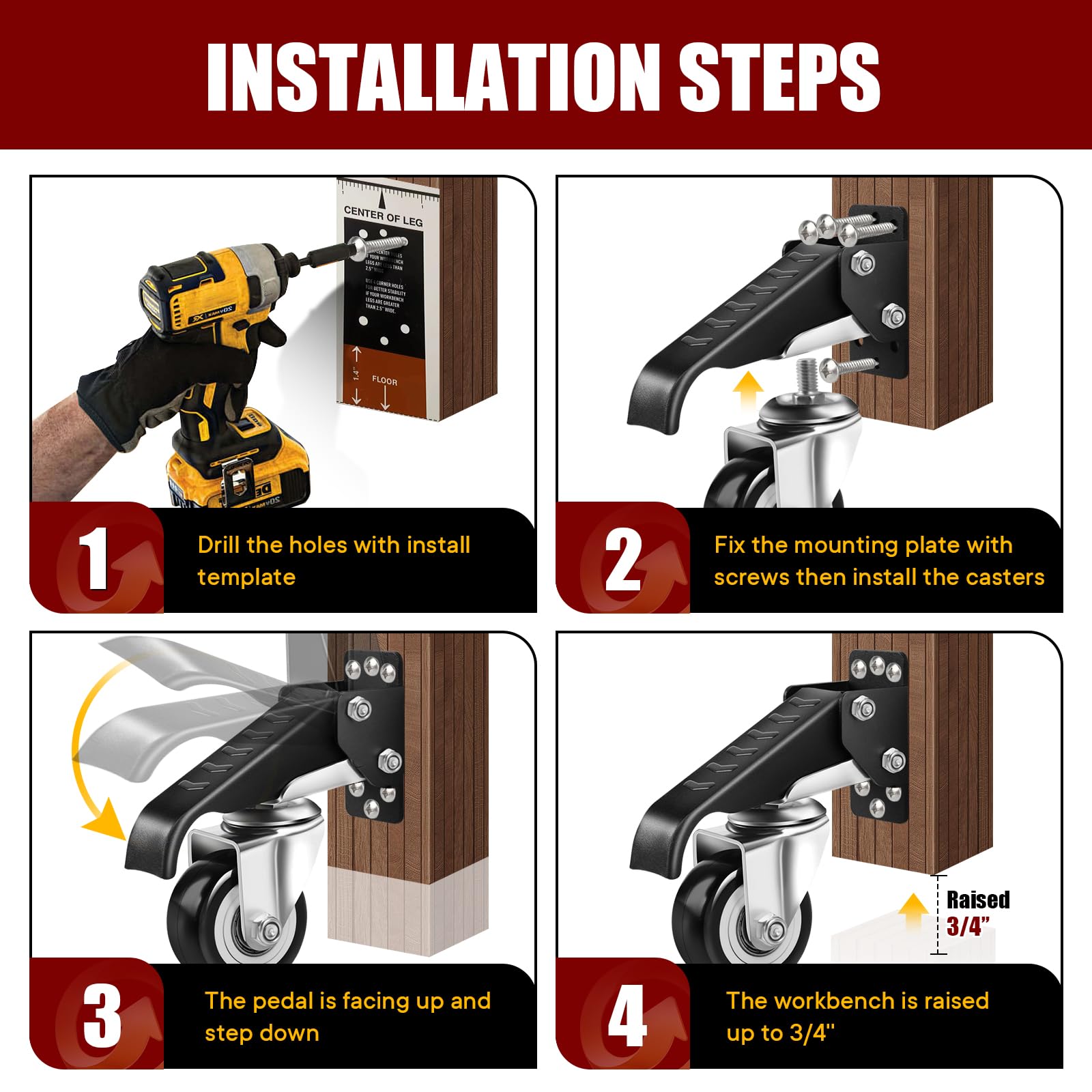 【Easy to Install】- The workbench casters include 4 workbench caster assemblies with assembly hardware, all the necessary mounting hardware, two instructions and four 2-1/2" swivel casters. Designed for quick and hassle-free installation, these casters come with all necessary hardware and instructions, making them easy to set up on your workbenches, tables, or cabinets.