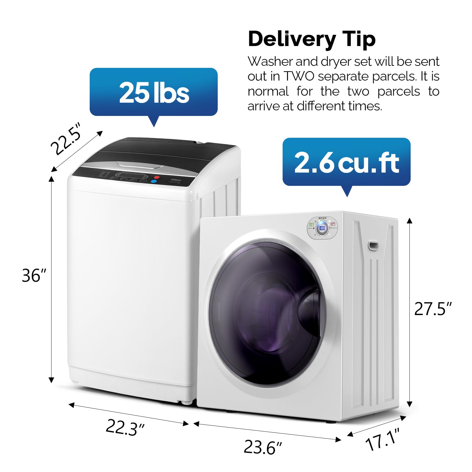 【Wash & Dry Efficiency】This washer and dryer combo combines a 25lbs fully automatic washing machine and a max 14.5lbs electric portable clothes dryer for seamless same-day laundry cycles. The washer's spin-dry function pairs with the dryer's 1400W power and 149°F heat to eliminate damp waits—perfect for rainy days or busy schedules. Wash, dry, and wear your favorite outfits all in one day! (NOTE: for quick drying, no more than 9 pounds of clothes at a time)