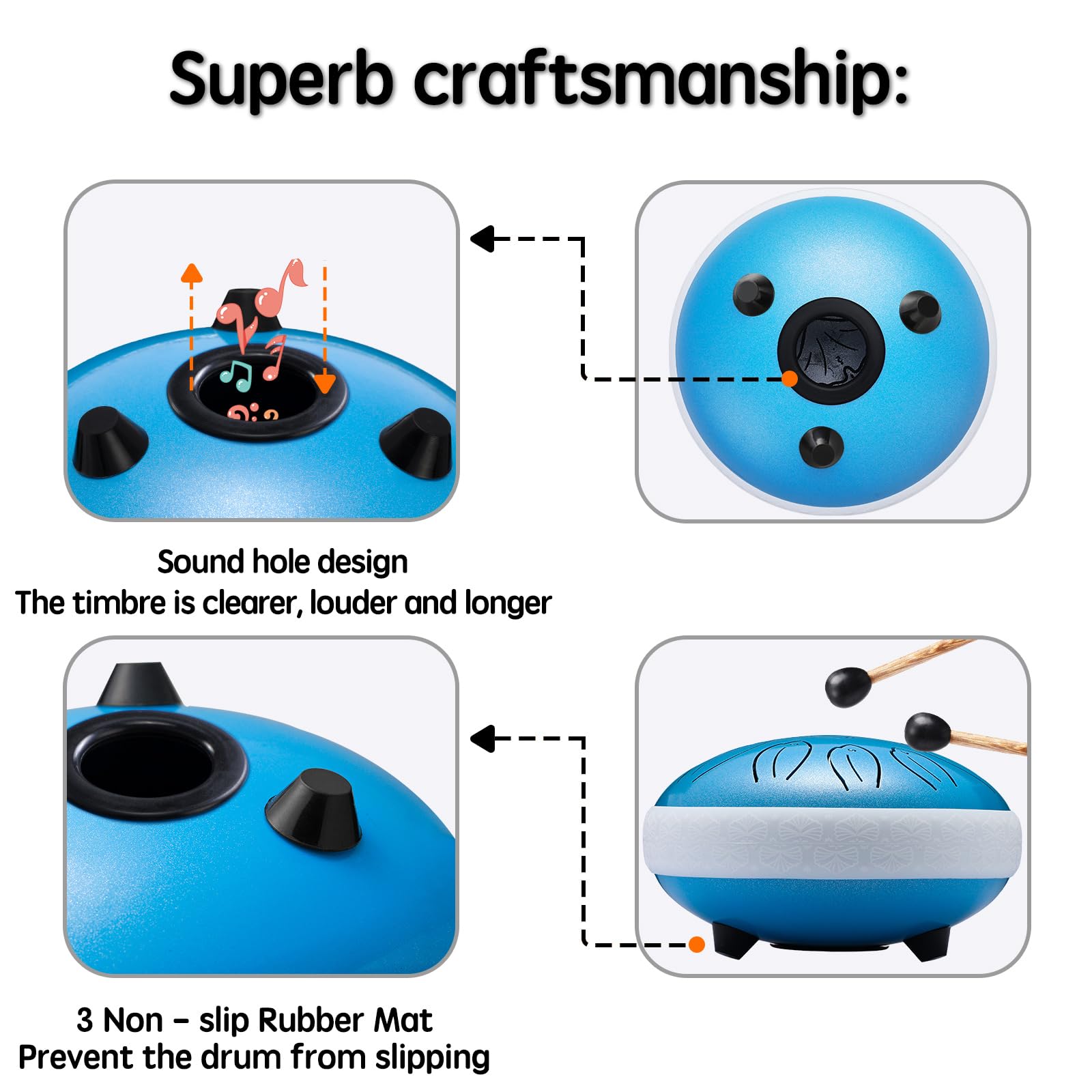 ๐ Accessories Upgrade: 6 inch steel drum, drum mallets, drum bag, finger plectrums, spare note stickers, sheet music, mallets stand. Steel drum are a total of 11 tones, which have a wider range of sound and can play more music. You can play steel drum with the included drum mallets or with you hands, and the included note enable beginners to learn and play it more easily. Steel drum comes with a carry-on bag for easy carryinag