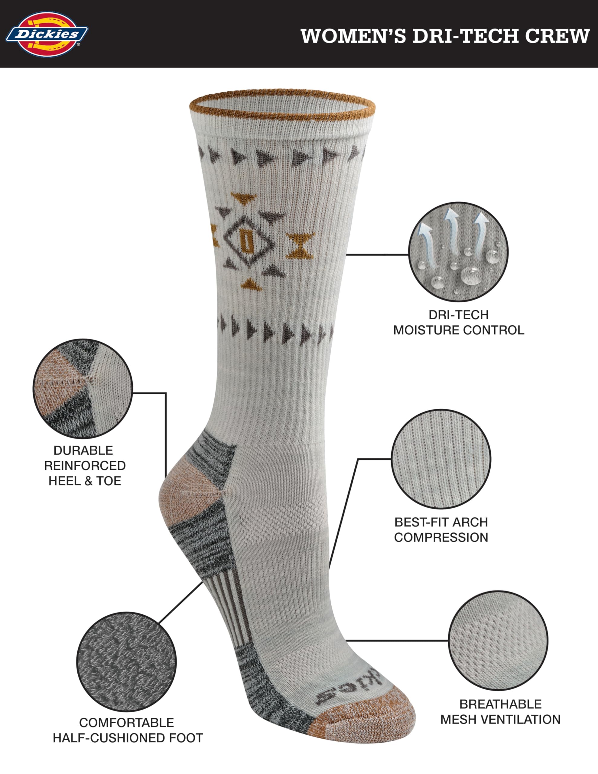 Description Dickies dri-tech moisture control for women's crew socks combines moisture wicking fibers and mesh ventilation channels to keep feet dry and comfortable. Since 1922 Dickies has been making hard-duty work products built to stand up to whatever life throws at you. Dickies Work Socks are built with purpose to deliver superior comfort and performance on and off the job. Dri-tech Moisture Control Sock Collection features: Moisture Management to help keep your feet cool, dry, and comfortable throughout the day.