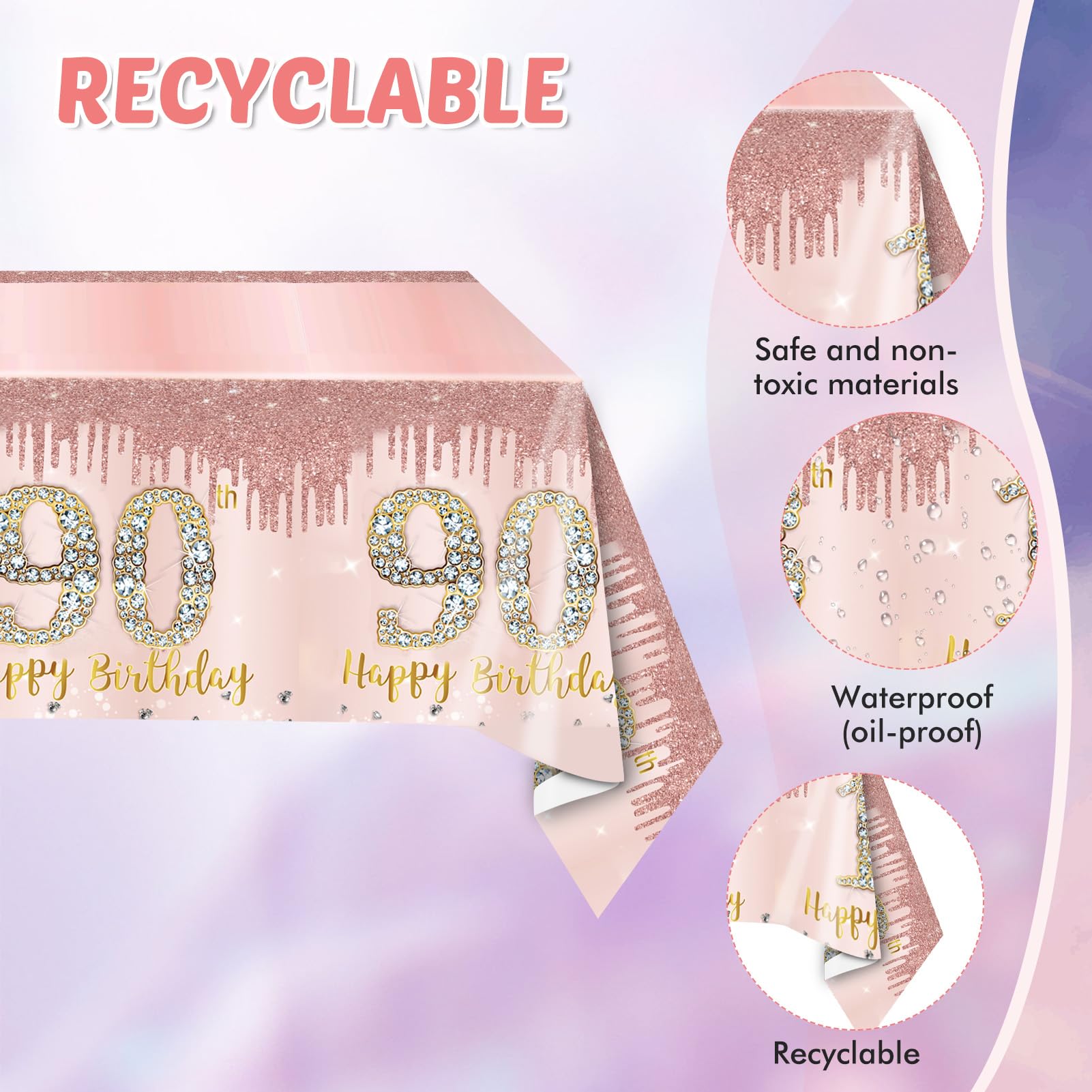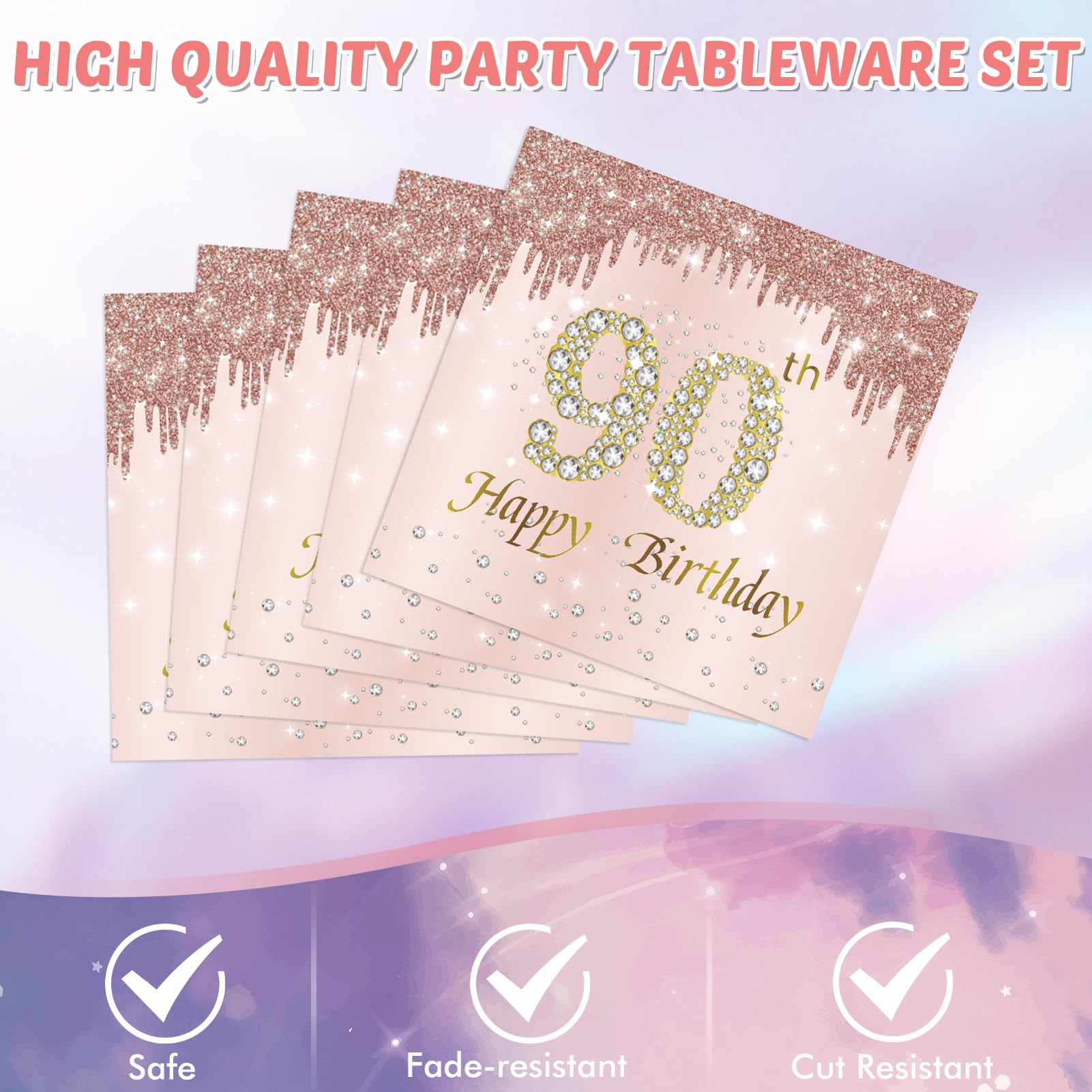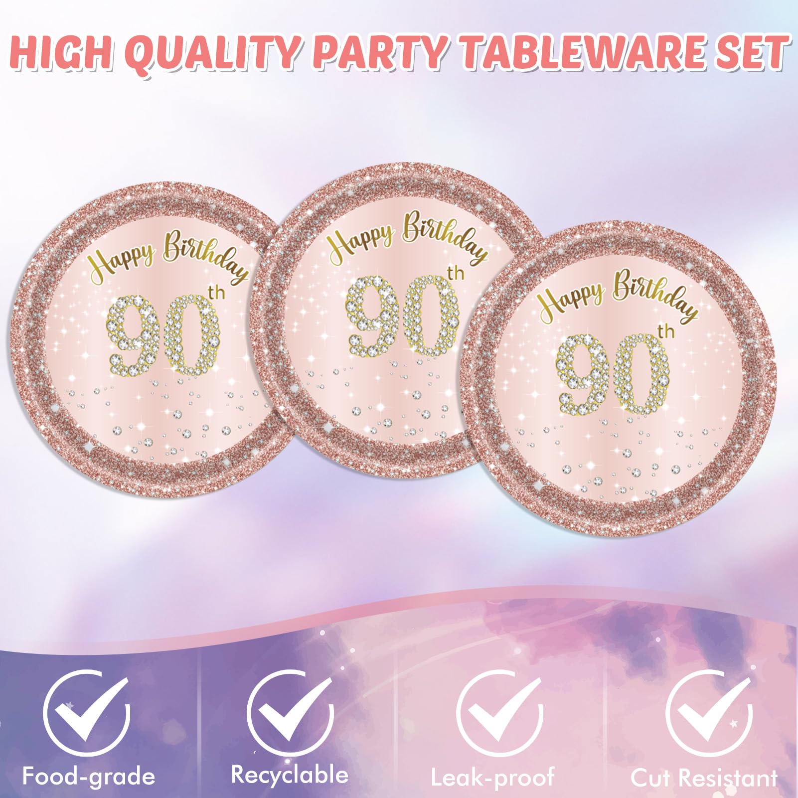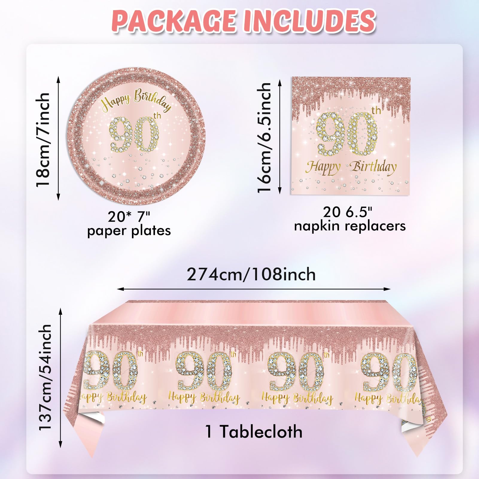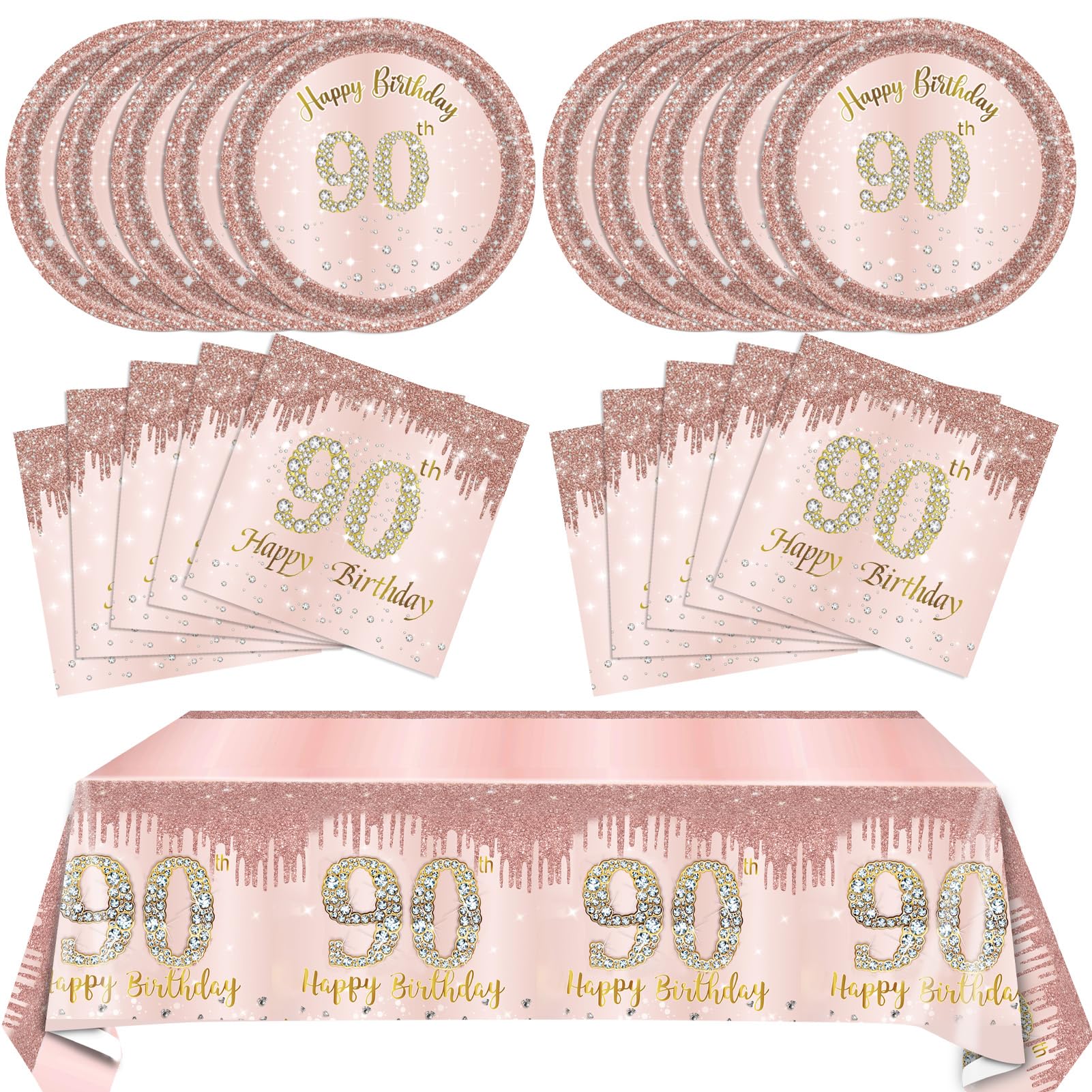 Package Includes: Rose gold 90th birthday supplies include 20PCS 90th birthday plates,20PCS 90th birthday napkins,1PCS 90th birthday tablecloth.Gifts for 90 year old woman is enough quantity for you to organize a very perfect birthday party.