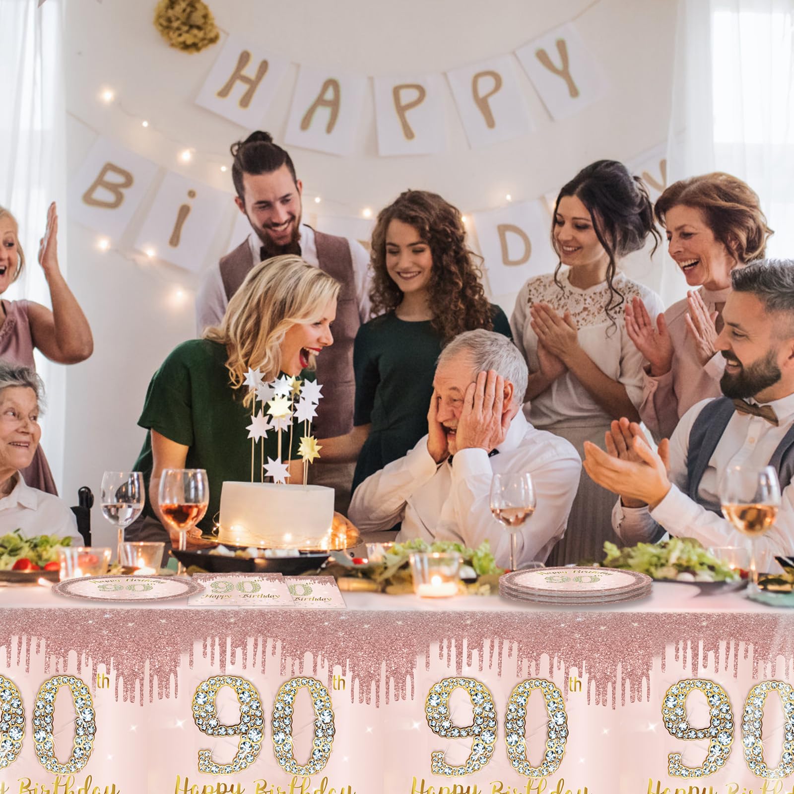 Exquisite Design: Birthday party decorations for women are in rose gold as the theme color, fashionable and romantic, delicate and elegant, perfect for women with good taste. In the center is the eye-catching "Happy 90th Birthday" below embellished with beautiful white diamond elements.This happy 90th birthday will amaze everyone!