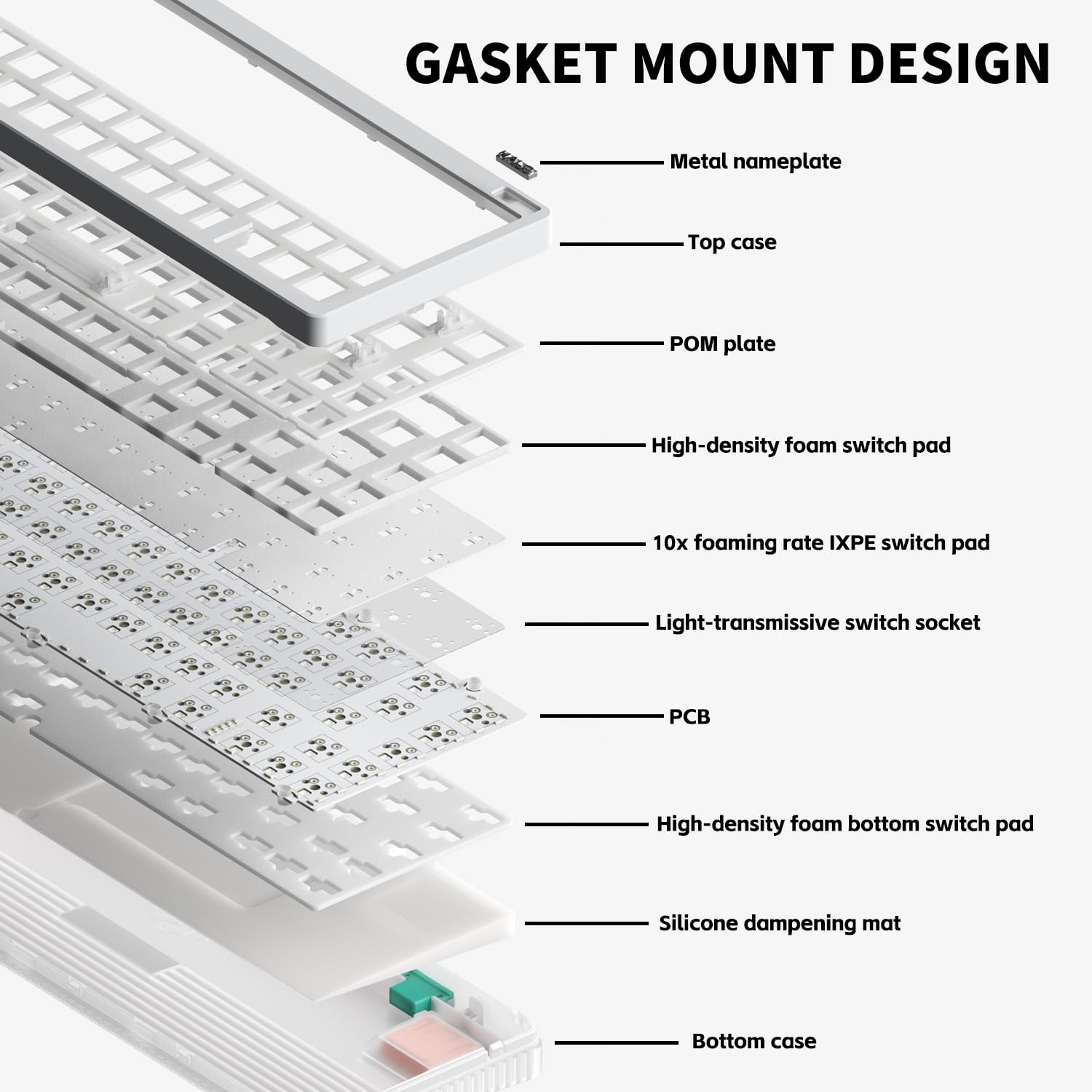Gasket-Mount Design: Halo65 V2 mechanical keyboard features a gasket-mounted structure, where the plate and PCB are suspended with soft dampeners. This design creates subtle flex for a bouncier, more consistent typing feel while reducing vibrations and noise for a quieter experience.