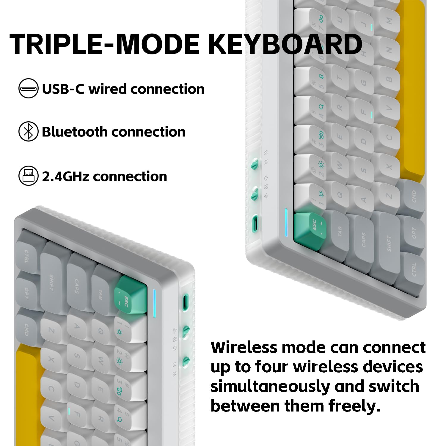 Three Connection Modes: Halo65 V2 wireless keyboard supports Bluetooth, 2.4GHz, and USB-C connectivity modes. It can connect to up to four wireless devices simultaneously and allows seamless, quick switching between them, saving you valuable time.