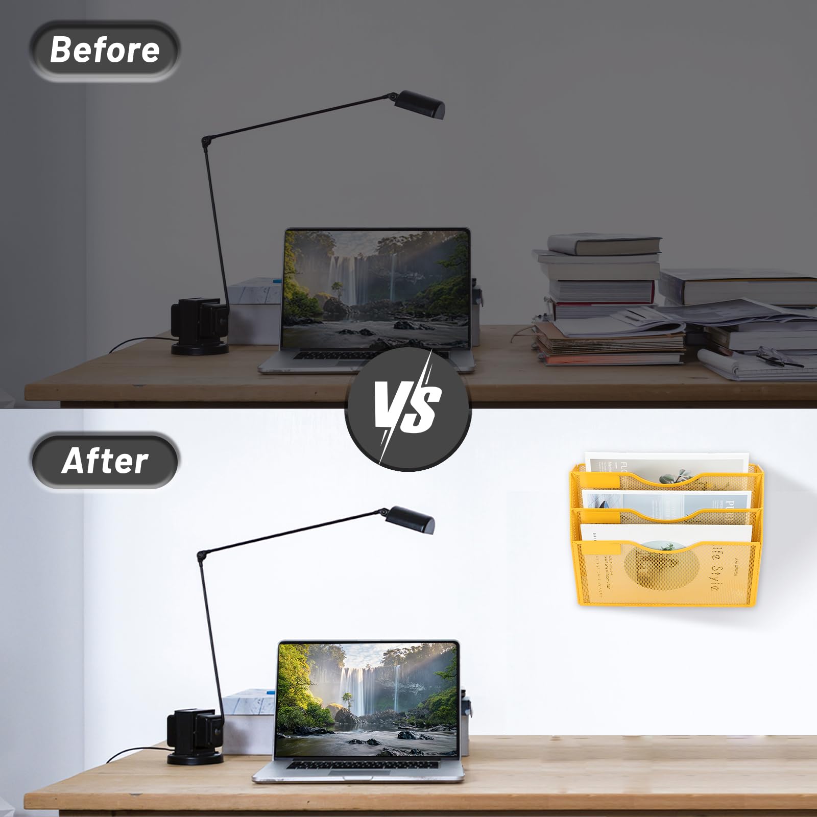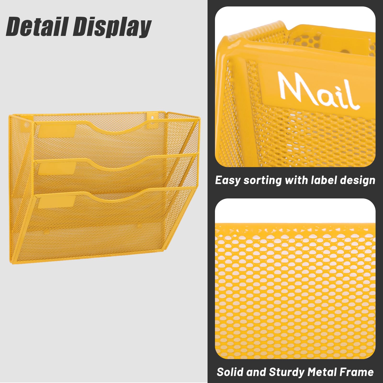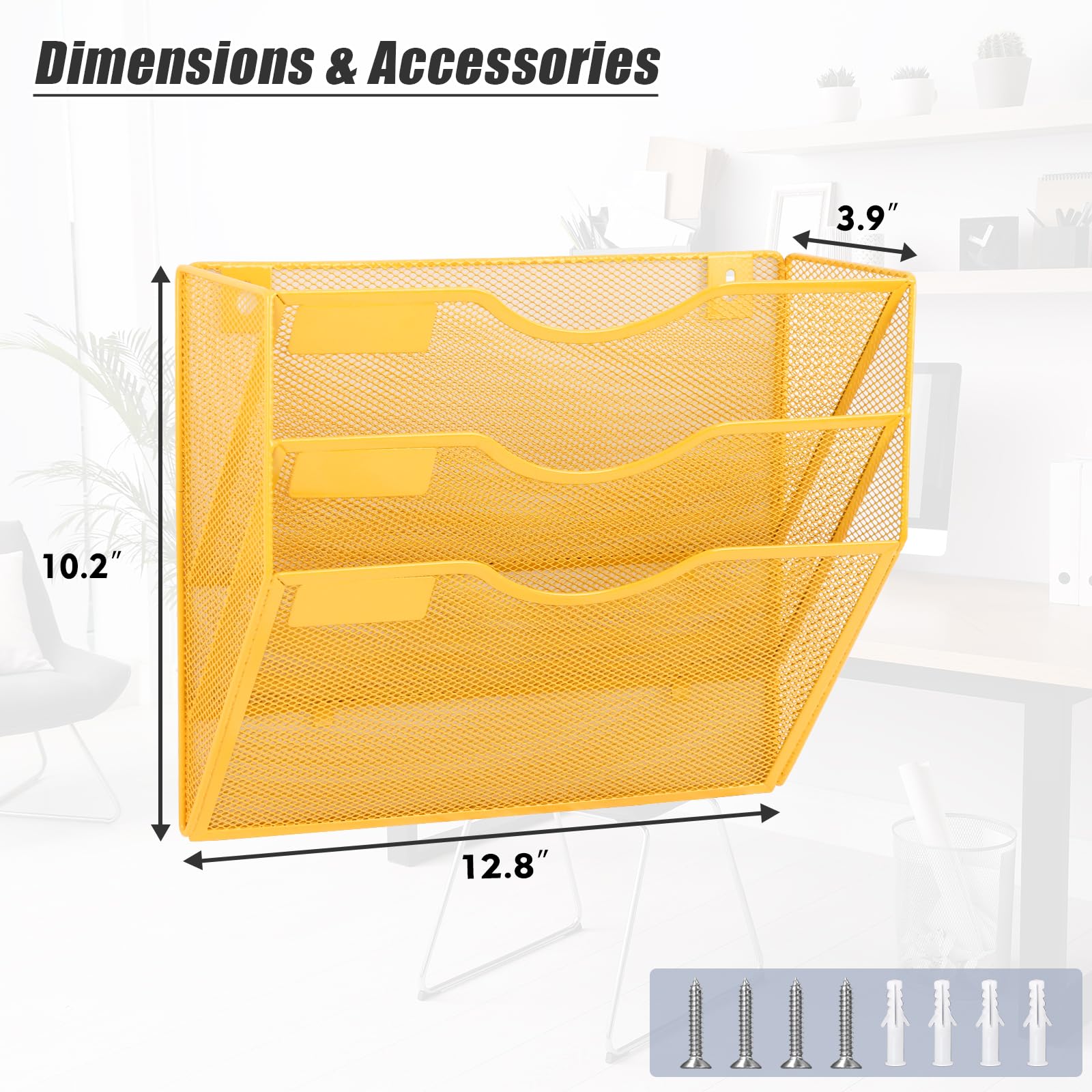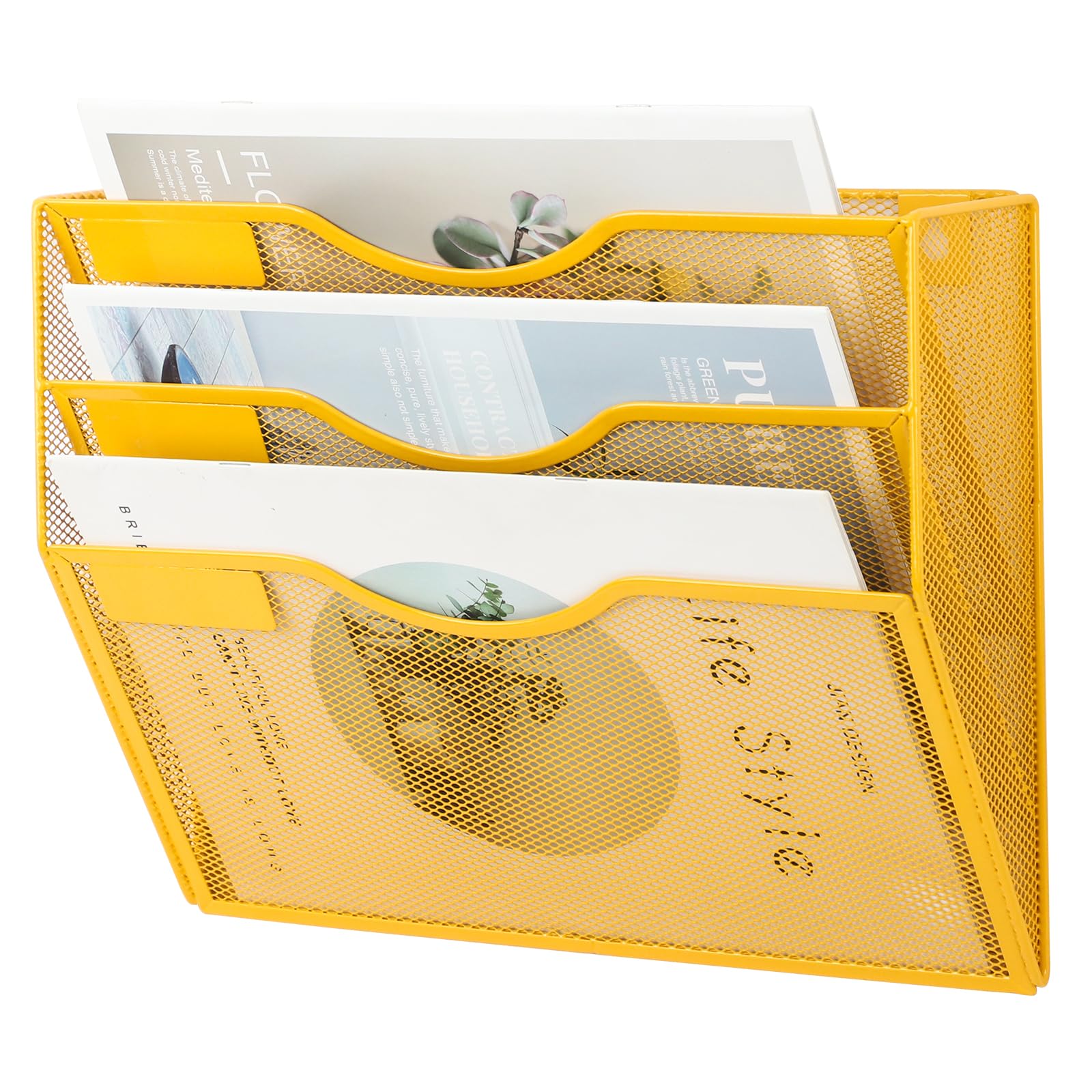 EASEPRES 3 Pockets Wall File Holder Organizer Hanging Magazine Rack, Yellow/b> Organizer Your Files Get your papers, mail and stationery items in order by filing them tidily in our vertical mounted wall file holder. The stylish mesh arched design allows easy access to files and retrieval. Space Saving Separate your files and papers into 3 stacked tray levels with label panels allow for labeling contents of each slot so you know where all of your important paperwork and spare paper is stored. Each compartment can take letter paper sizes which is ideal for busy offices and work environments. Use our wall mount mail holder for letters, files, forms and worksheets.
