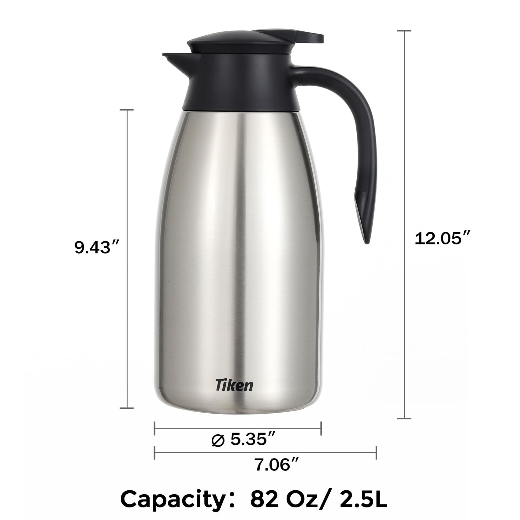 This coffee carafe has a capacity of 85 Oz(2.5L). Tiken vacuum insulation technology locks in temperature to preserve flavour and freshness, that keeps the temperature above 173.7°F at 12 hrs (assuming a starting temperature of 203°F, a room temperature of 68 °F and water left untouched throughout the duration of the test). Pls note test results will vary depending on beverage starting temperature and how full the carafe is.