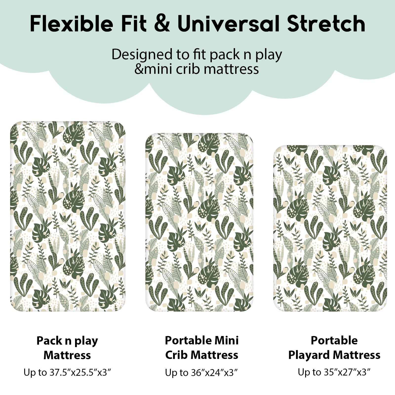 PERFECT FIT: Measured 38”X 26”, our mini crib sheets for playard can snug fit most pack n play mattresses, portable play pens, and mini crib mattresses. 5'' deep pocket provides a safe and secure 360 degree coverage and protection for your luxury mattress.