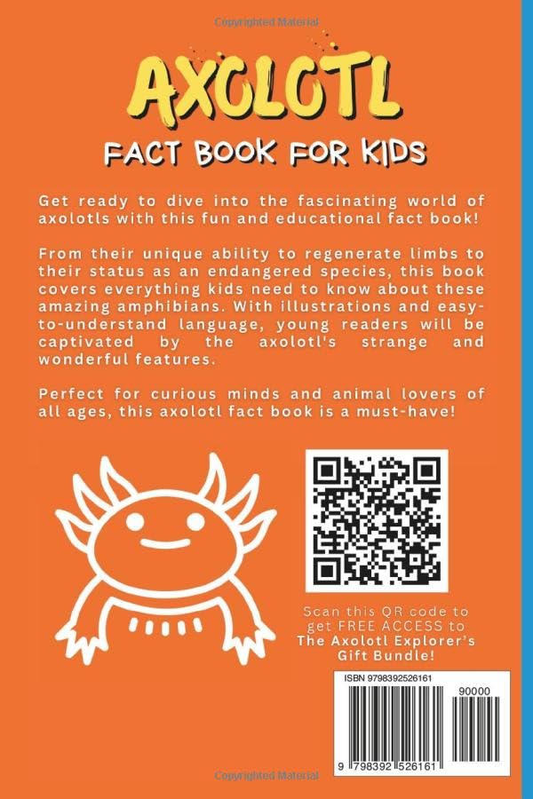 THE PERFECT GIFT FOR PET OWNERS AND AXOLOTL FANS! With this book, kids will uncover amazing facts about the coolest amphibian around! From their unique physical features to their quirky behaviors, this fact-packed guide will captivate young readers who love the weird but true. In Axolotl Facts for Kids, you will: Dive into the fascinating world of axolotls: Delve into the weird but wonderful secrets of these unique creatures from the comfort of your living room couch. Creating the perfect home: From the murky waters of the great Lake Xochimilco to the comfort of your own home, learn how to provide the perfect environment for your axolotl. Get up close and personal: Understand the behavior and communication of your axolotl, and learn how to interact at a personal level like never before. Keep them healthy: Master the art of breeding and keeping your axolotl healthy (avoid diseases!) with expert tips and advice. A well-fed axolotl is a happy axolotl: Master feeding your axolotl. Their diet is as varied as a shark diet but without the dangerous bite! Experience the fun: Uncover a range of fun and educational activities for kids, including coloring pages, word searches, and step-by-step drawing guides. Easy to understand language: You don't have to be a bookworm to enjoy this book. Uncover axolotl myths, legends and much more in easy to understand language! So come on, let's take a journey through the watery world of the axolotl and discover things you never knew! Click 'add to cart' button and get a copy of this book today!