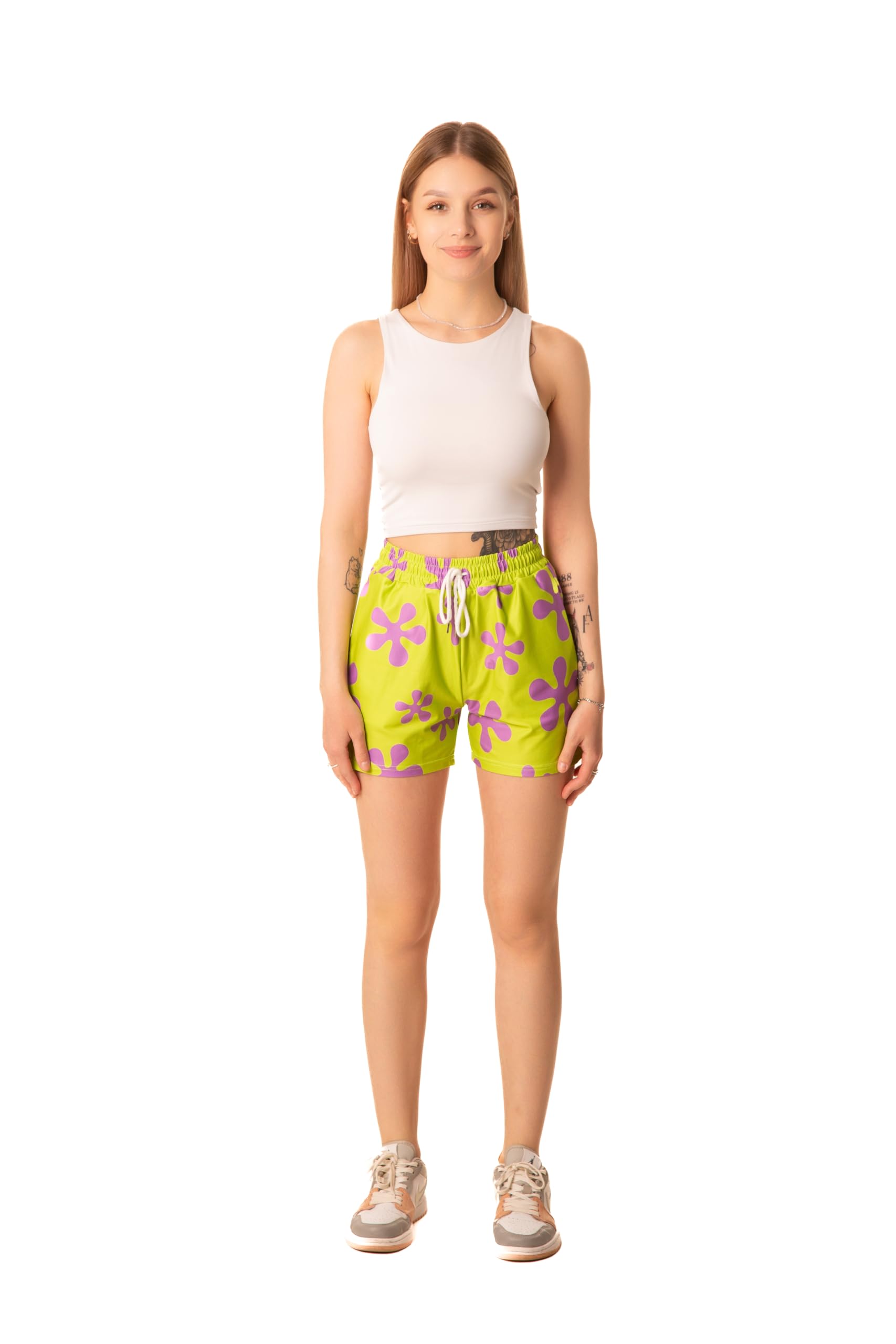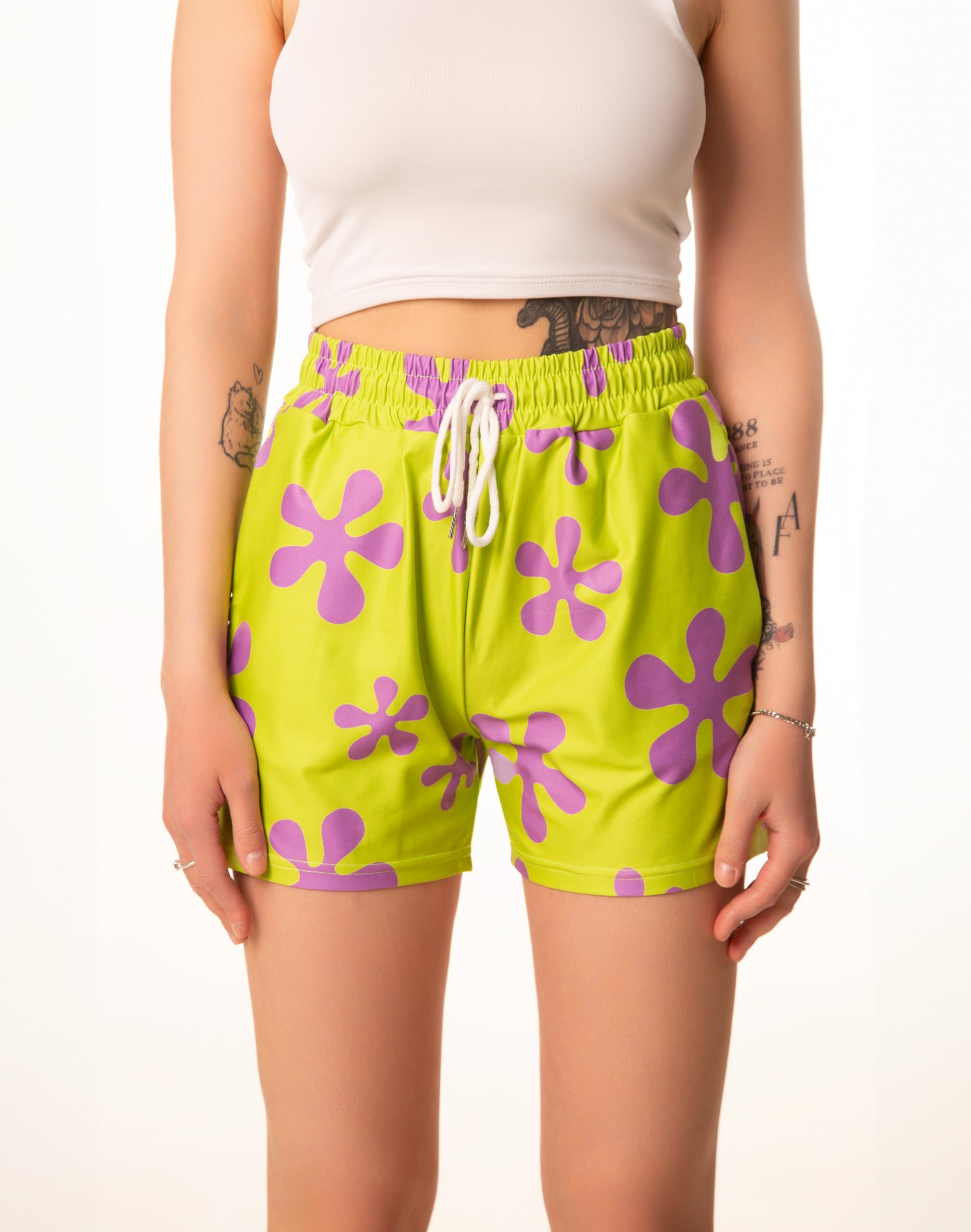 DESIGN: This features a vibrant green shorts with purple print accents. Search B0CZHJ73TF for a matching mens shorts