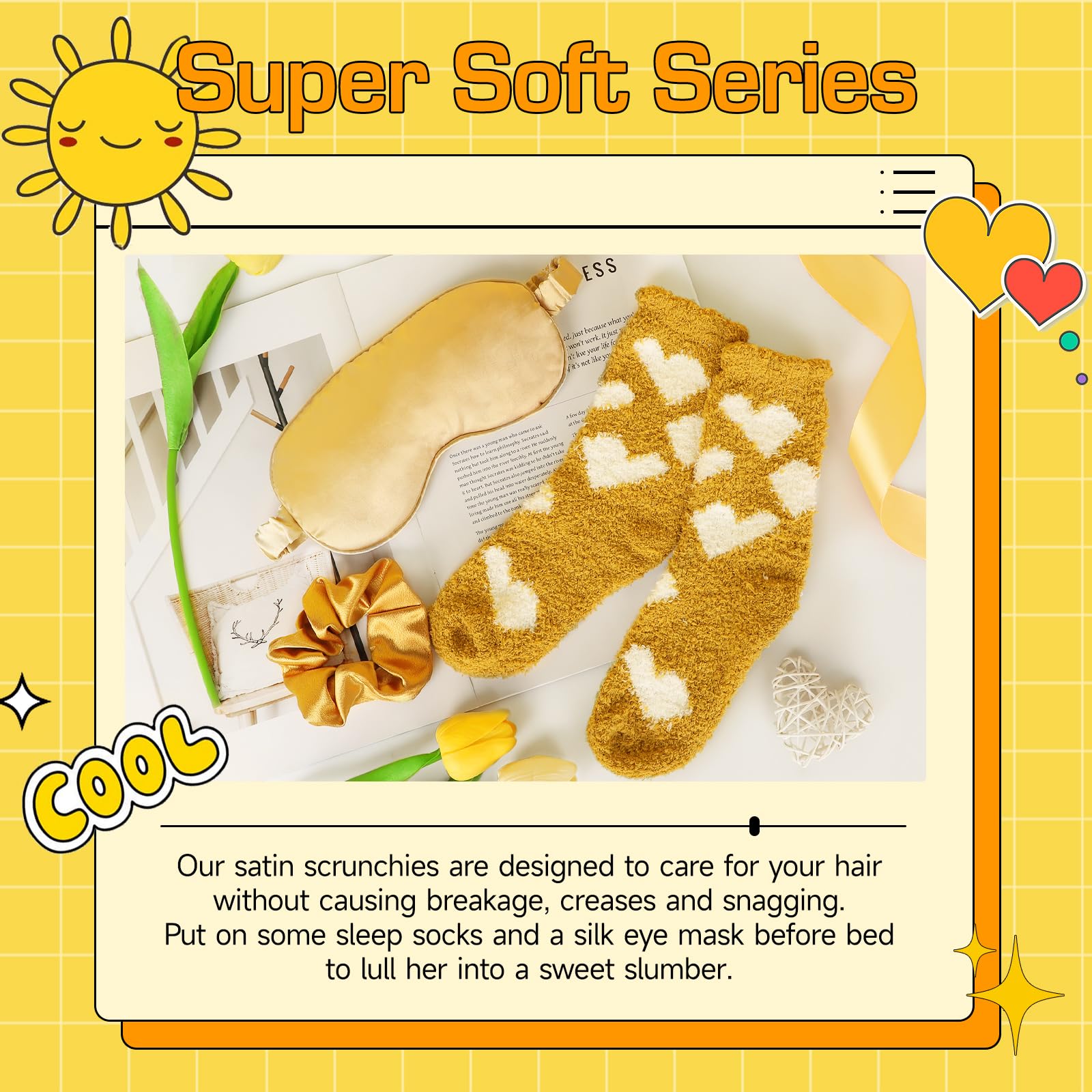 【SENDING SUNSHINE】Our sunshine care package are filled with bright, colorful items that that are fun yet also high quality, including: (1)20 oz Insulated Wine Tumbler | (2)Silk Eye Mask | (3)Fuzzy Socks | (4)Sunshine Stress Ball | (5)Elastic Hair Scrunchy | (6)Sunflower Inspirational Keychain | (7)7oz Blue Wind Chime Scented Candle | (8)Bath Bomb | (9)Oatmeal Soap Bar | (10)Sending Sunshine Card.