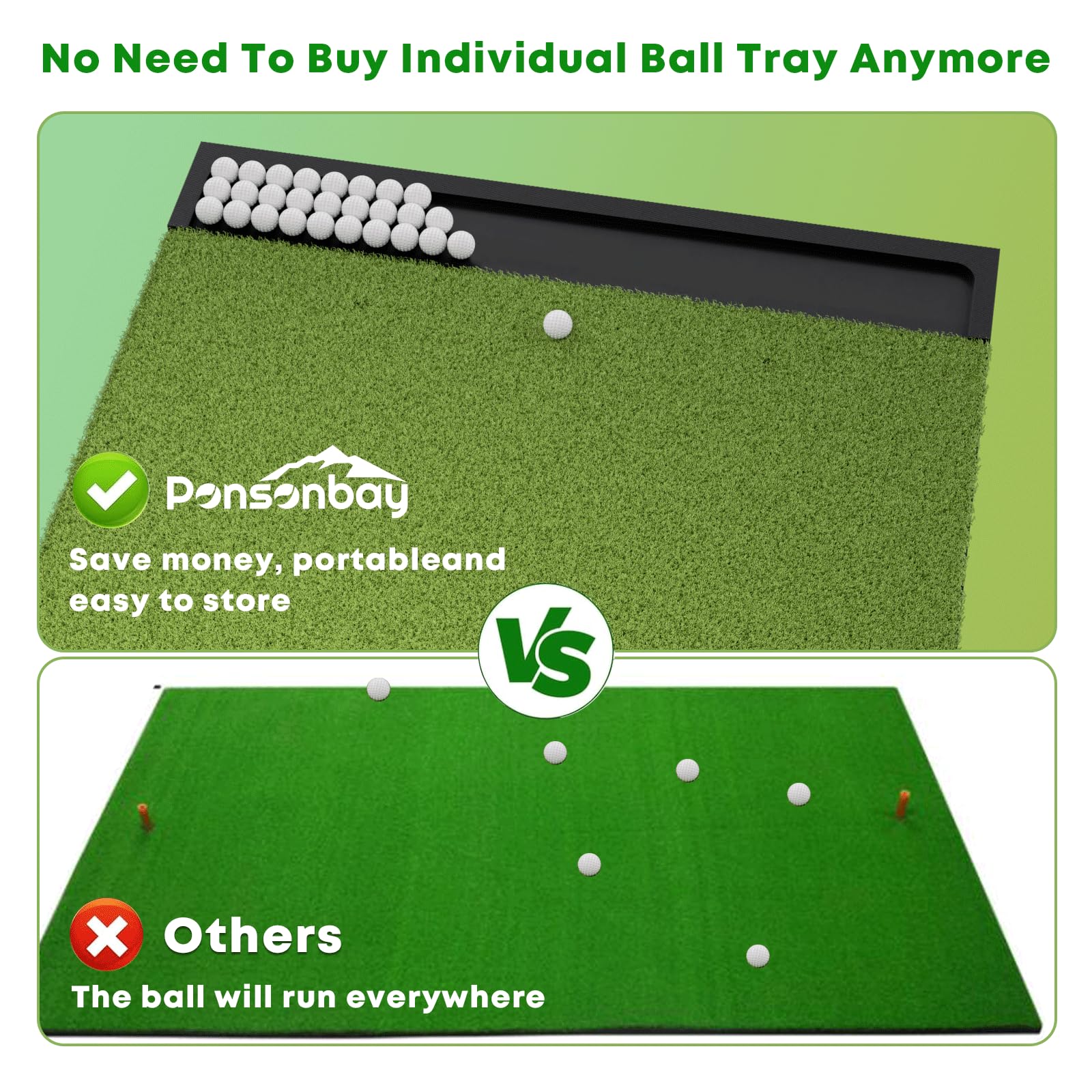 Exclusive Patent: Ponsonbay 5 x 4 ft & 6 x 4 ft integrated golf hitting mat with ball tray is more affordable it eliminates the hassle of buying and carrying an additional ball tray. The one-piece design is easy to carry, roll up, and unfold, allowing for enjoyable golf practice