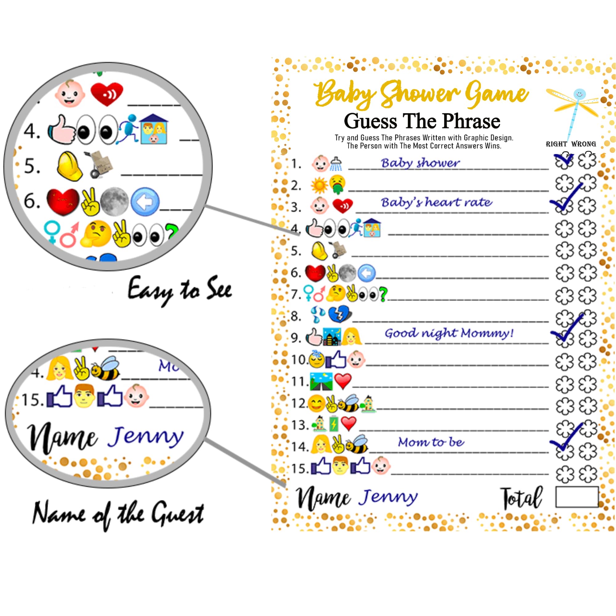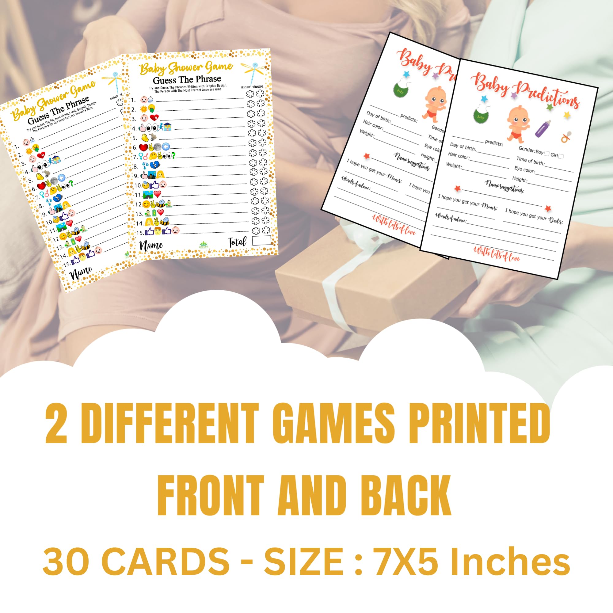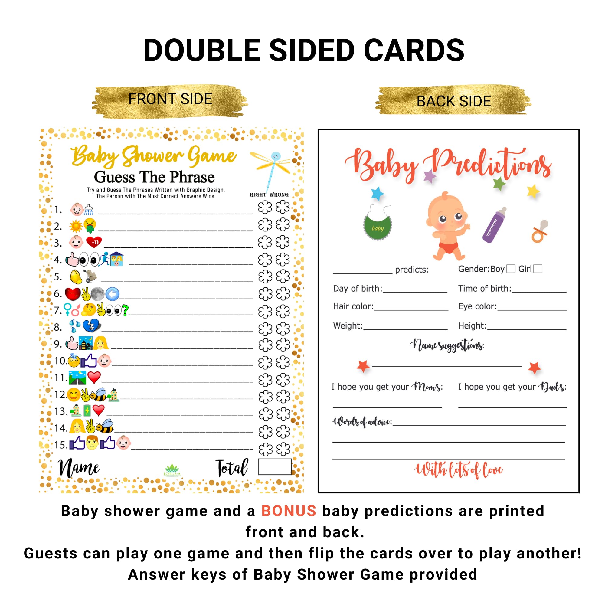 In this game, Players are given a list of baby shower-related words represented by graphic design icons, and they answer on a card as many correct answers as they can. The player who the most accurately predicts correct answers wins a prize.