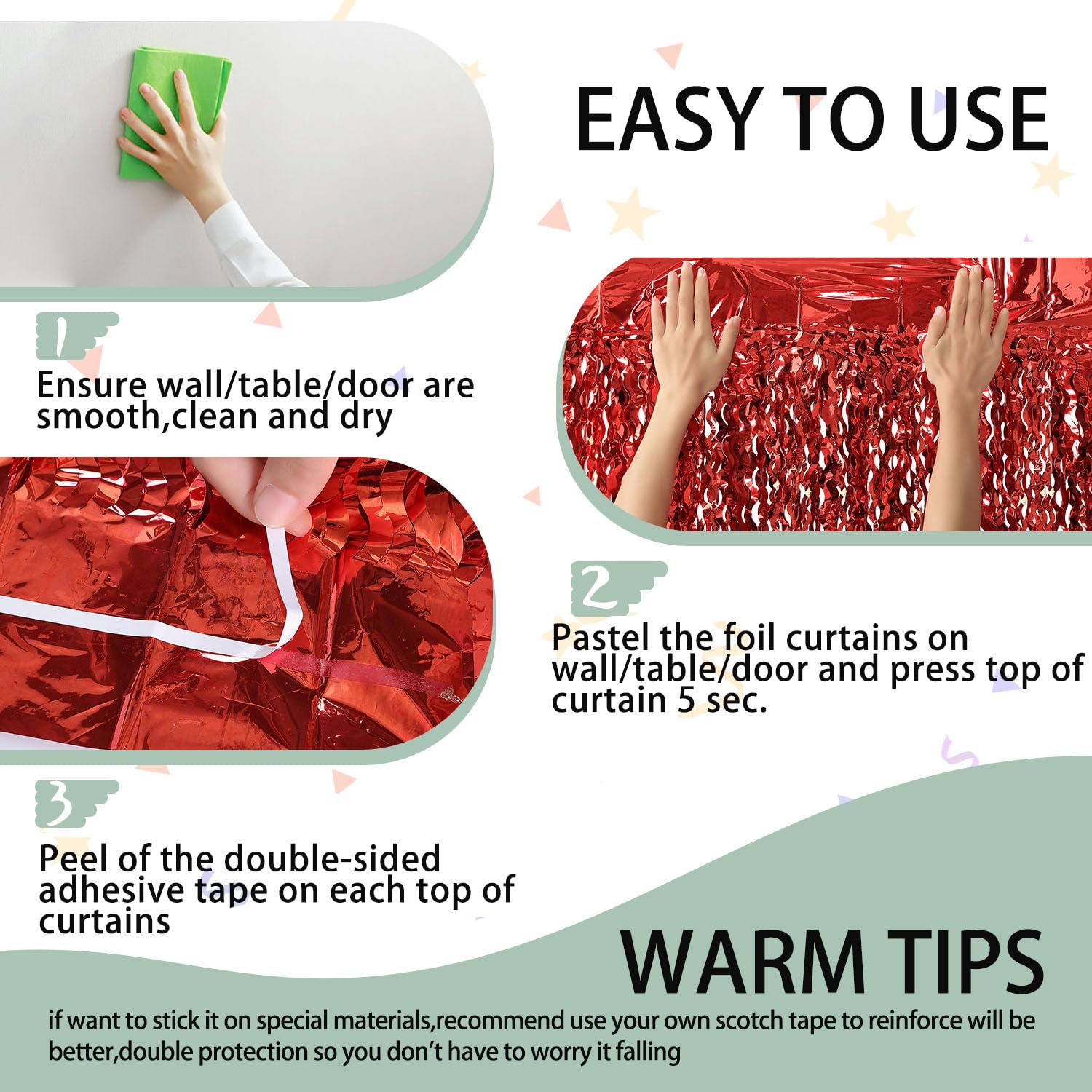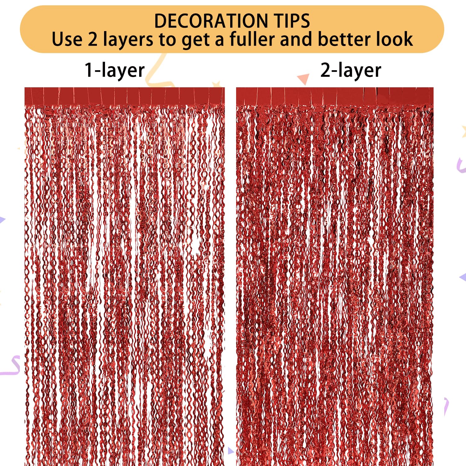 TIPS: 1 You also can use your own tapes to make the fringe stick sturdy 2 You can cut the tinsel by scissors into the suitable length and width for your party use 3pcs of the curtains side by side to make the backdrop larger, or layer the 2 pack curtains to achieve a thicker and denser effect