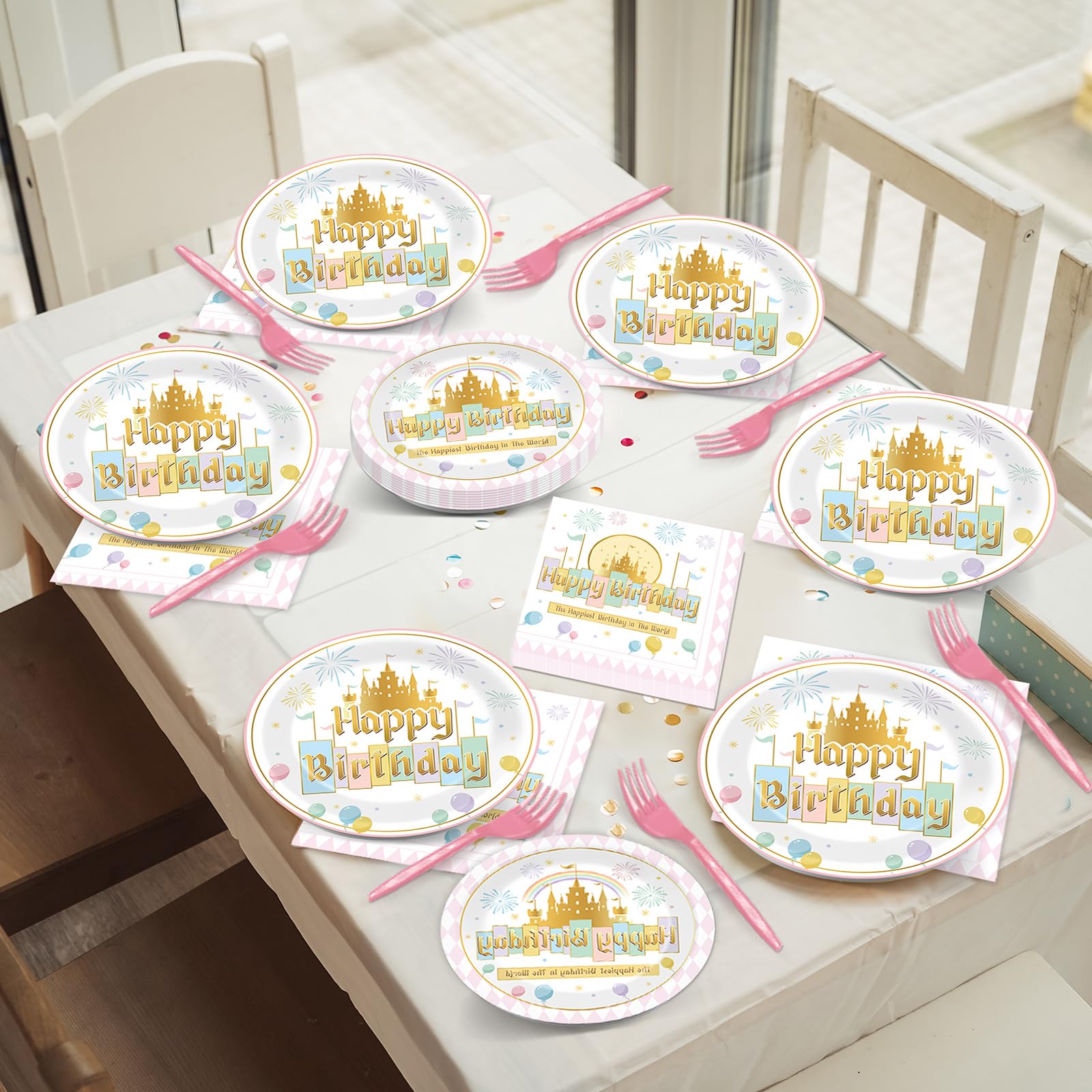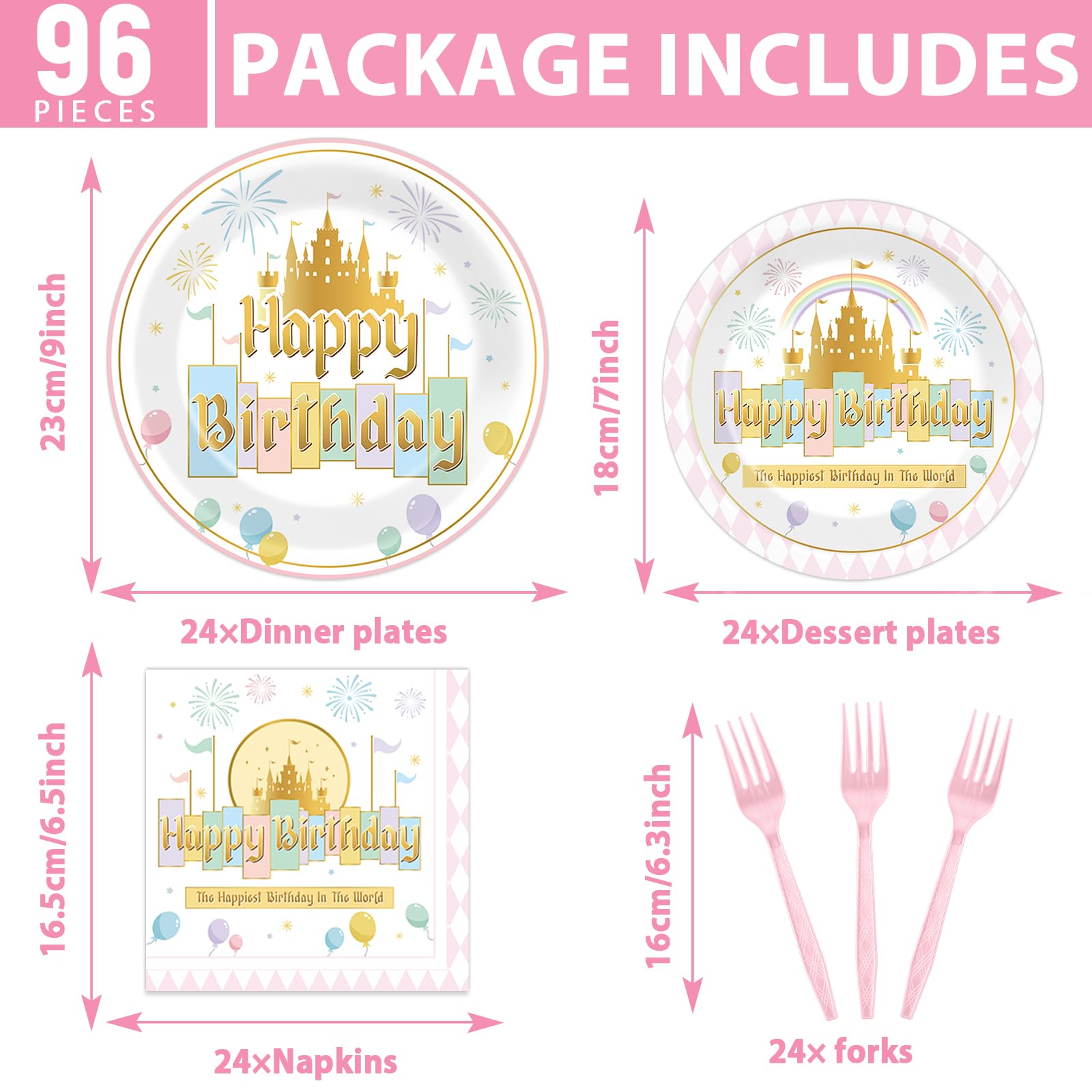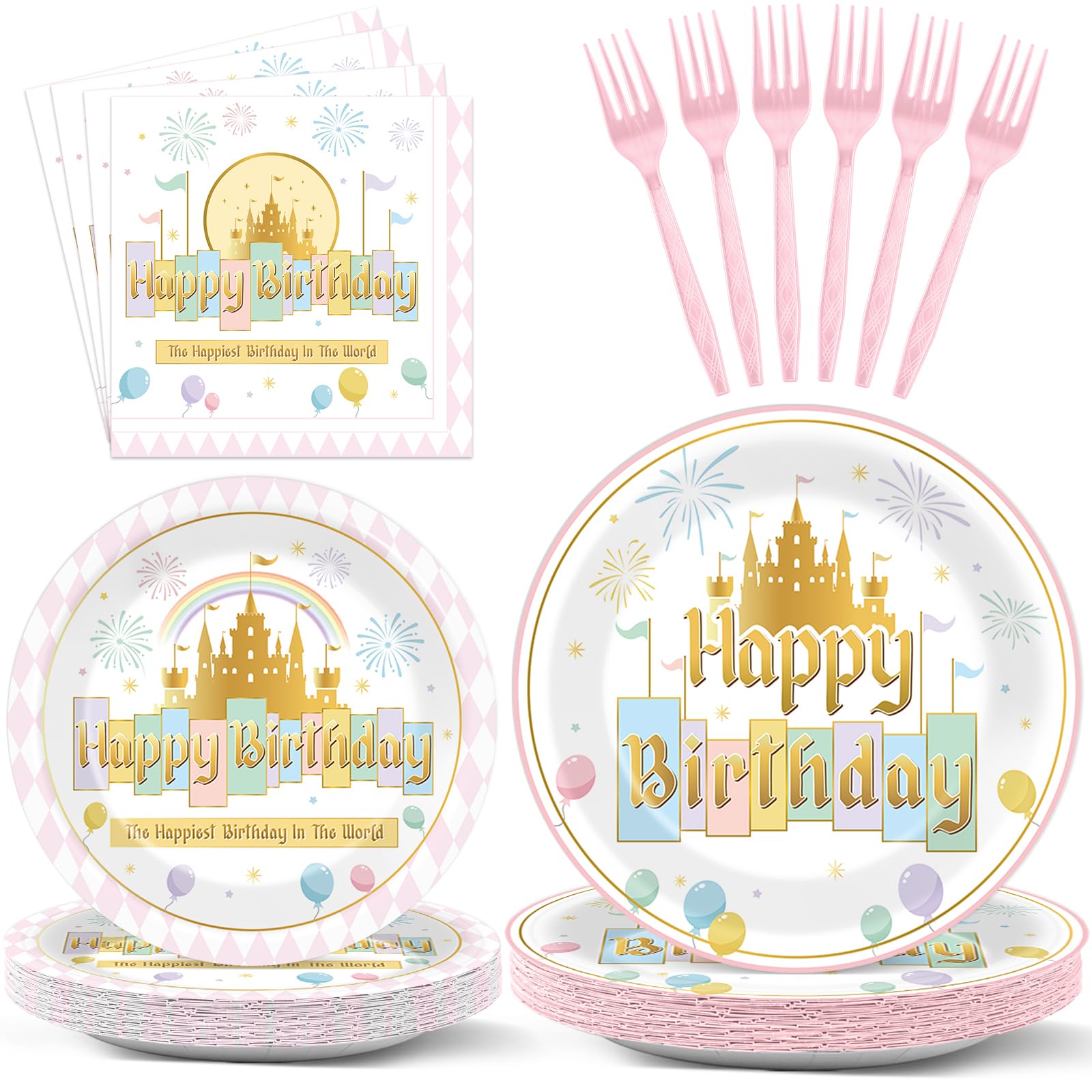 Package Includes: This comprehensive set features 24 9-inch princess castle Happiest Birthday party plates and 24 7-inch dessert plates, accompanied by 24 6.5inch pastel rainbow fairytale party napkins and 24 pink forks. All items are ready to enhance the joy of any birthday celebration.