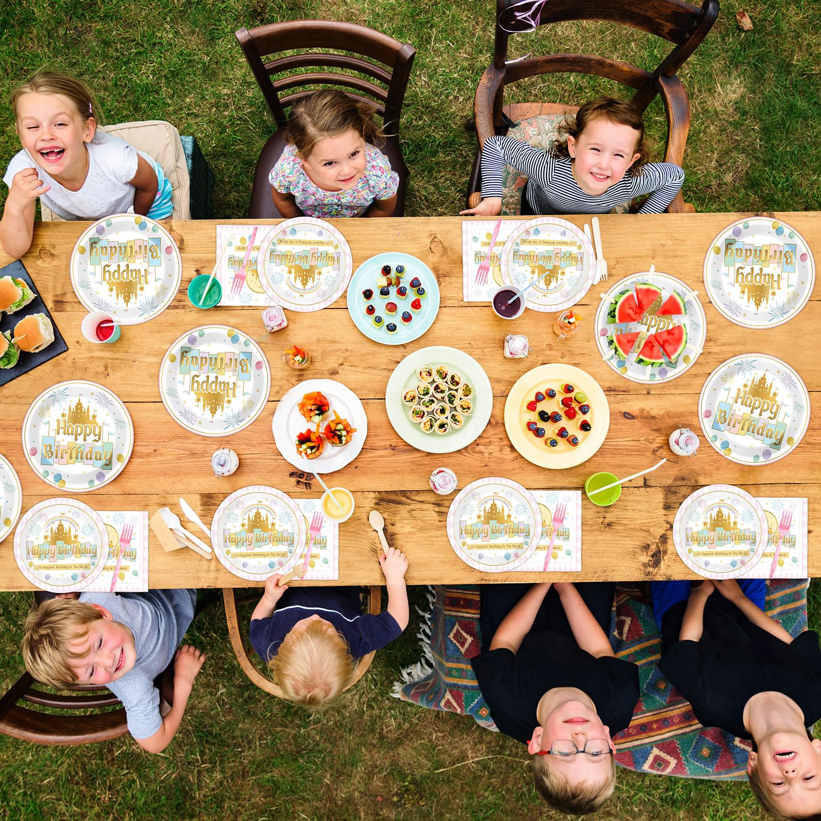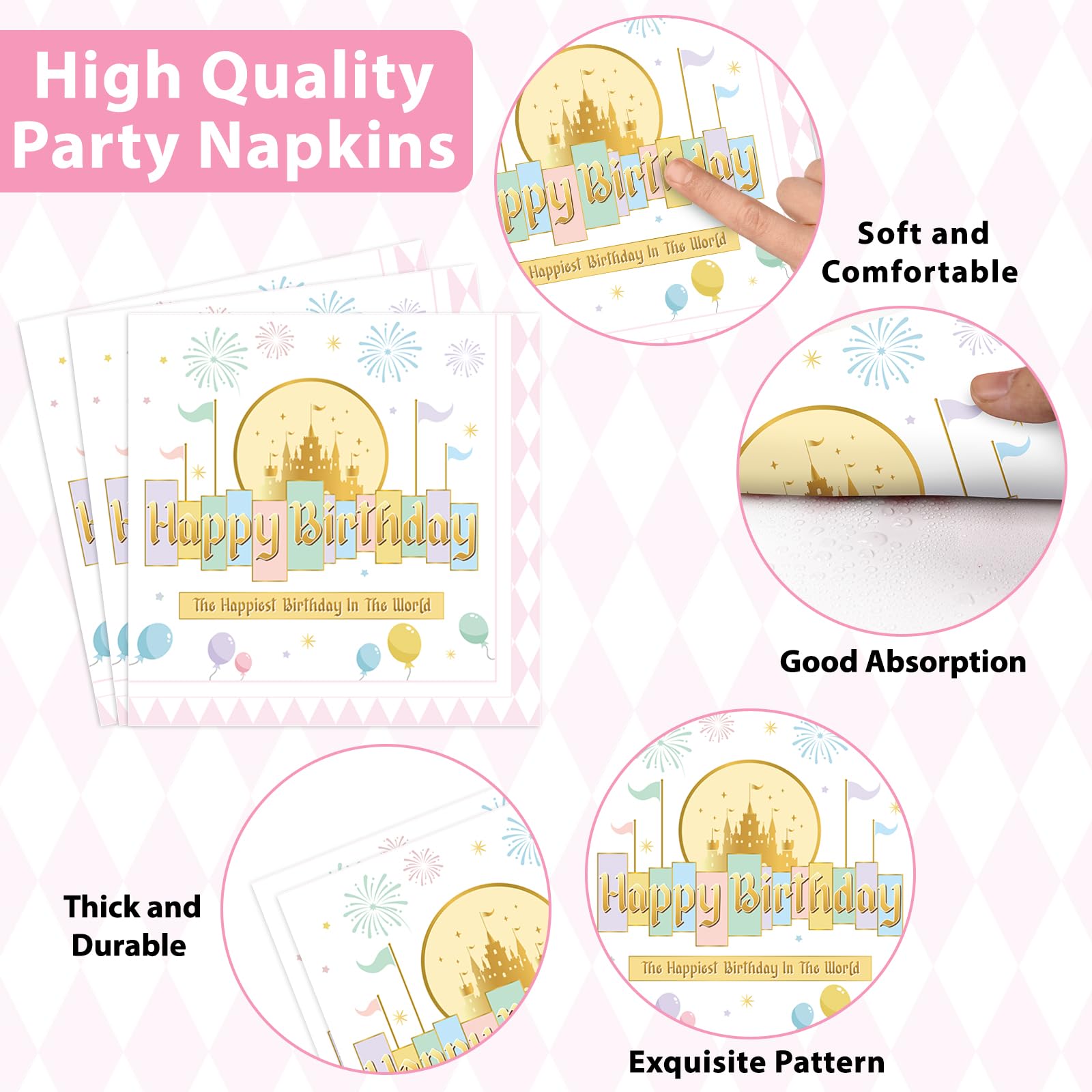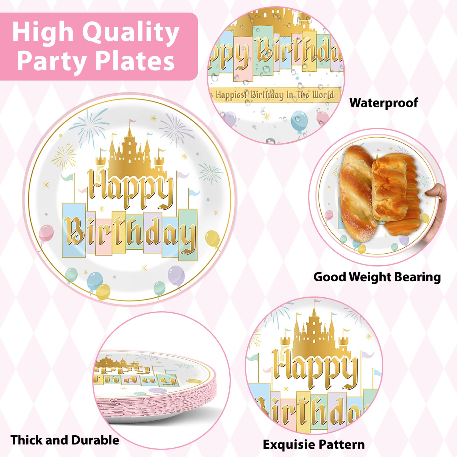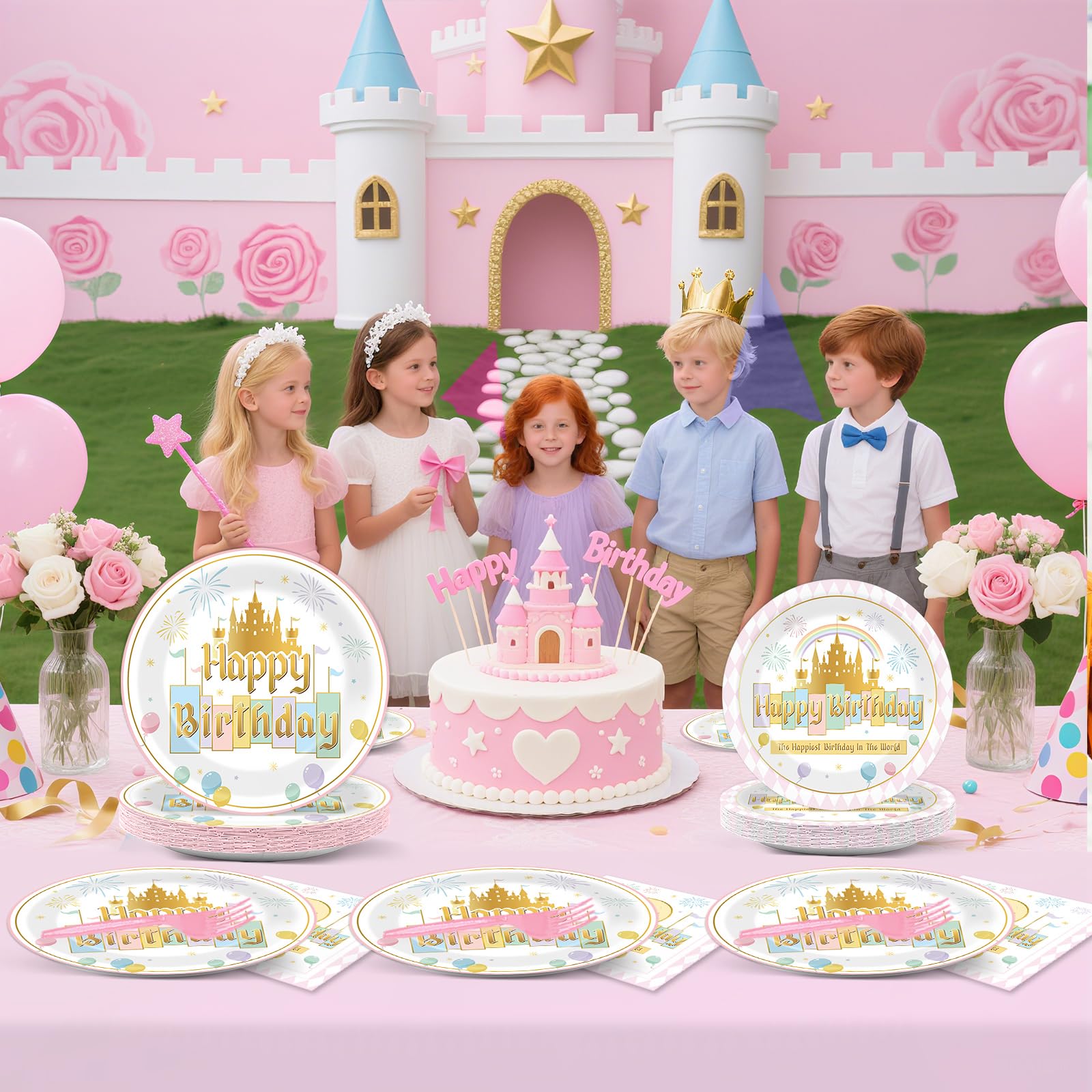 Package Includes: This comprehensive set features 24 9-inch princess castle Happiest Birthday party plates and 24 7-inch dessert plates, accompanied by 24 6.5inch pastel rainbow fairytale party napkins and 24 pink forks. All items are ready to enhance the joy of any birthday celebration.