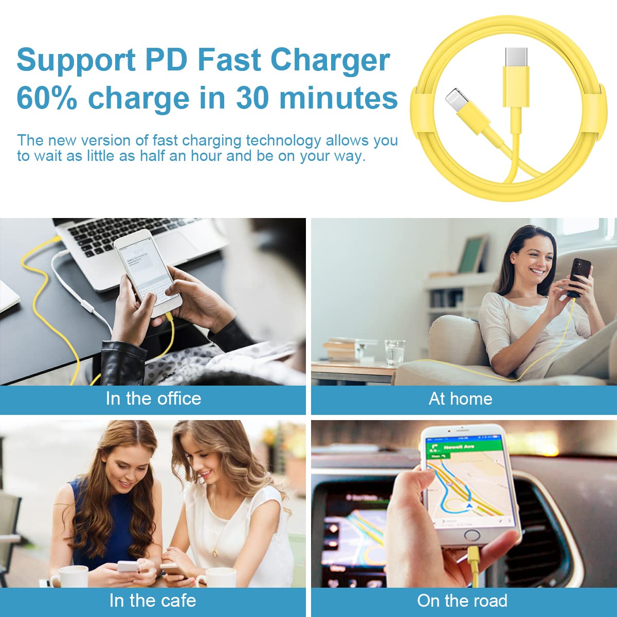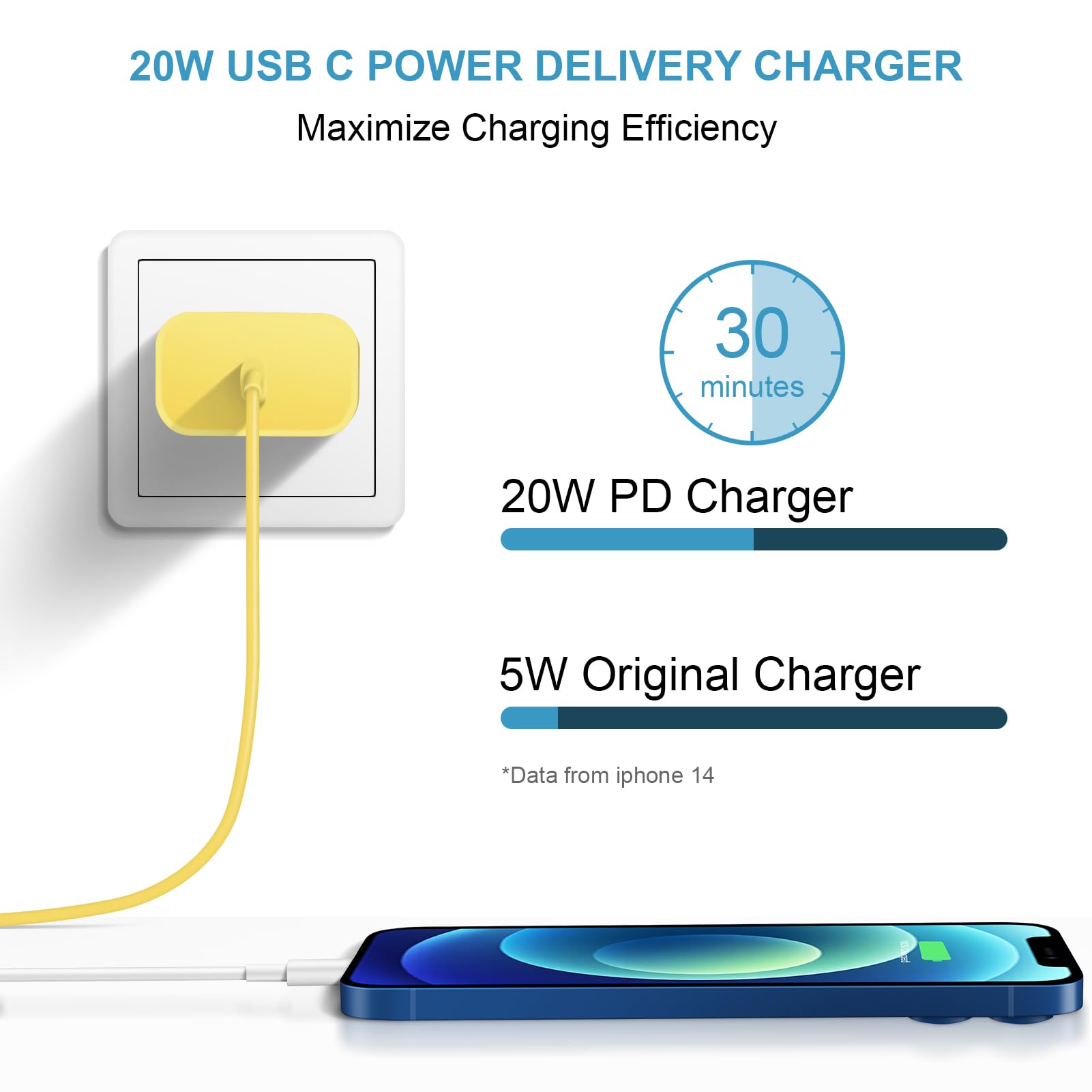 【Romitaz PD 3.0 Fast Charger for iPhone】 iPhone Fast Charger equipped with 20W PD 3.0 USB Type C power delivery wall plug, Firewire Cables PD 3.0 Quick-Charge USB C port provides Max 20W output power, charge your device up to 3x faster than original 5W charger,charging your iPhone 12 up to 50% in just 30 minutes, saving over 1.5hrs for you.