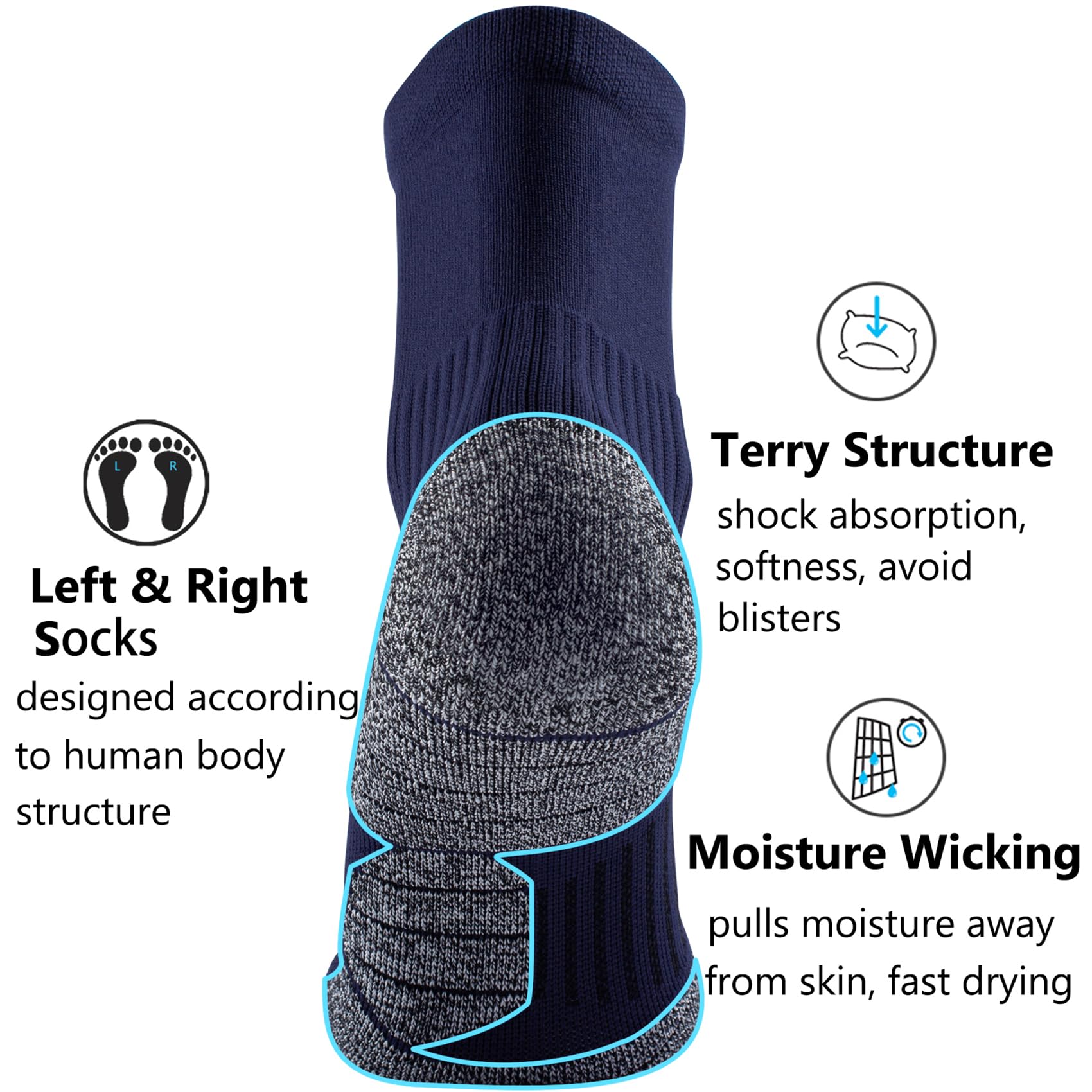 UNIQUE SOLE: Moisture wicking fibers pull moisture away from skin; Cushioned, more soft and comfy, shock absorption; Design LEFT AND RIGHT SOCKS according to the plantar structure