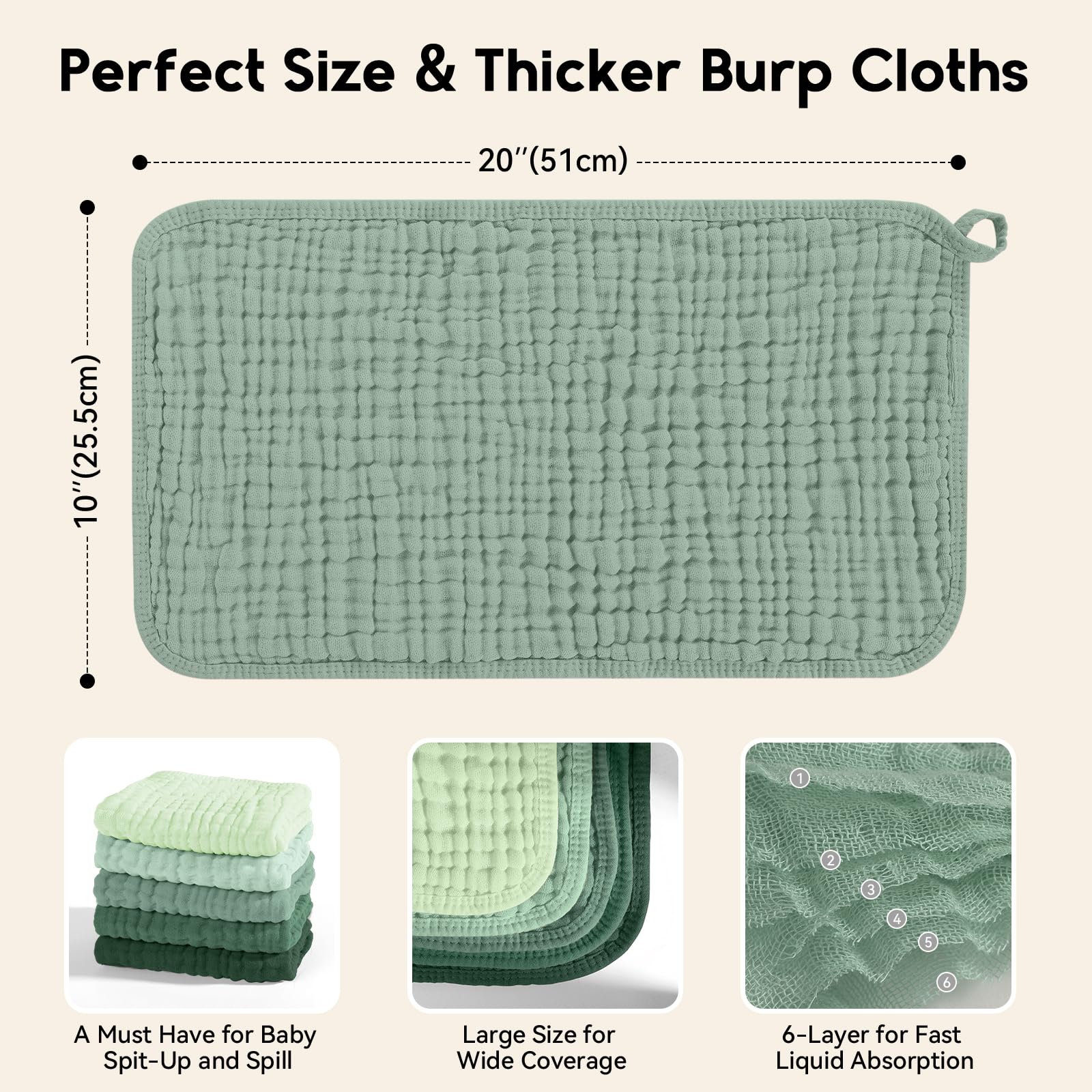 Excellent Absorbent: Featuring 6 layers of absorbent muslin and fluffy structure design, our burping cloths for babies provide maximum absorption with tendor touch, works well to protect your teething baby from all dribble and spit ups soaking their clothes. Large 20''X10'' size provides maximum coverage and extra layering adds durability, making them ideal for use in any season.