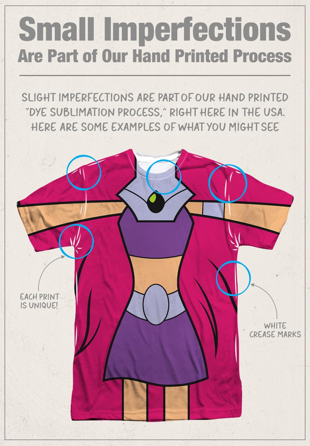 PRINTED IN USA - All our shirts are hand-printed in the USA using a dye sublimation process that creates slight imperfections over seams and/or folds that are unique to and a part of each item.