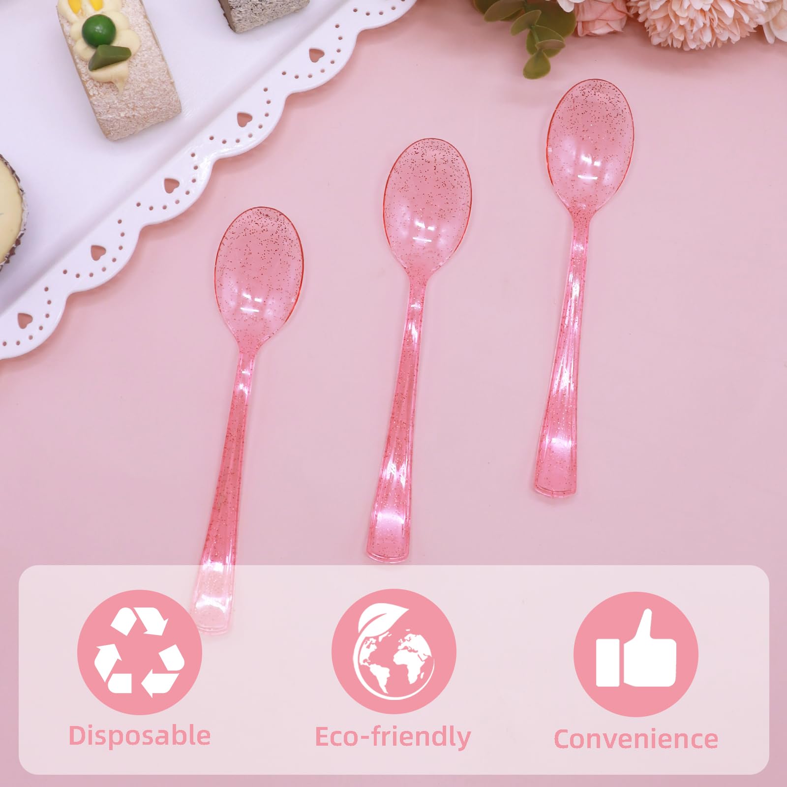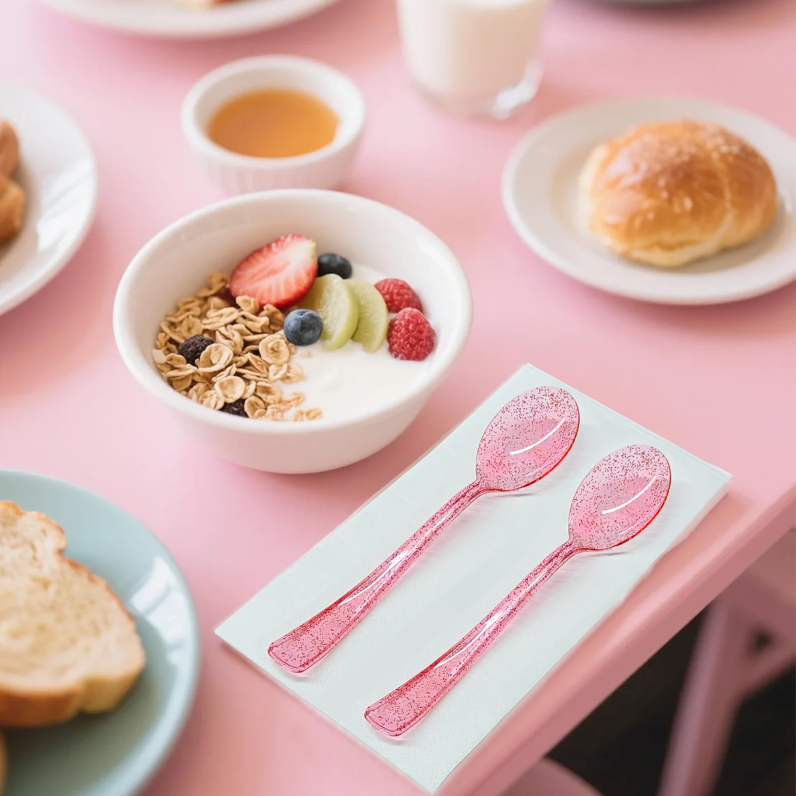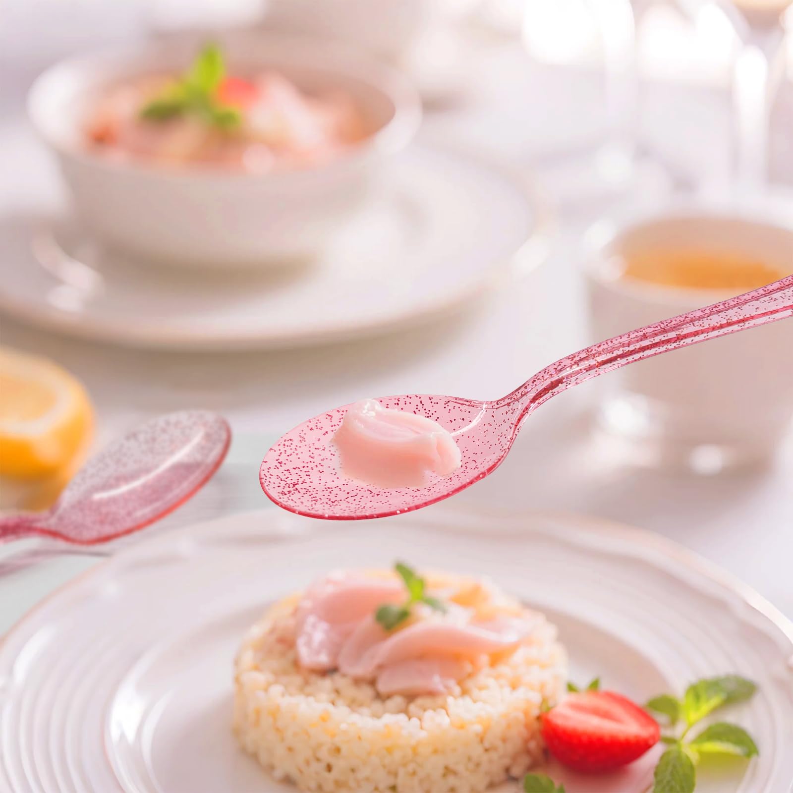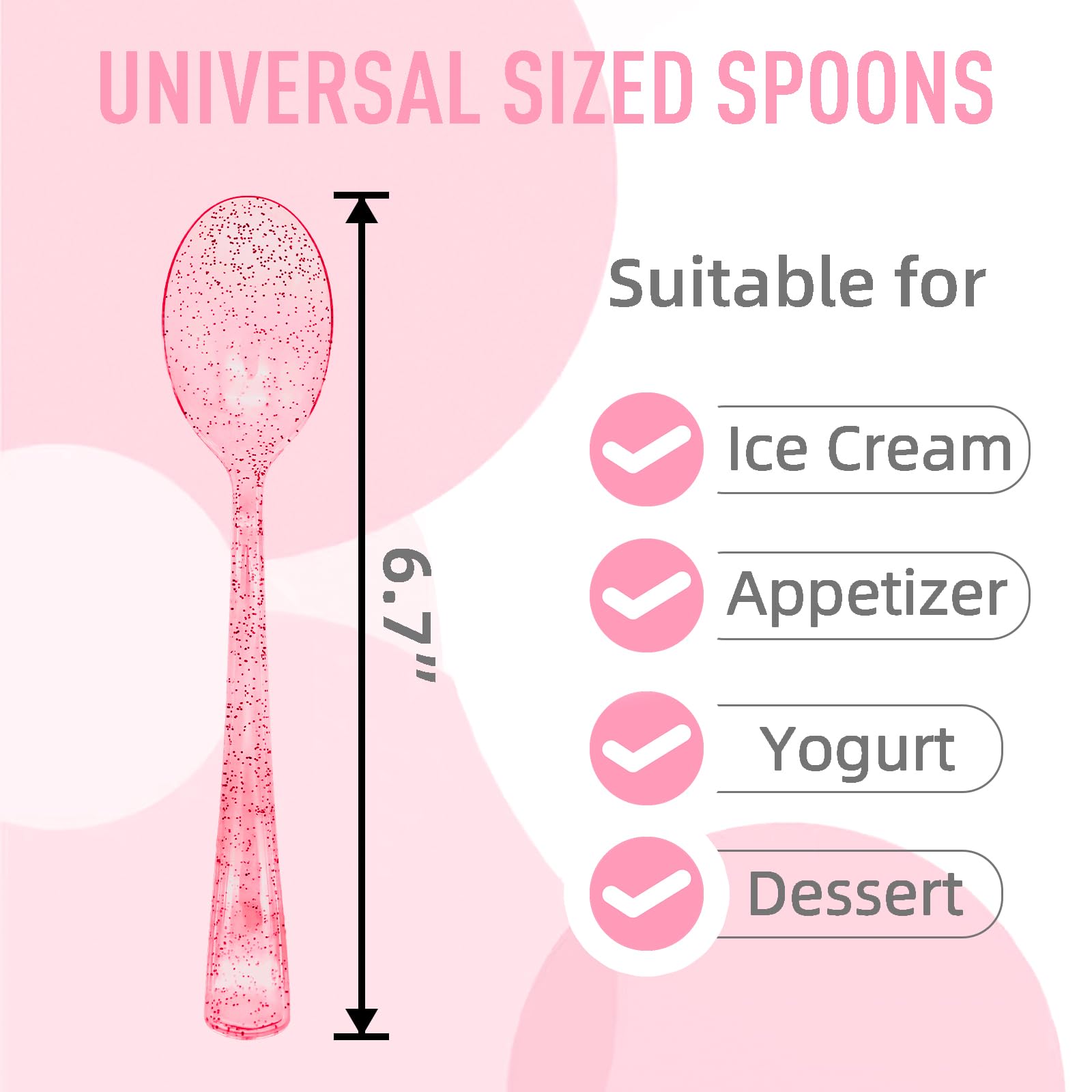 【Pink Spoons for Party】: Pink is a warm and romantic color that can give a pleasant and comfortable feeling. The pink sparkling exterior design can add a bright and lively atmosphere to the table. Pink spoons are not only practical tableware, but also stylish decorations that add a decorative touch to your table.