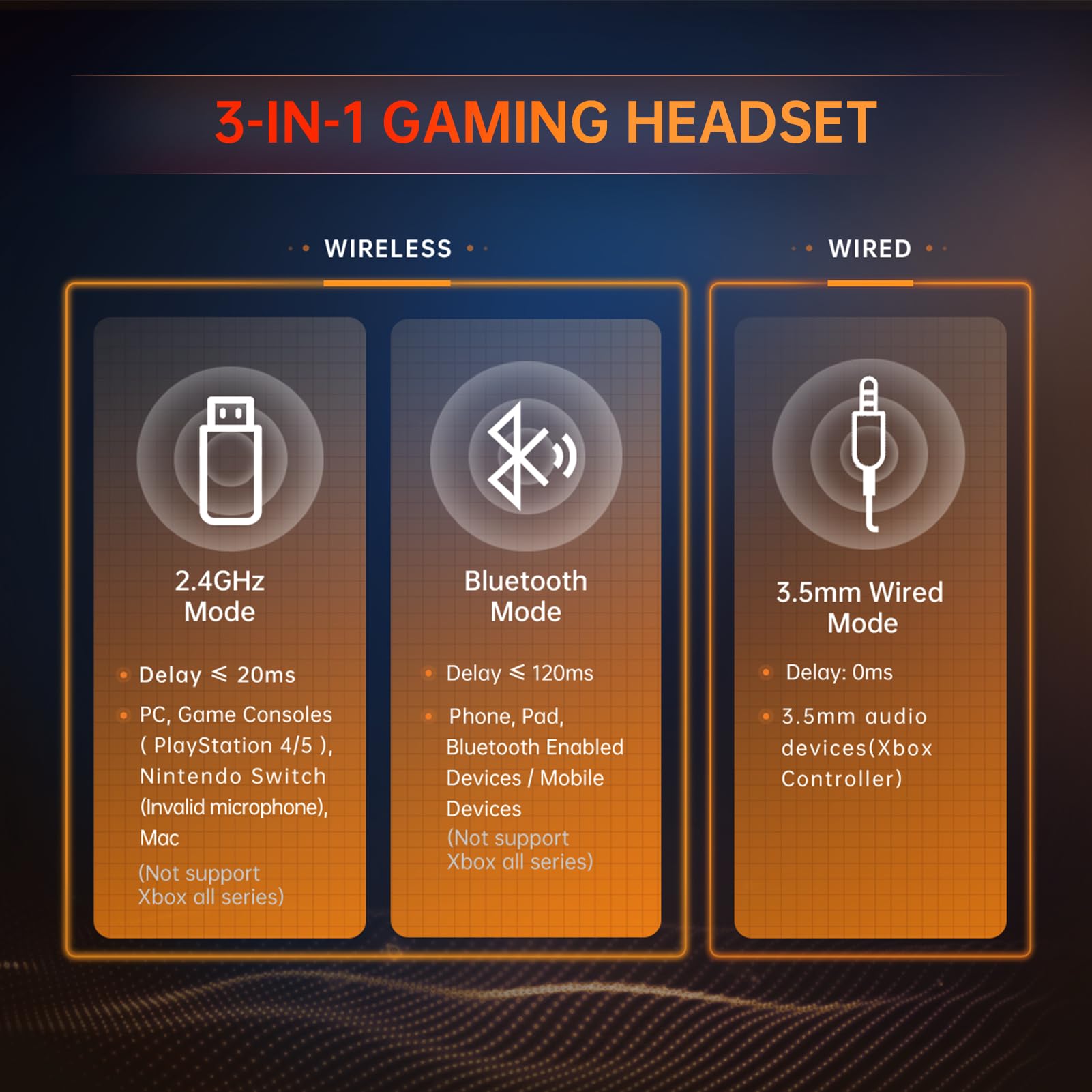 3-in-1 Connection Ways & Multi-platform Compatibility: Captain 300 gaming headphones support low latency, lossless 2.4GHz USB dongle and the latest Bluetooth 5.2 stable connection, while supporting 3.5mm wired connection mode. Unique 3 in 1 connection design (equipped with both USB dongle and 3.5mm jack cable) make this ps5 gaming headset widely compatible with PS5, PS4, PC, Mac, phone, pad, Switch(Invalid Microphone); Xbox series ONLY compatible with 3.5mm wired mode.