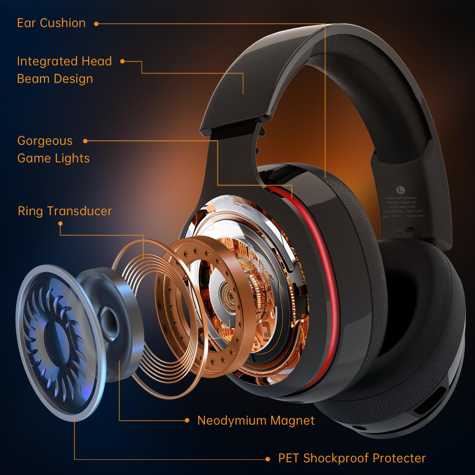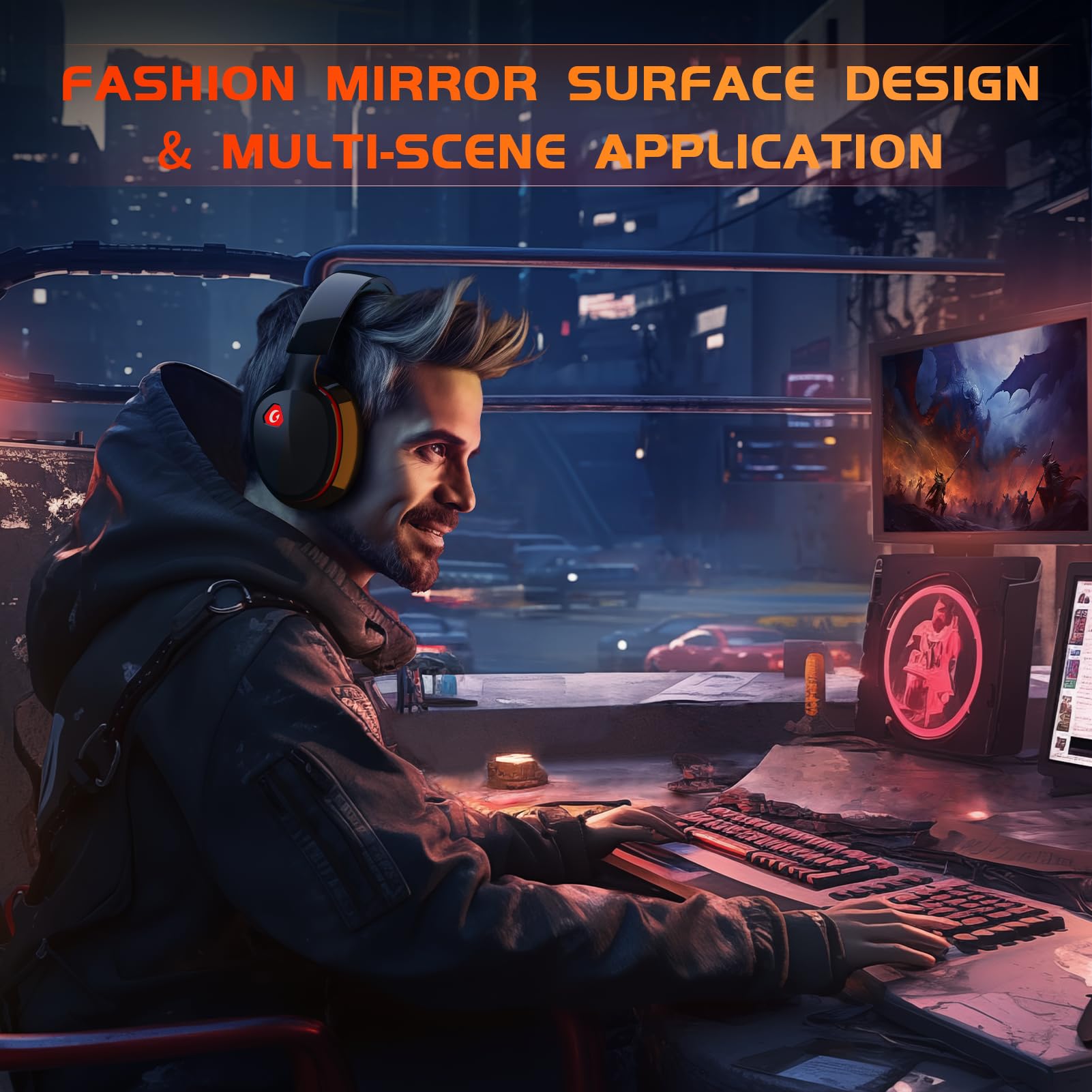 Ergonomic Design & Long-lasting Battery Life: Gtheos wireless gaming headset design padded adjustable headbands not only good for reducing head pressure but also suitable for various head shapes. Ears are completely covered by soft and breathable memory-protein earmuffs that isolate noises effectively and allow for long gaming sessions without fatigue. This pc gaming headset has a sustainable game time of 35-40Hrs. With cool red lighting effect turned on(15-20Hrs). Full-recharge in just 3Hrs.