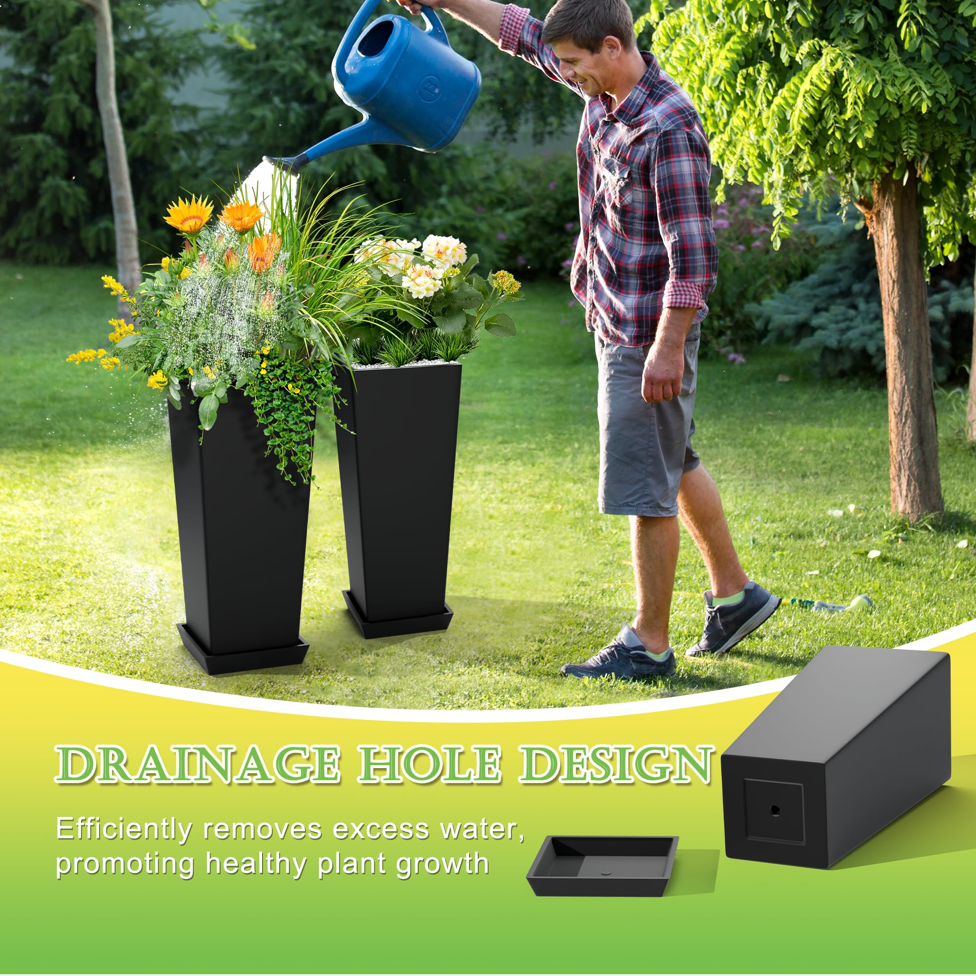 SET OF 2 STYLISH TALL PLANTERS: These large, 24-inch tall planters are perfect for both indoor and outdoor use. Their sleek black design complements any dΓ©cor, making them ideal planters for indoor plants or planters for outdoor plants like front porch displays or patios.