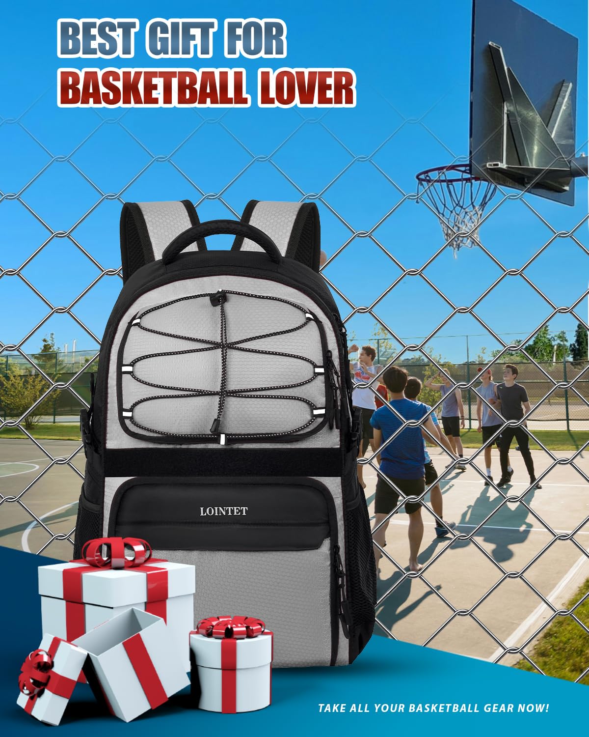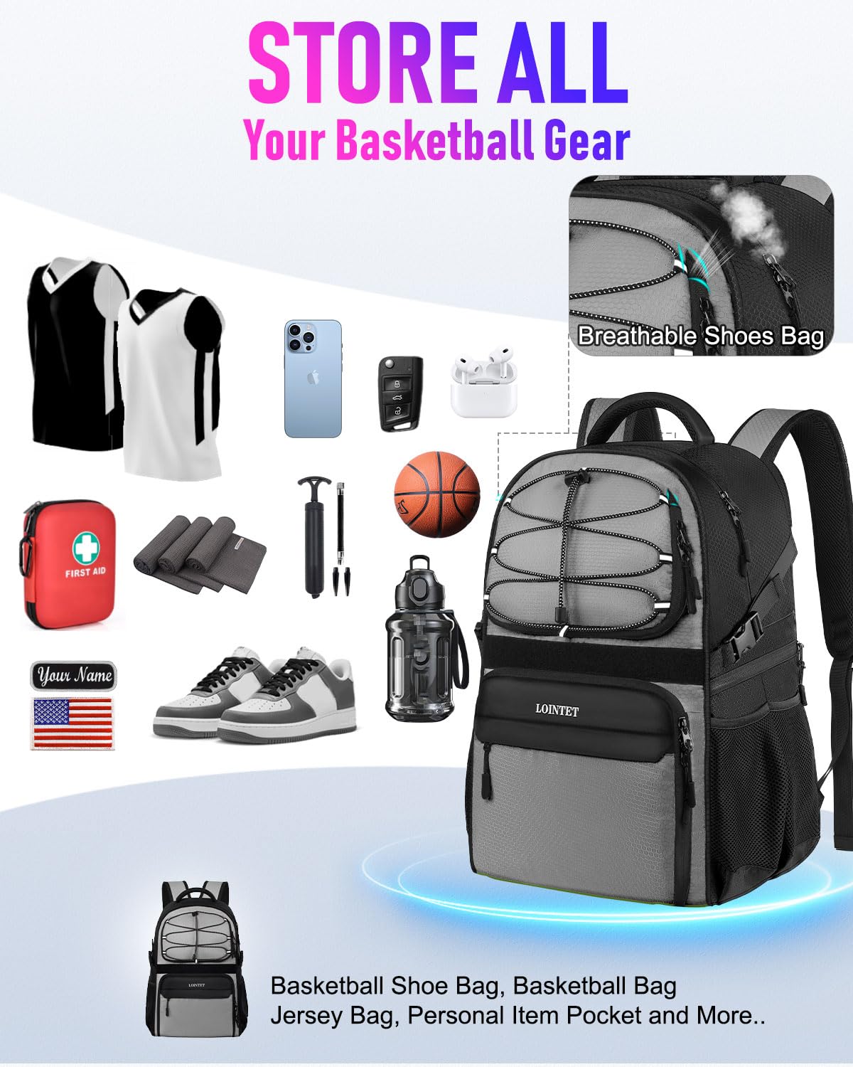 More Space Than Ever Before: LOINTET basketball bag backpack can easily carry your basketball equipment. Equipped with 11 storage compartments basketball backpack: 1 special compartment for your basketball, 1 main compartment for your clothes, 1 breathable compartment for your basketball shoes, 4 side mesh pockets for your water bottle, towel, first aid tools, air pump and other equipment. Additional 4 hidden zipper pockets can store your phone, headphones and other valuables