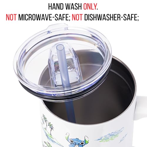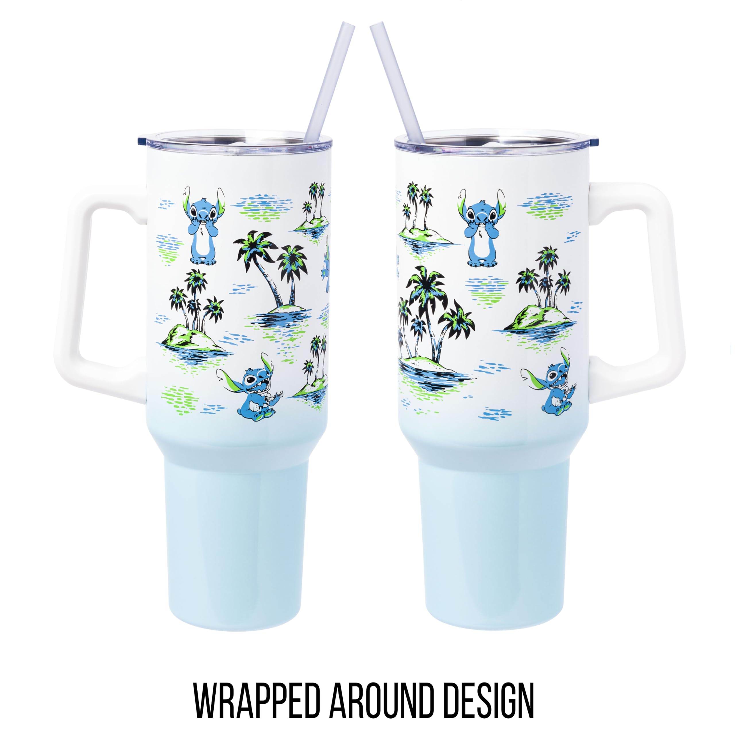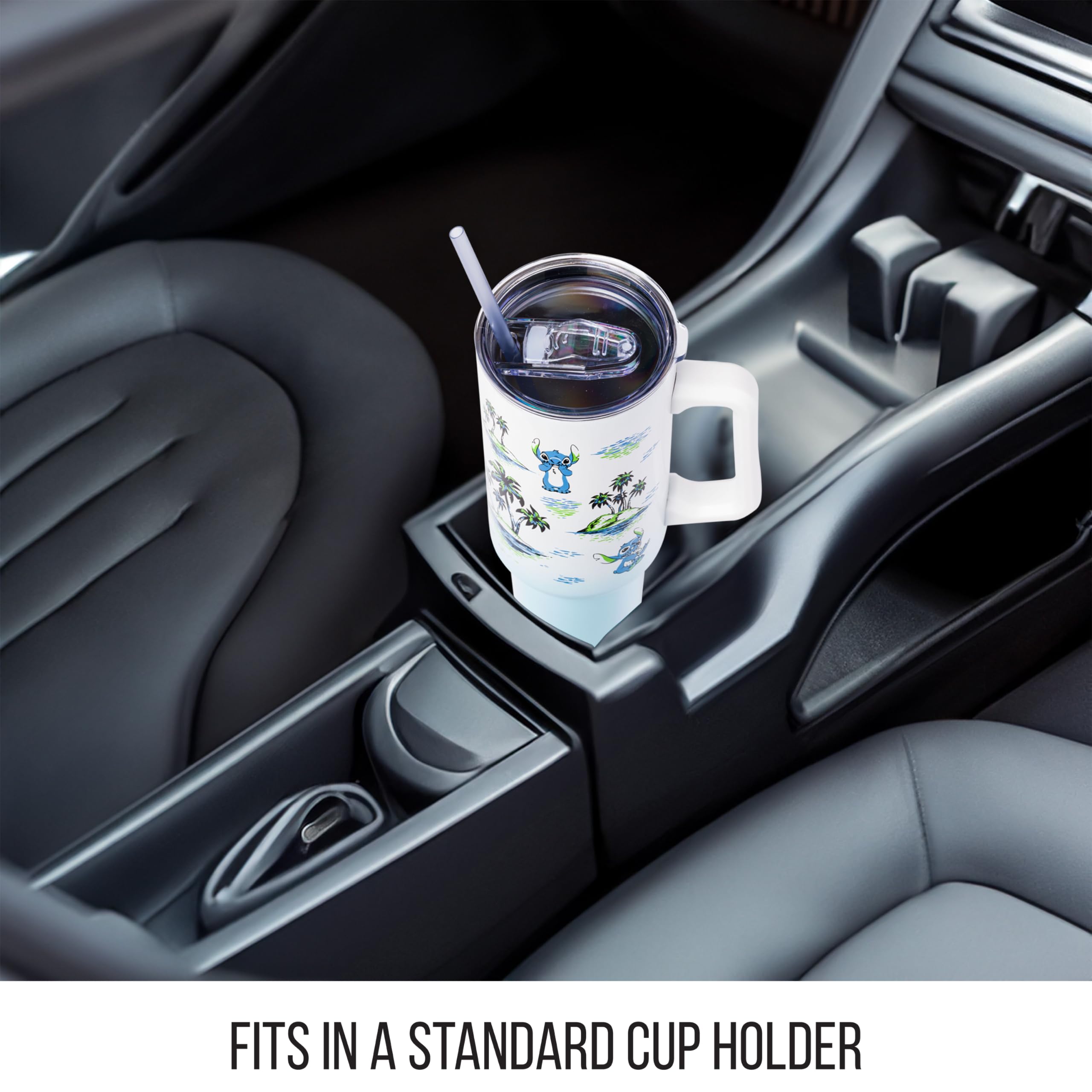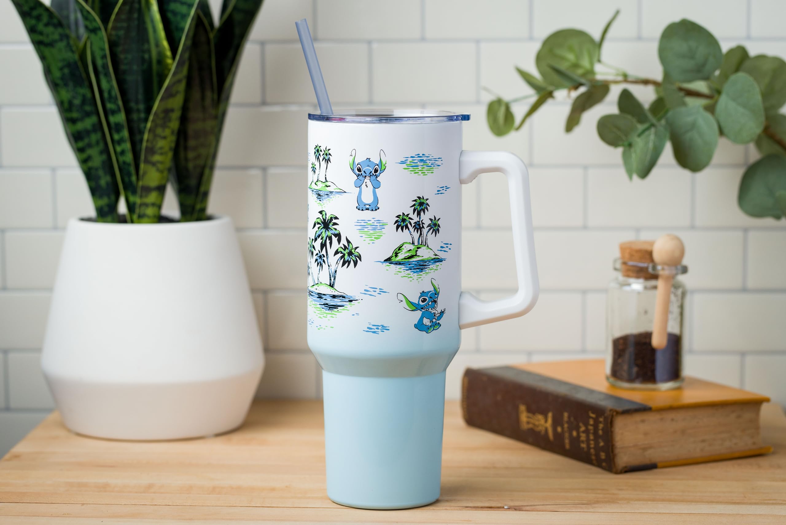 DISNEY’S LILO AND STITCH: Enjoy island life with this playful Lilo and Stitch double-walled stainless steel travel tumbler that holds 40oz. Features a white background with whimsical, retro sketches of palm trees, the ocean, and Disney’s experiment 626 Stitch. It includes a secure sliding lid and straw to stay hydrated on the go. It can even fit in your standard-size cup holder!