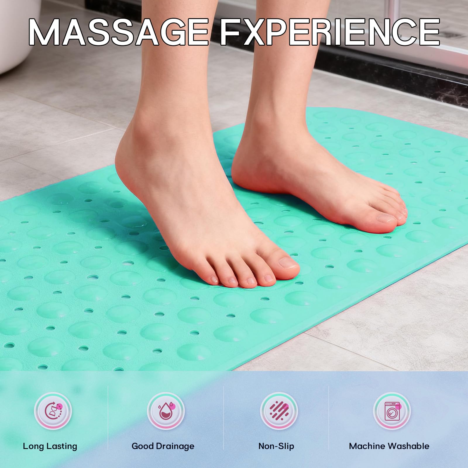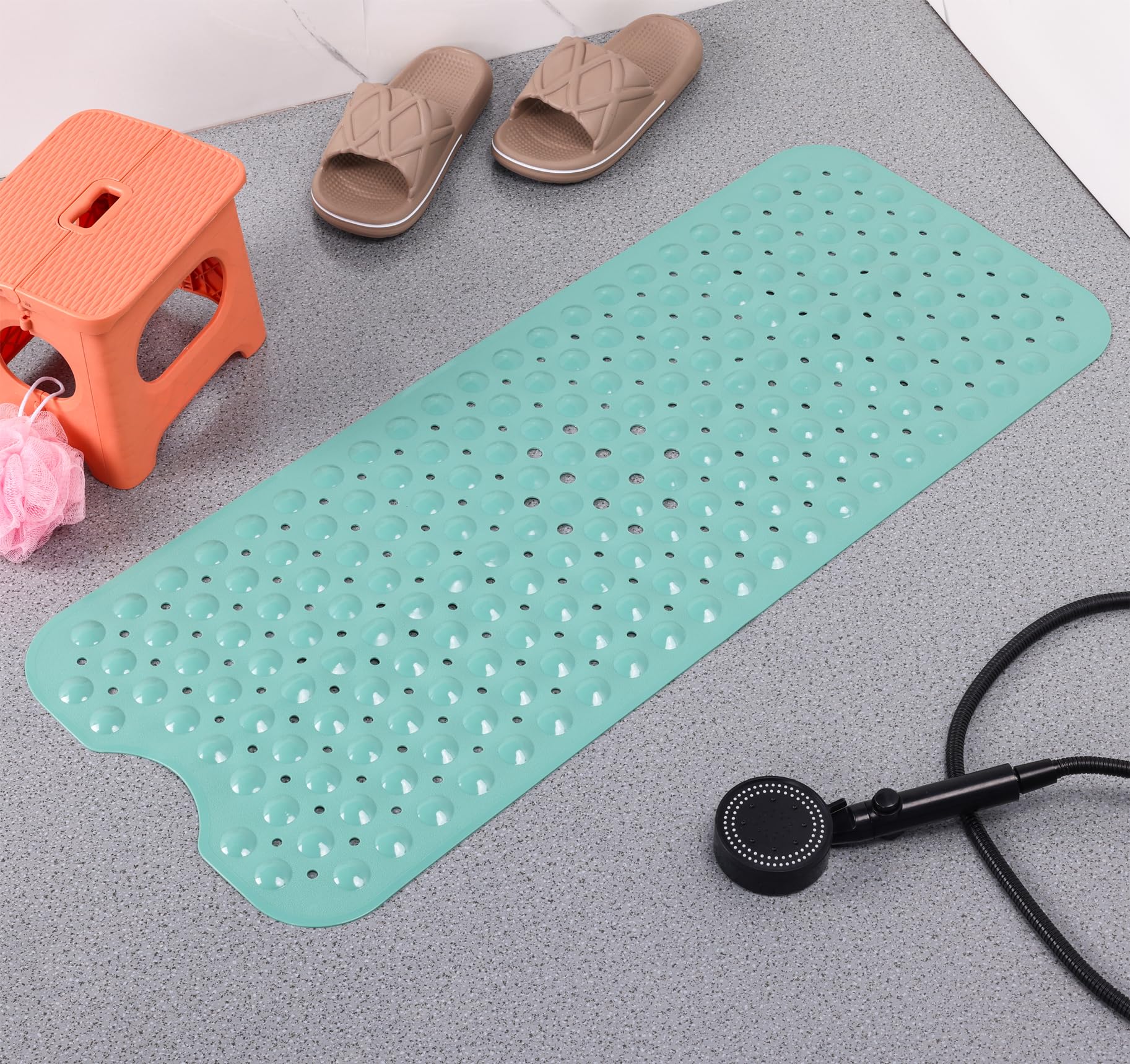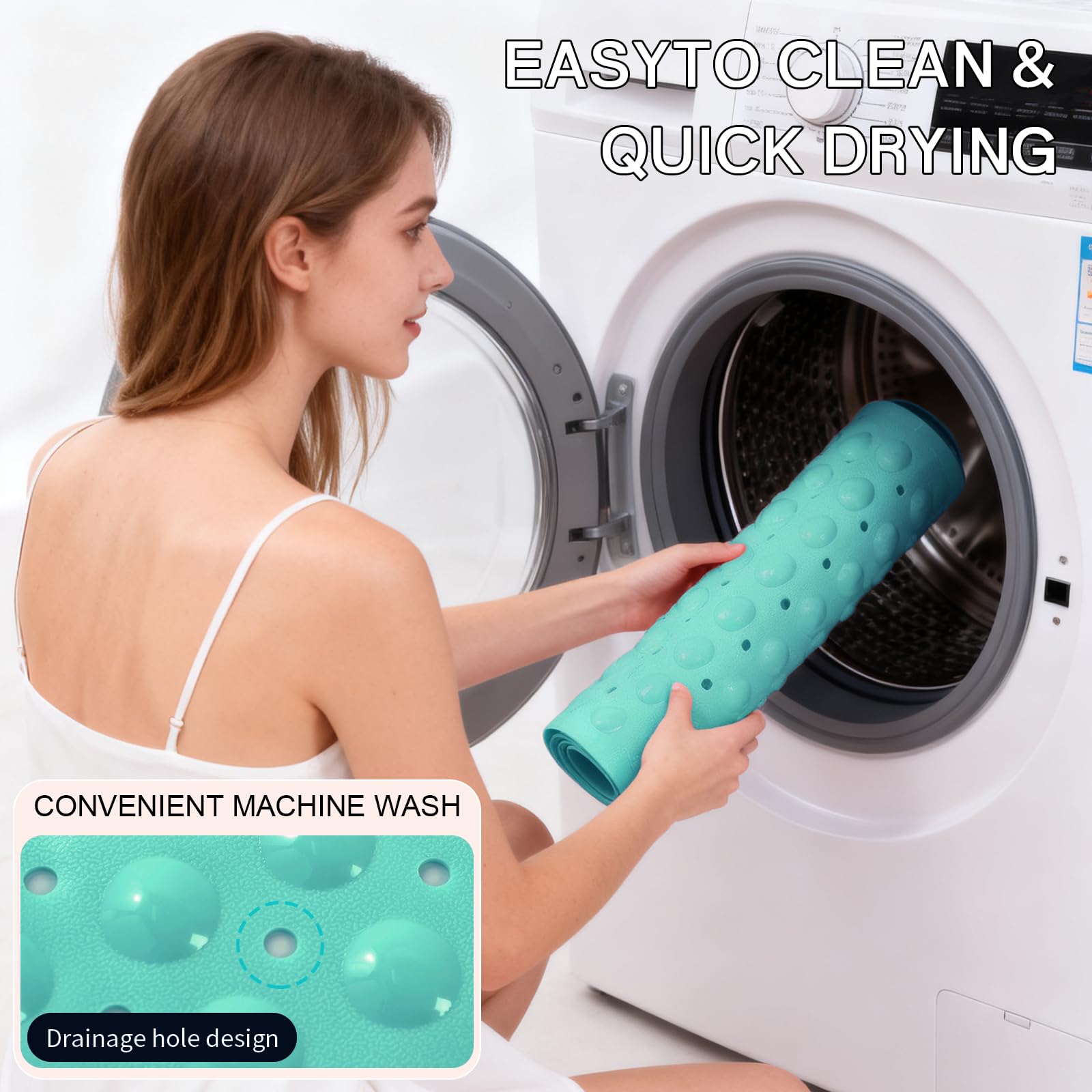 MACHINE WASHABLE: Conveniently machine-washable and easy to maintain, this non-slip bathtub mat can be effortlessly cleaned. Simply toss it into the machine and wash it on a cold water setting. Afterward, hang it to dry. We recommend periodically rinsing and air-drying the shower mat.