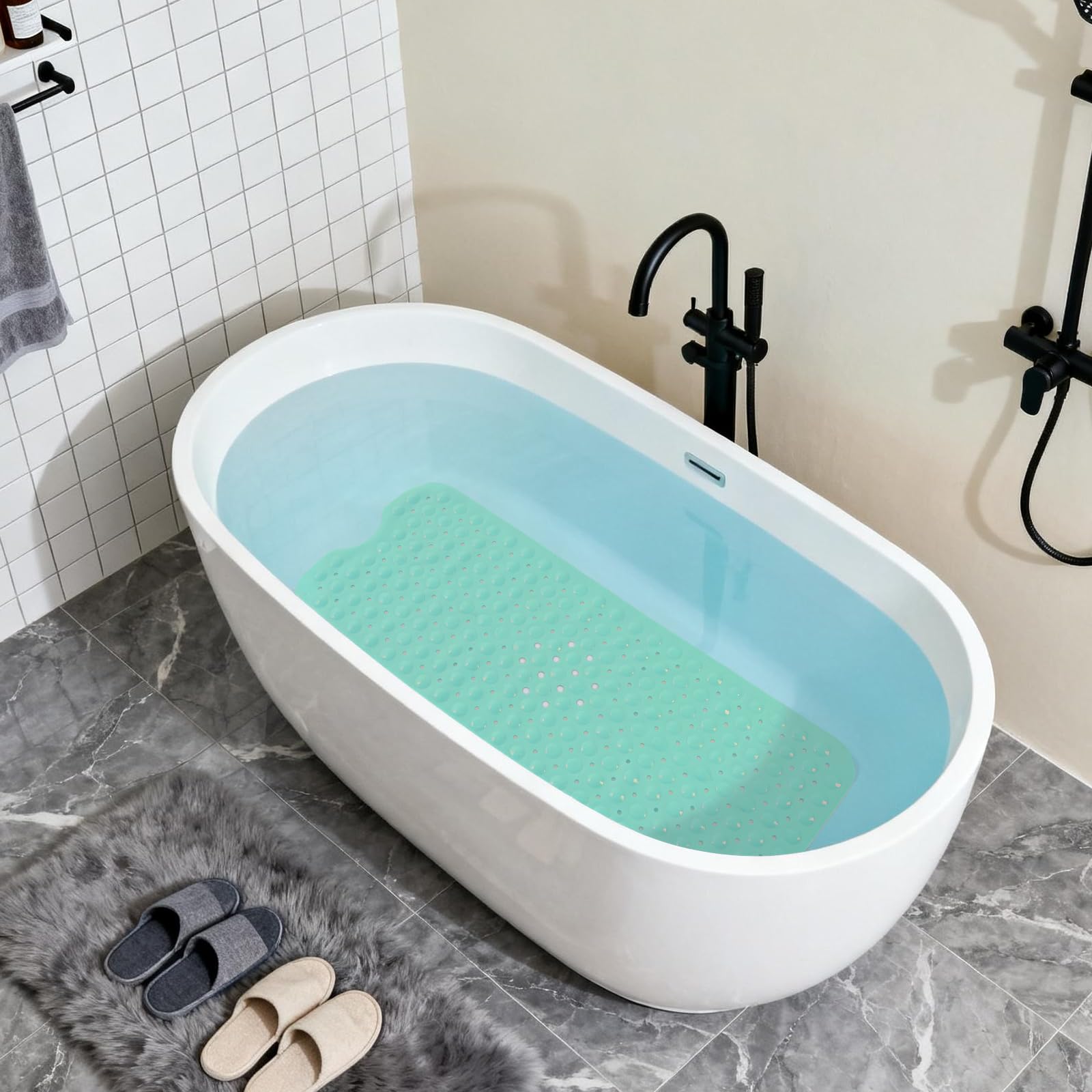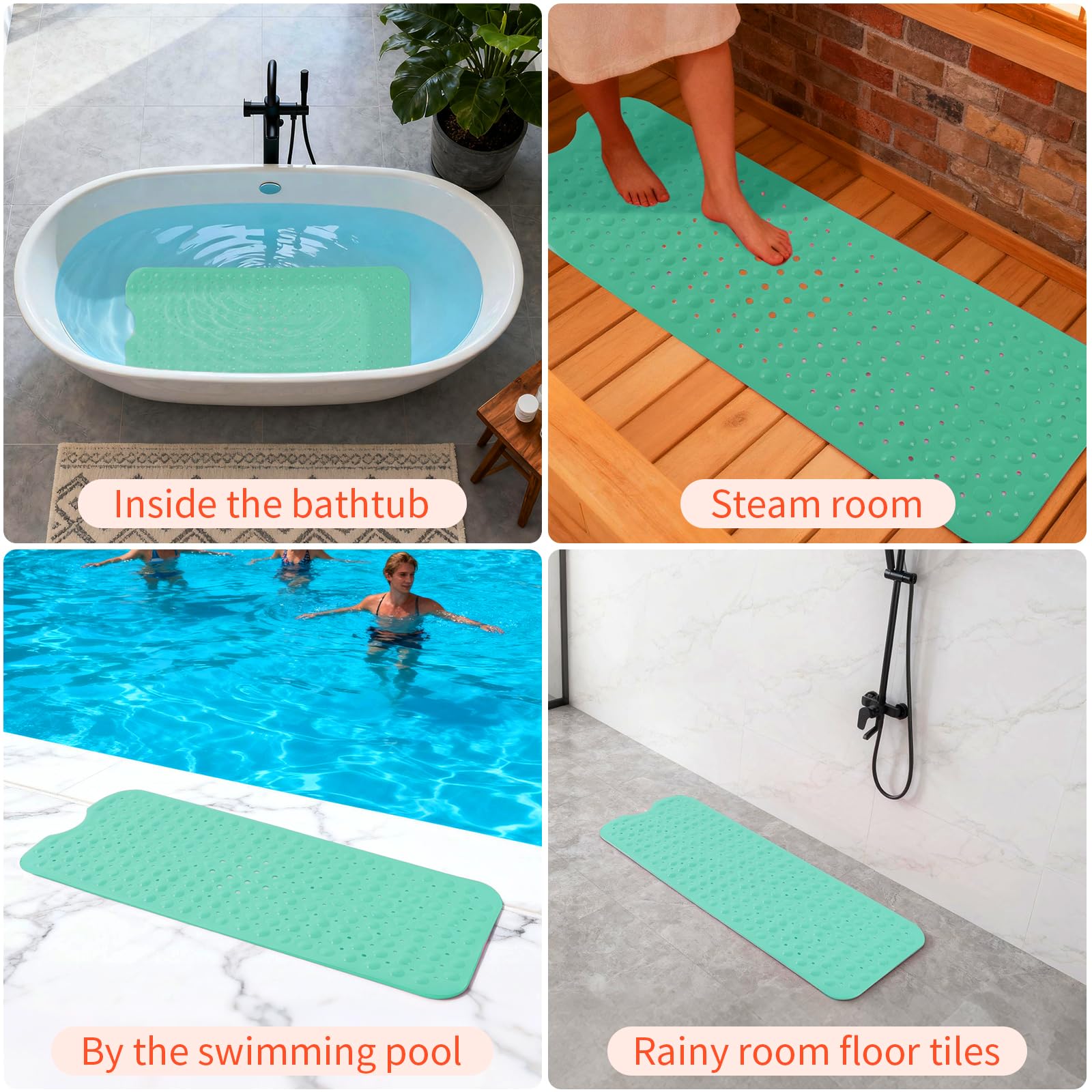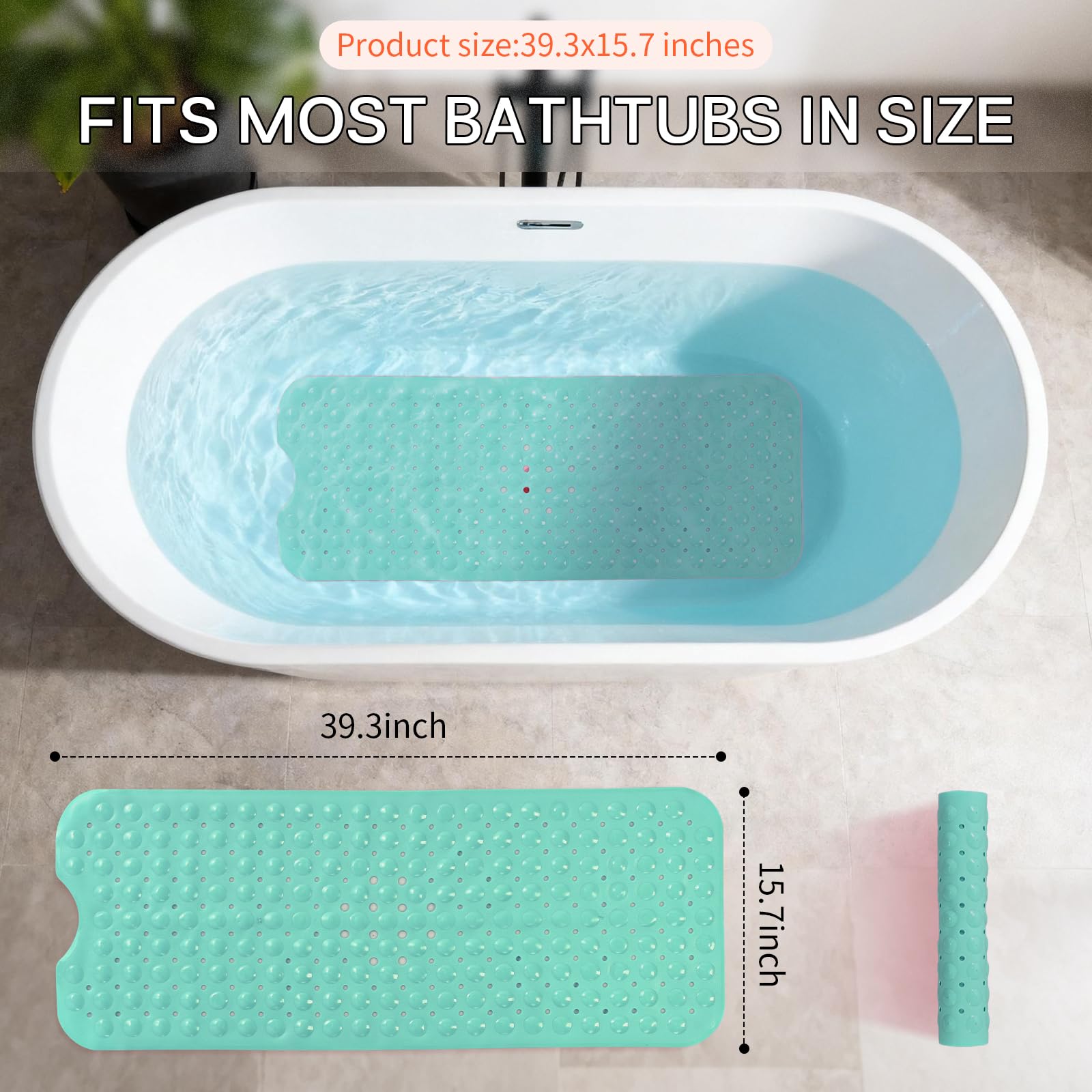 NON-SLIP LARGE BATH MAT: Our non-slip large bathtub mat offers superior coverage with its 39.3×15.7 inch(Approximately 100 × 40cm, with an error of about 1cm) size, maximum coverage for the bathtub floor. Equipped with 200 special large suction cups, this mat securely stays in place on smooth, clean surfaces, making it ideal for home, spa, sauna, gym baths, and showers.