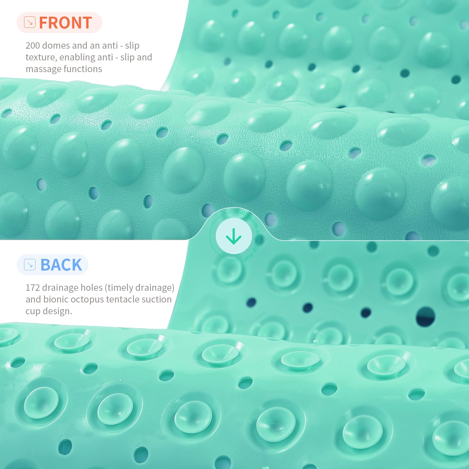 FUNCTIONAL BATHROOM MAT: Our versatile bath mat features a domed design resembling pebbles, offering a massage-like experience during shower time. The irregular texture on the surface enhances friction and prevents slipping. Additionally, with 172 small drain holes, water circulation is optimized and smoother drainage.