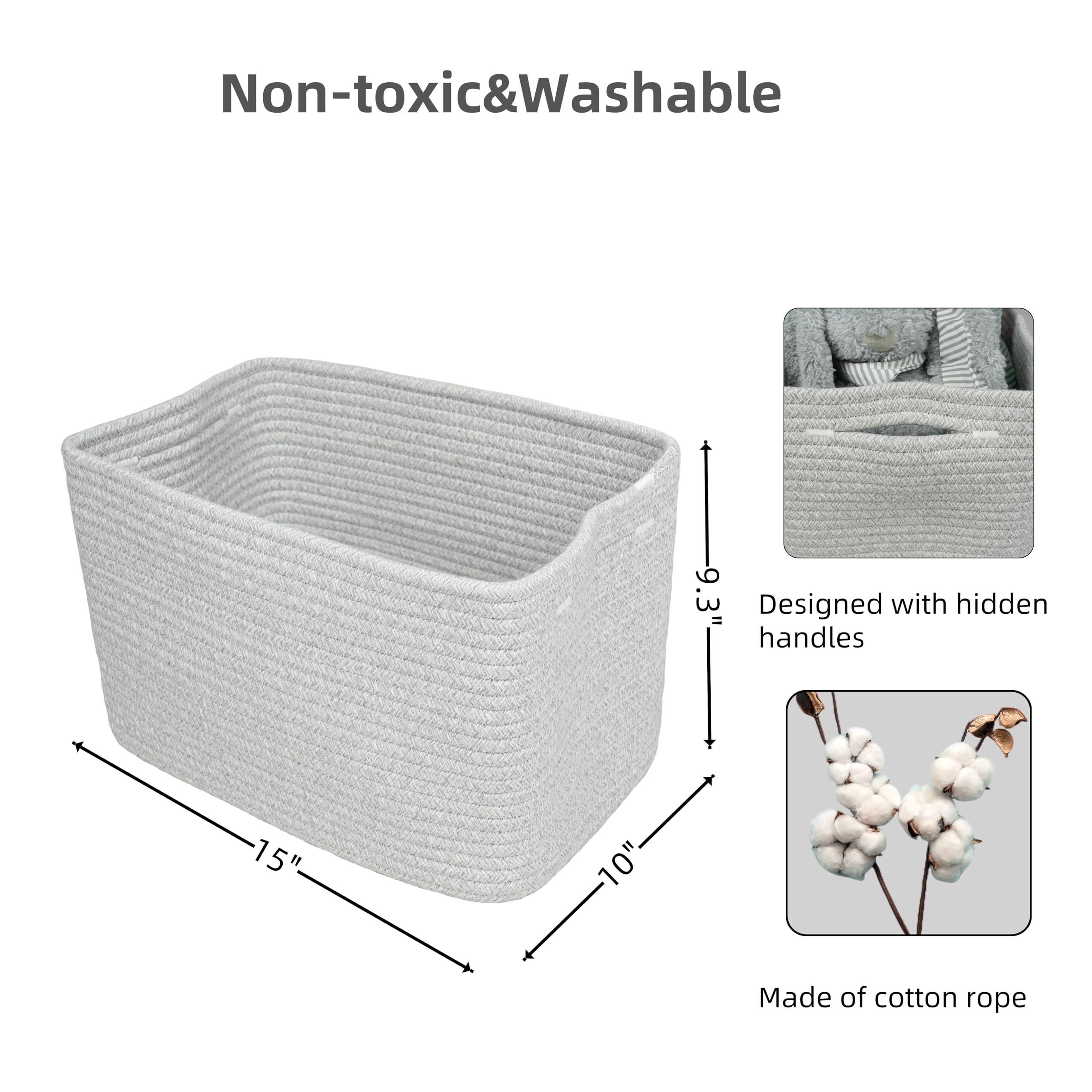 1, Medium to Large rectangle woven basket for storage: Our rope basket with handles size is 15”X10”X9.3”. Designed as home storage basket for organizing. Could use as toy basket, pet basket, book basket, towel basket, clothes basket, nursery basket, wicker basket for storage and more. Perfect as storage basket for shelves or closet storage bins to store household items.