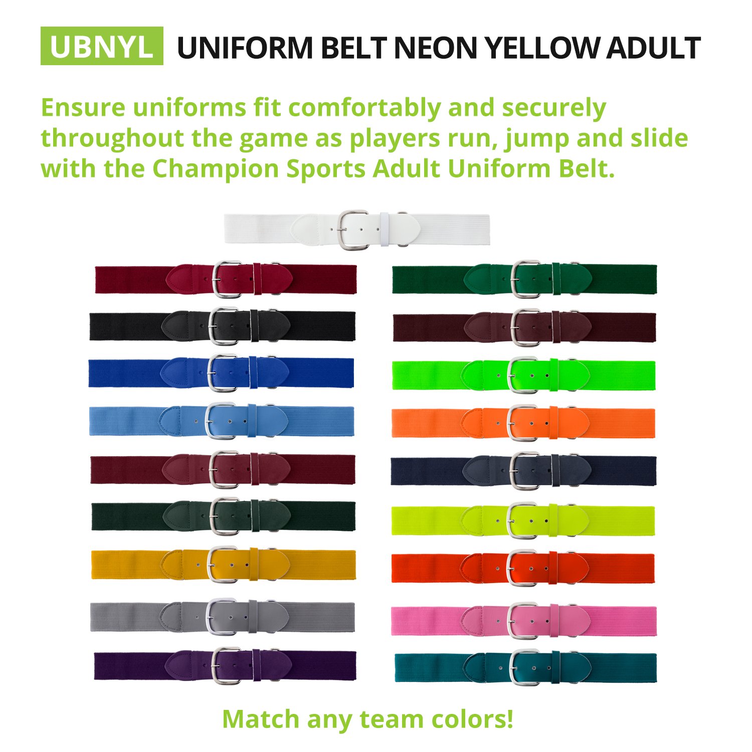 Ensure your uniform stays put with the Champion Sports Uniform Belt. Designed for versatility, this belt features an adjustable elastic band that stretches to fit youth and adult waists. A sturdy metal buckle and leather tab offer lasting durability, while the 1.5" width provides a clean, professional look. Choose from a wide range of colors to perfectly match your team's uniform.