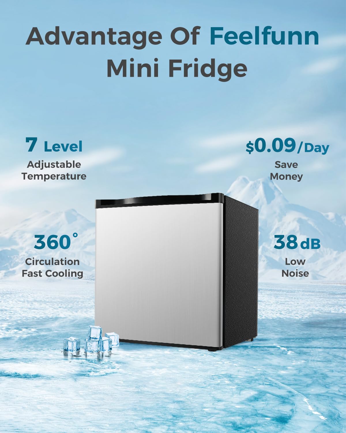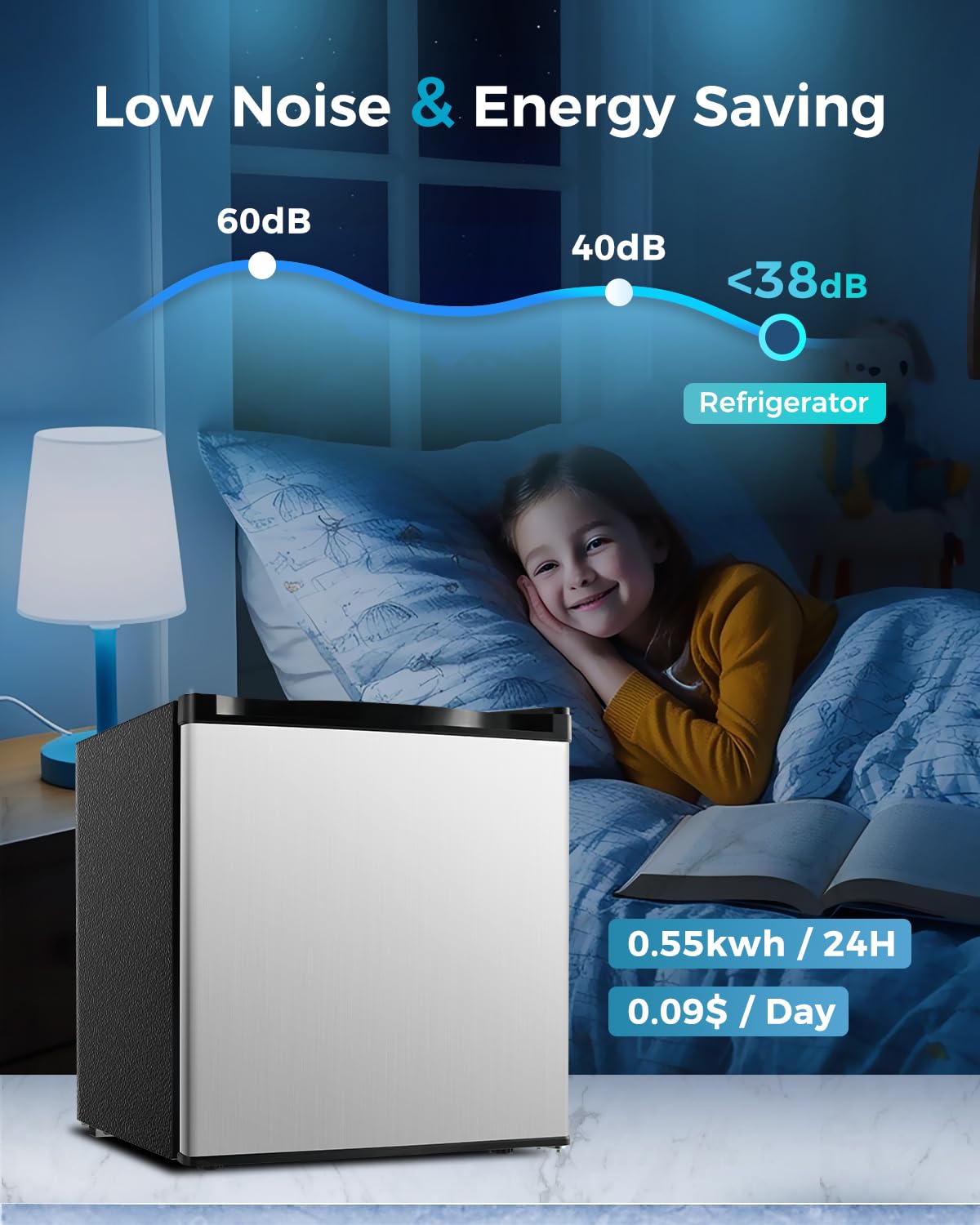 Low Noise & Energy-Efficient - Operating quietly at ≤38 dB, our bedroom mini fridge maintains a peaceful atmosphere for study, relaxation, or work environments. With energy costs as low as 0.55 kWh (about $0.09 daily), enjoy tranquil lifestyles in dorms, kitchens, game rooms, offices, and study areas – saving on bills while eliminating disruptive sounds!