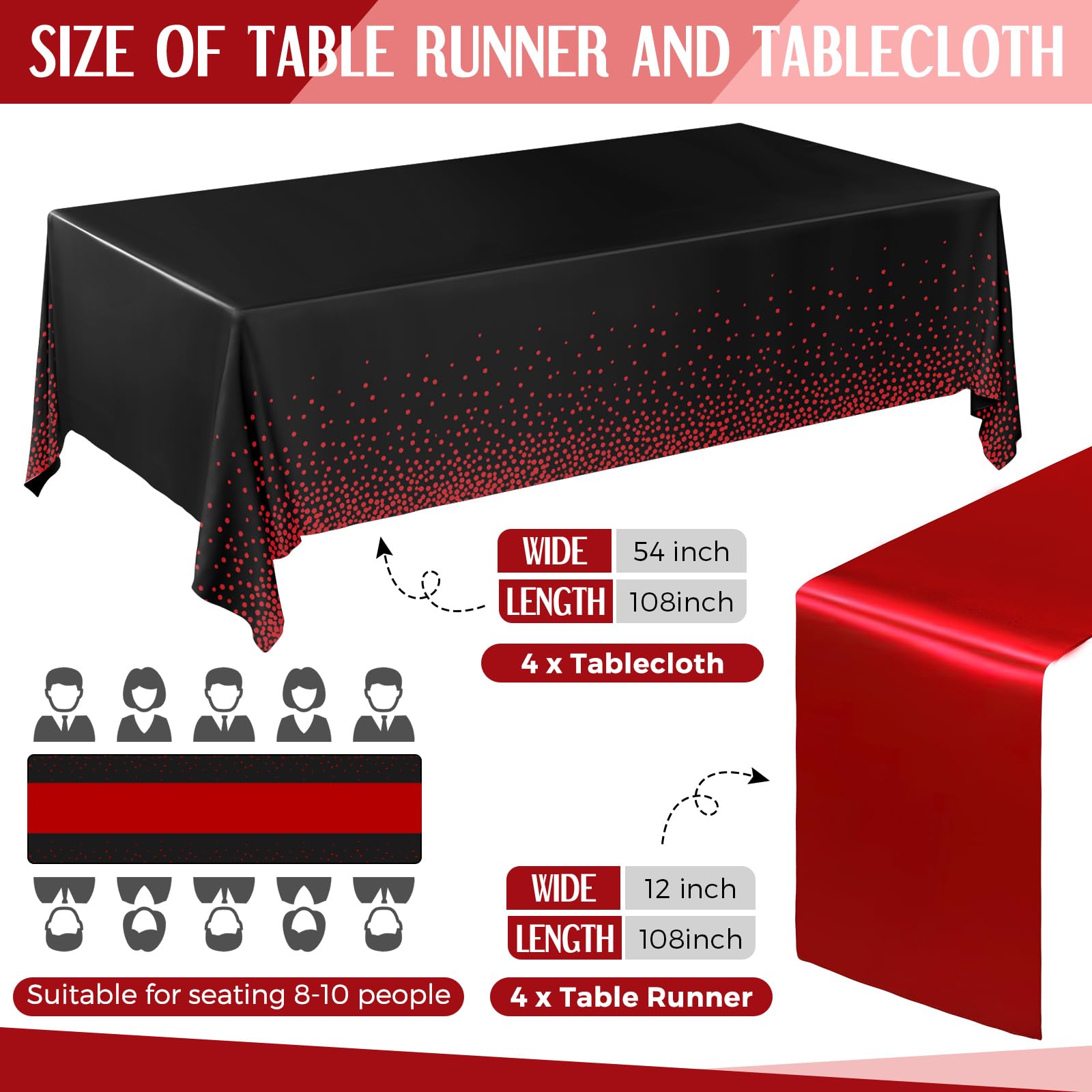 Sufficient Quantities: what you will receive are 8 packs of table covers, containing 4 pieces of plastic tablecloths and 4 pieces of satin table runners; Besides, the sets of table decorations can reduce your selection time and meet your replacement needs