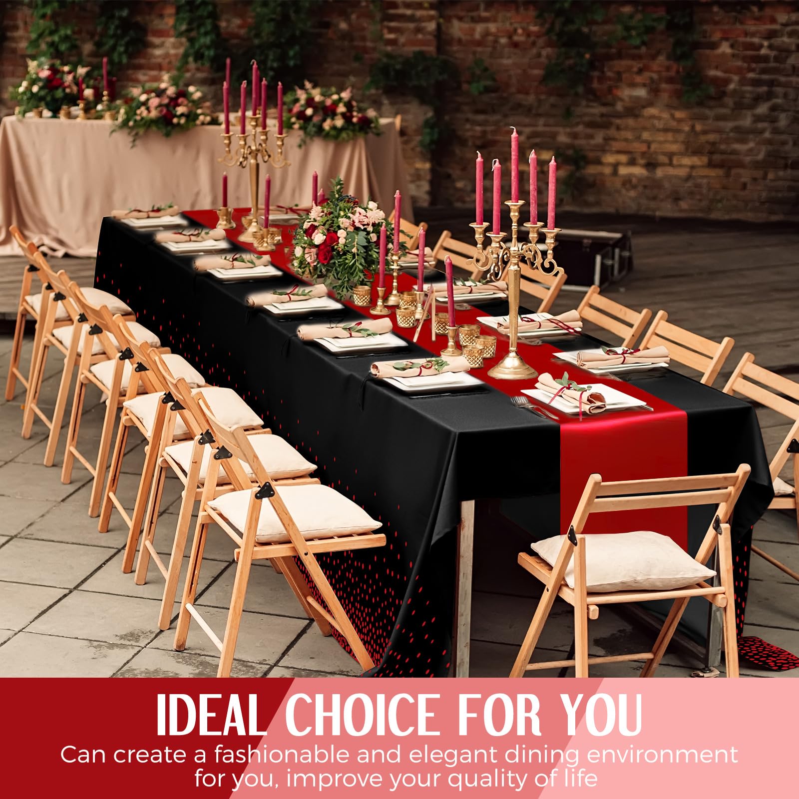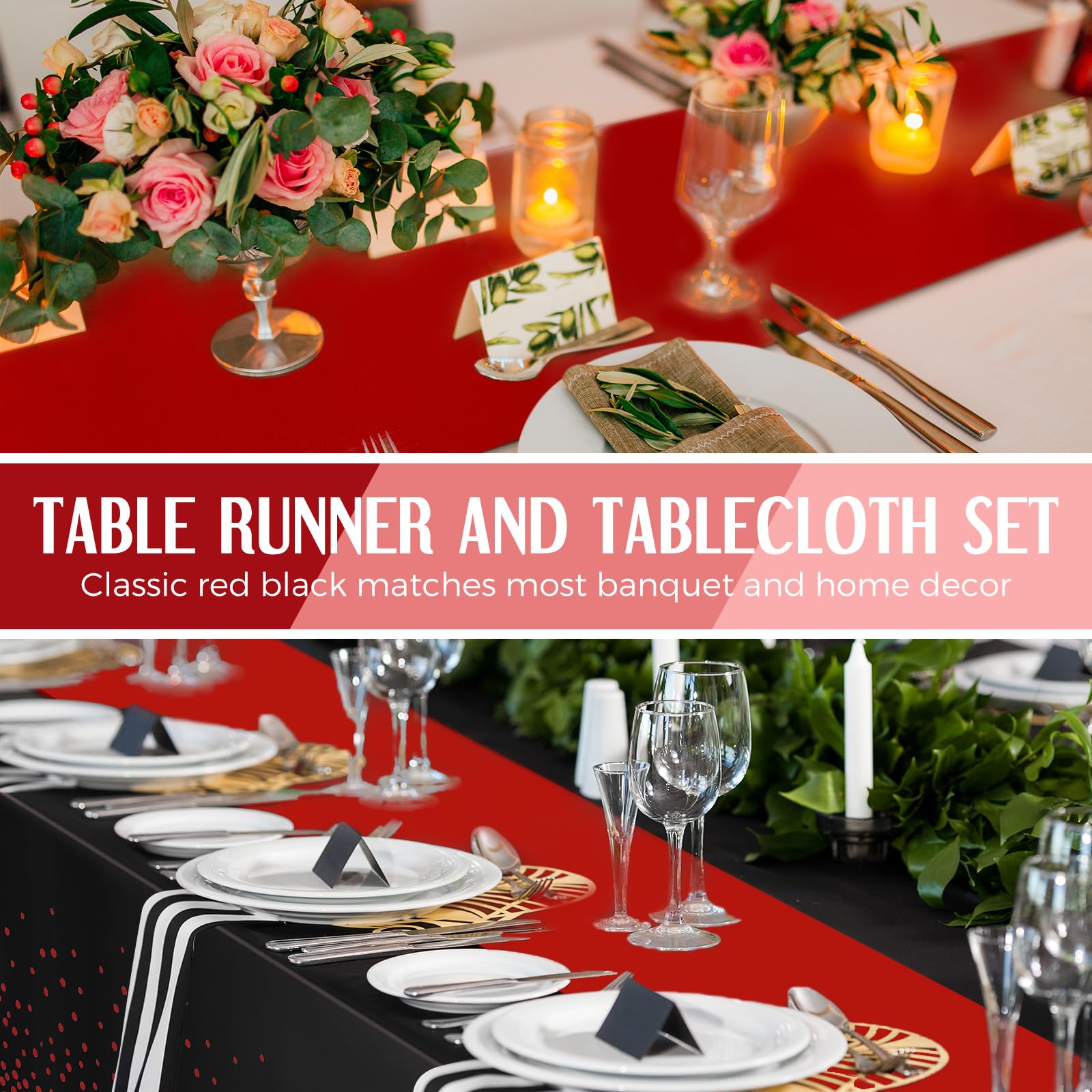 Appropriate Sizes: the disposable table cloth measures approx. 54 x 108 inches and the satin table runners are approx. 12 x 108 inches; Large enough to cover rectangle desks and round tables, or cut into whatever shape you want for decorating