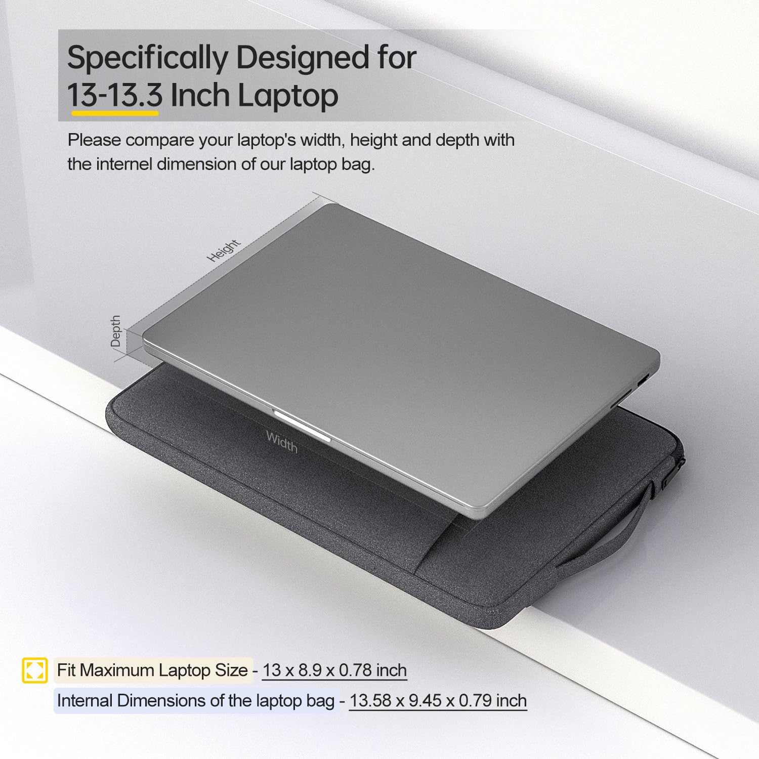 【Measure Your Laptop Internal Dimensions】Internal Dimensions - 13.58" x 9.45" x 0.79", Fit Maximum Laptop Size -13"x 8.9"x 0.78". Please measure your laptop less 0.59" than the sleeve's internal dimensions in both length and width.