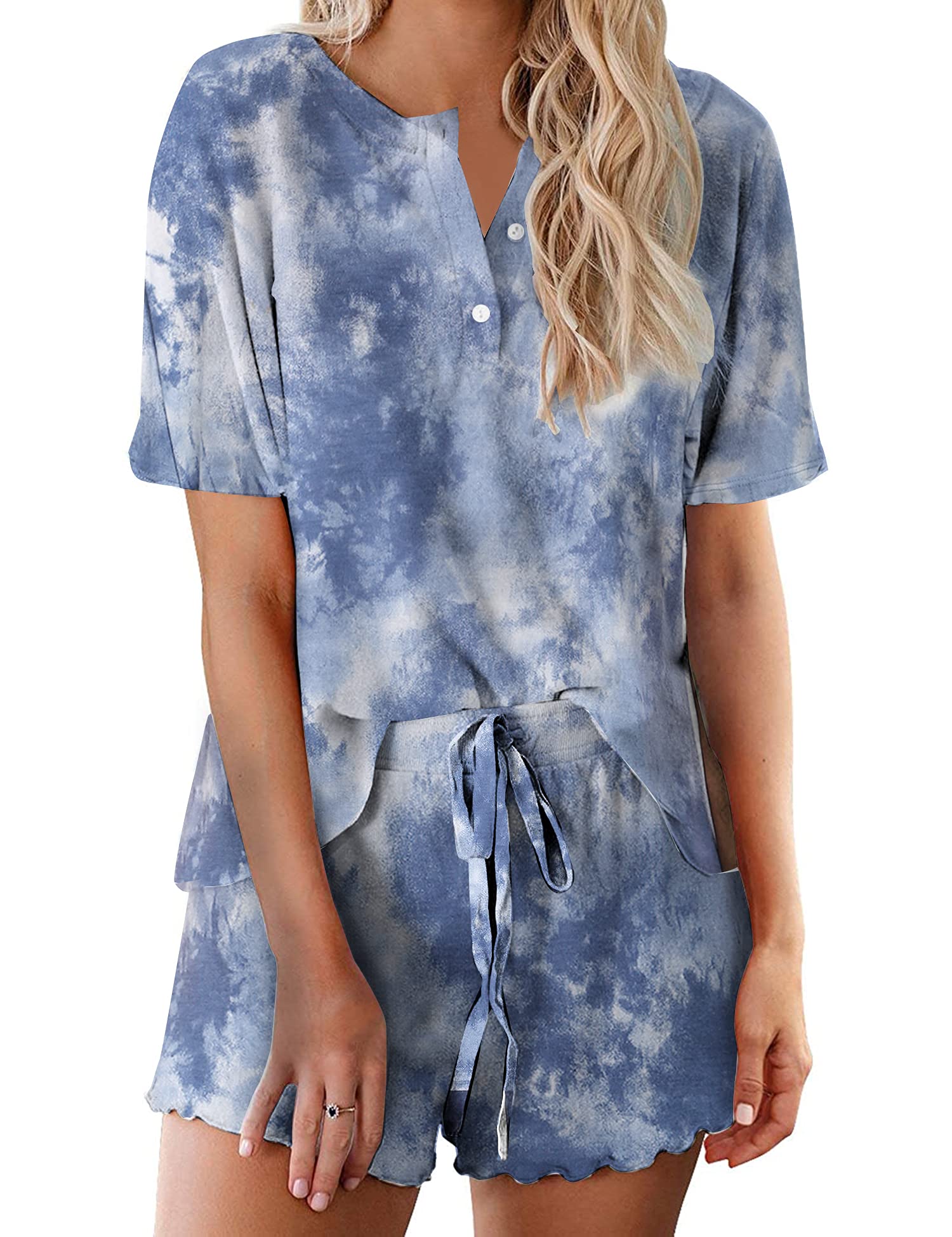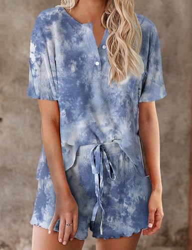 ❀[Women Two Piece Pajama Set]: Soft and comfy loungewear nightwear fits for all seasons. Sleep in the daily casual Short Sleeve tie dye PJs ( 2 piece sleepwear sets) is not only ultra-comfortable but also stylish. Jersey material feels as smooth & light as air breathing on your skin. Classic crewneck with buttons, elastic drawstring waistband is easy to dress up or down; New chic tie dye patterned, suitbale for working/ relaxing at home, lounging out or dreaming under the sunshine