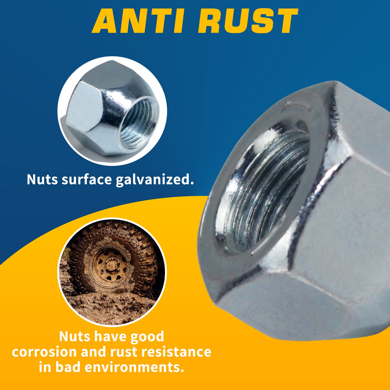 【NO RUST】Nuts surface galvanized. Ensure that nuts are corrosion and rust resistant in bad environments.