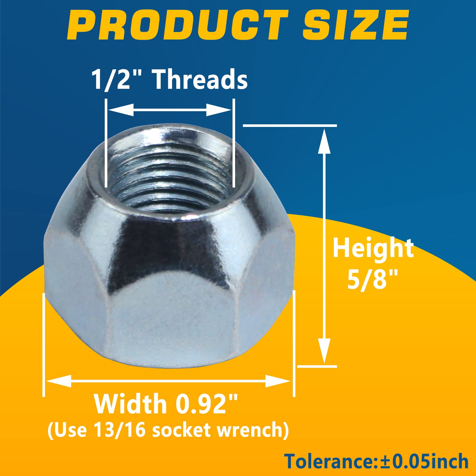【SIZE】1/2''-20 Trailer Nuts, 1/2" threads, 20 threads per inch, 5/8" height with 60 degree tapered angle. Use 13/16 socket wrench. Please check the size before order.