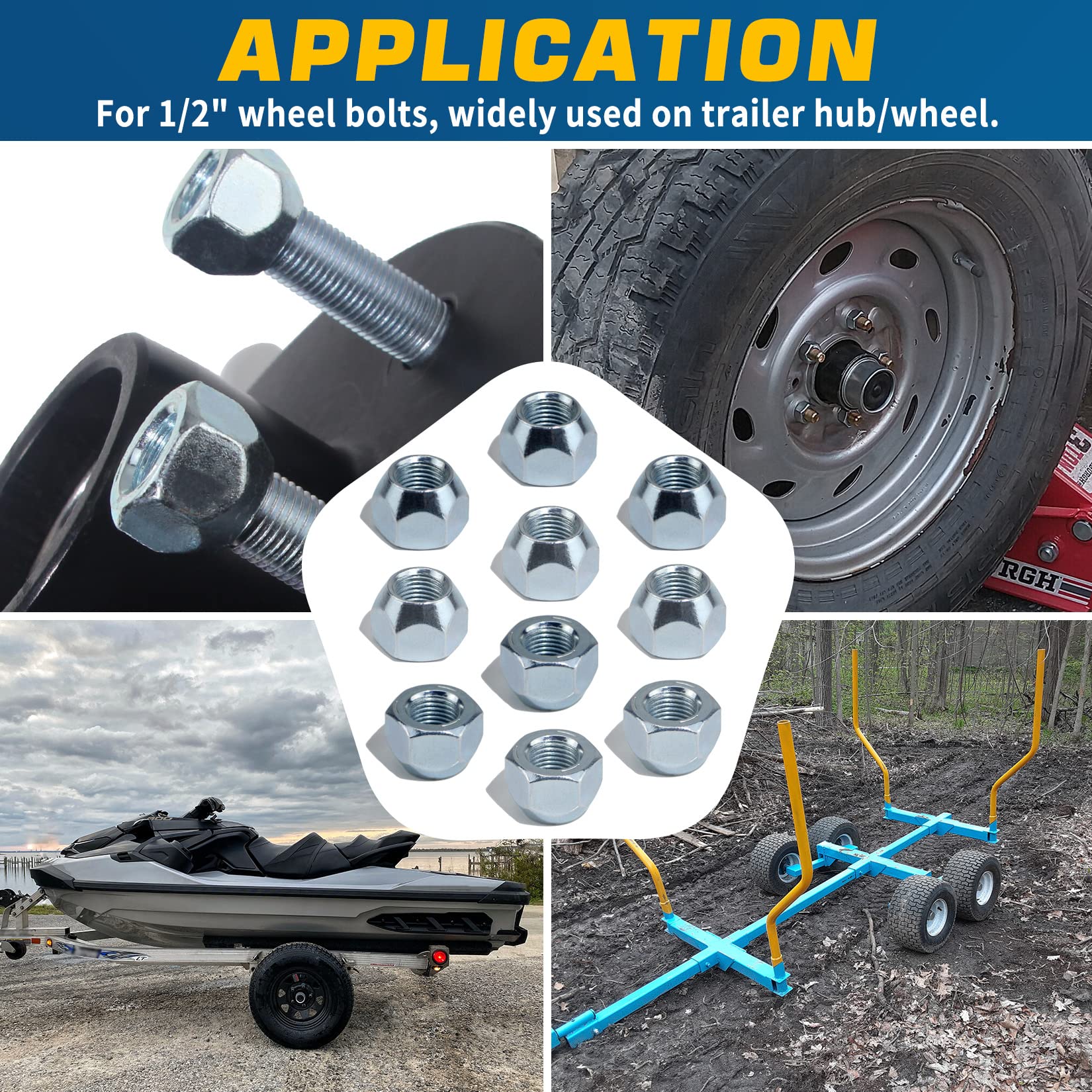 【FIT】For 1/2" wheel bolts, widely used on trailer hub/wheel. Package includes 10PCS trailer lug nuts, sufficient quantity will meet your daily use and replacement need.