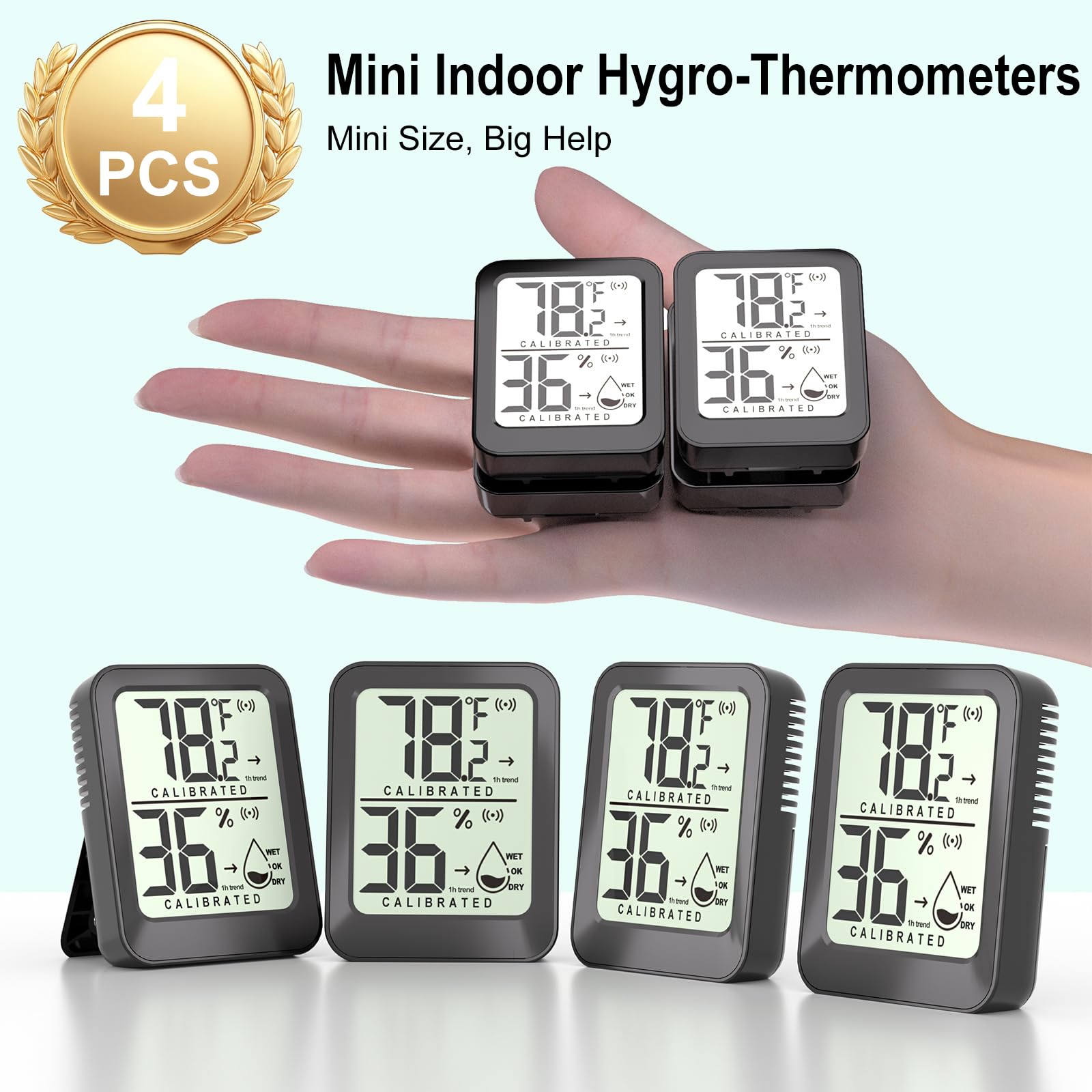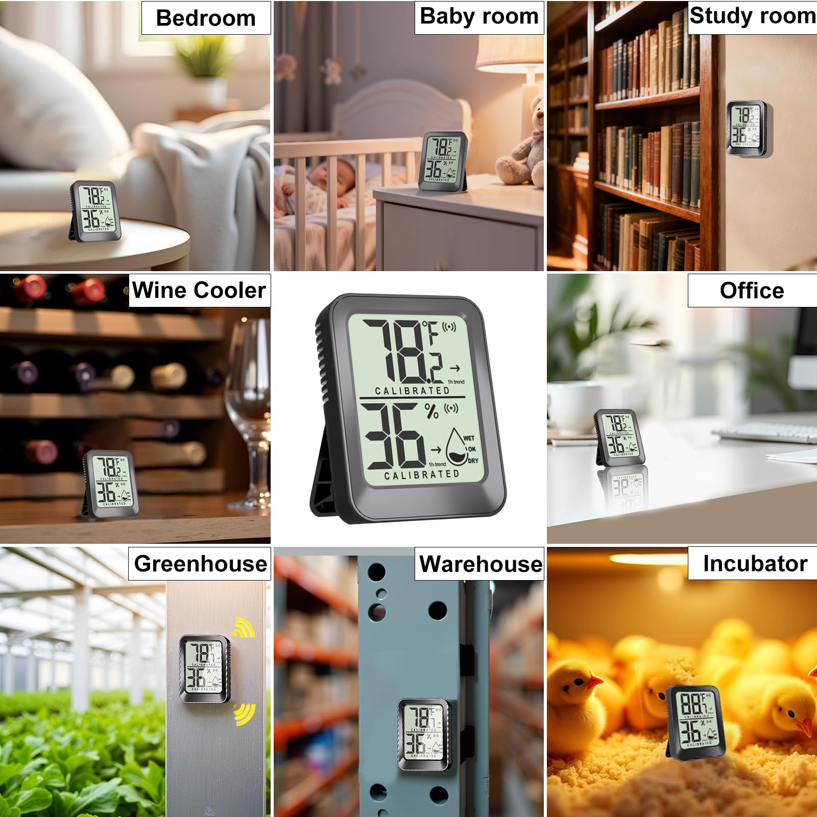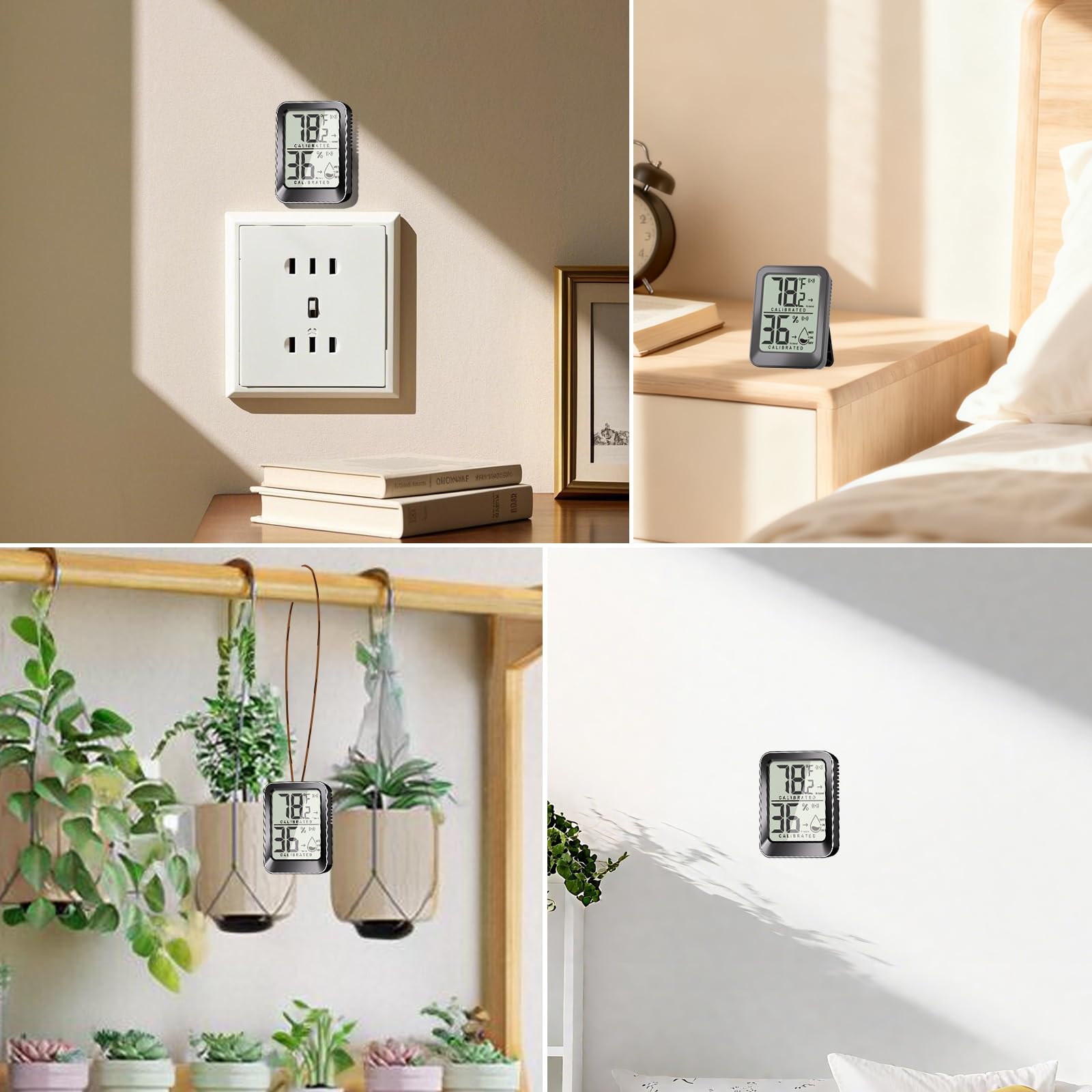 【Hassle-Free Placement 】Each compact hygro-thermometer includes kickstand, hanging hole and 2 adhesive tapes (8 total). Effortlessly mount on walls, shelves, or place flat in nurseries, greenhouses, reptile tanks, egg incubator, or refrigerators