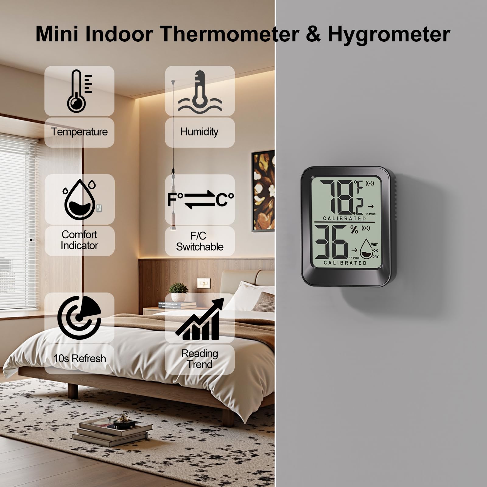 【1-Hour Trends + Humidity indicating】Built-in accurate sensor auto-refreshes every 10 sec. Visual humidity level icons (Dry/Comfort/Wet) + 1-hour trend remind you instantly adjust humidifiers/dehumidifiers — maintain ideal comfort effortlessly