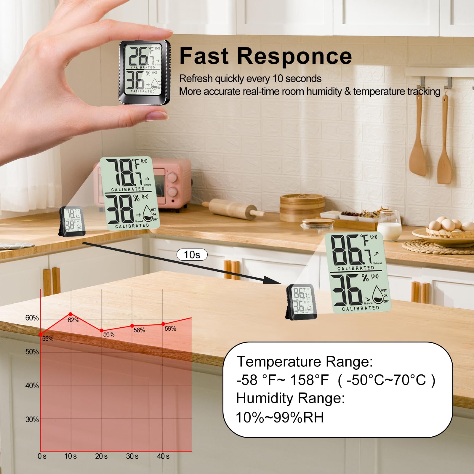 【Calibratable 】This hygrometer will calibrate automatically for 3 minutes after turning on, ensuring consistent accuracy. Standard temperature measuring range: -58 ~ 158 °F( -50~70 °C ), humidity range: 10%~99%.