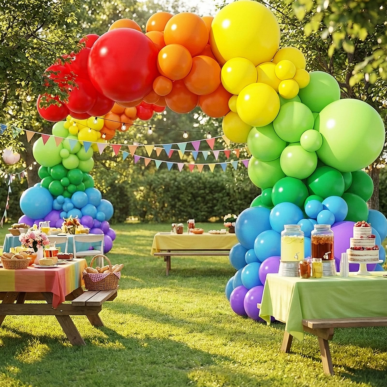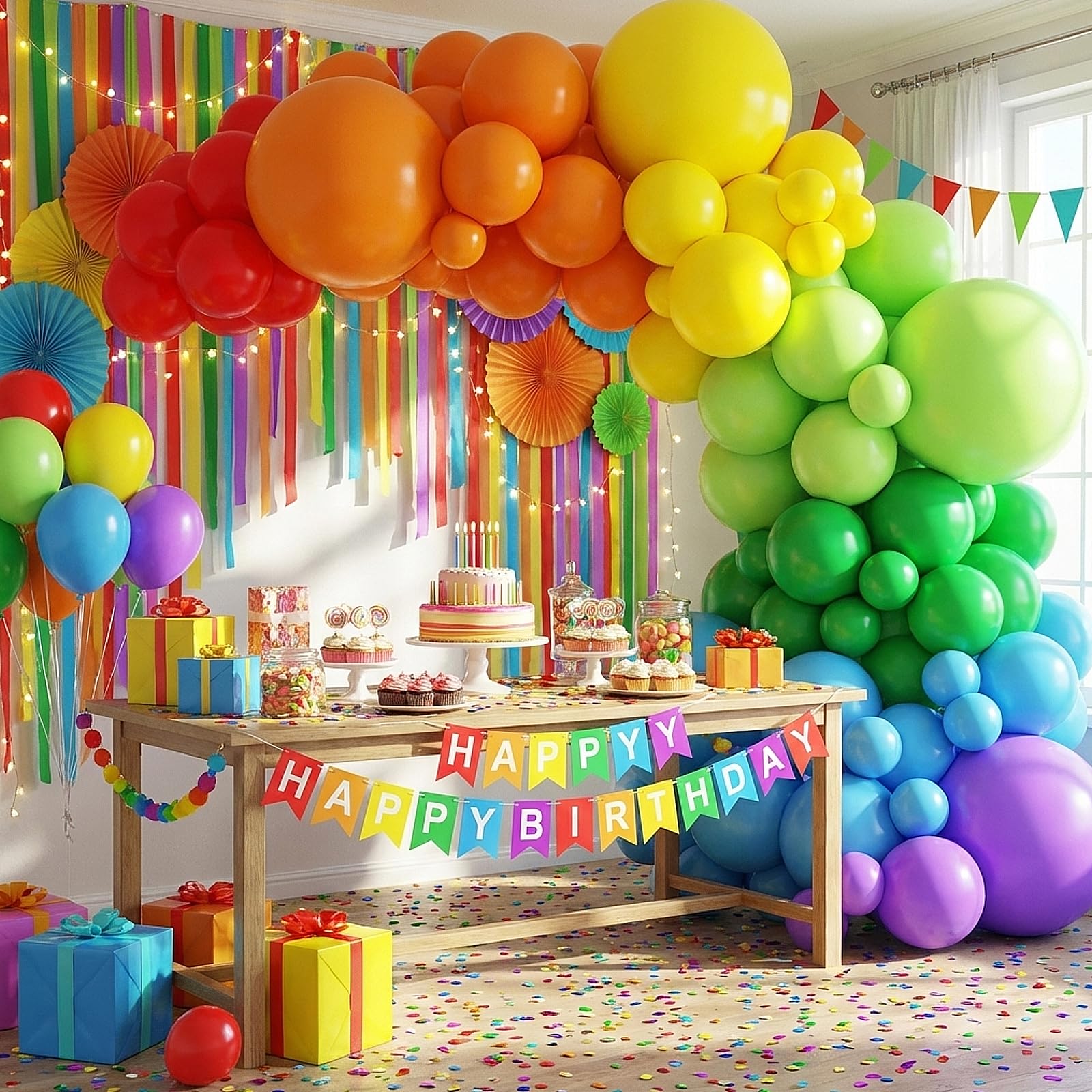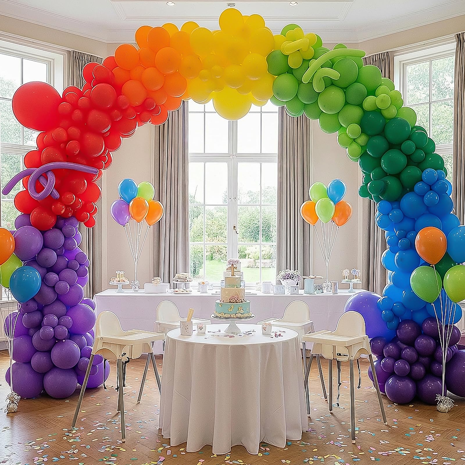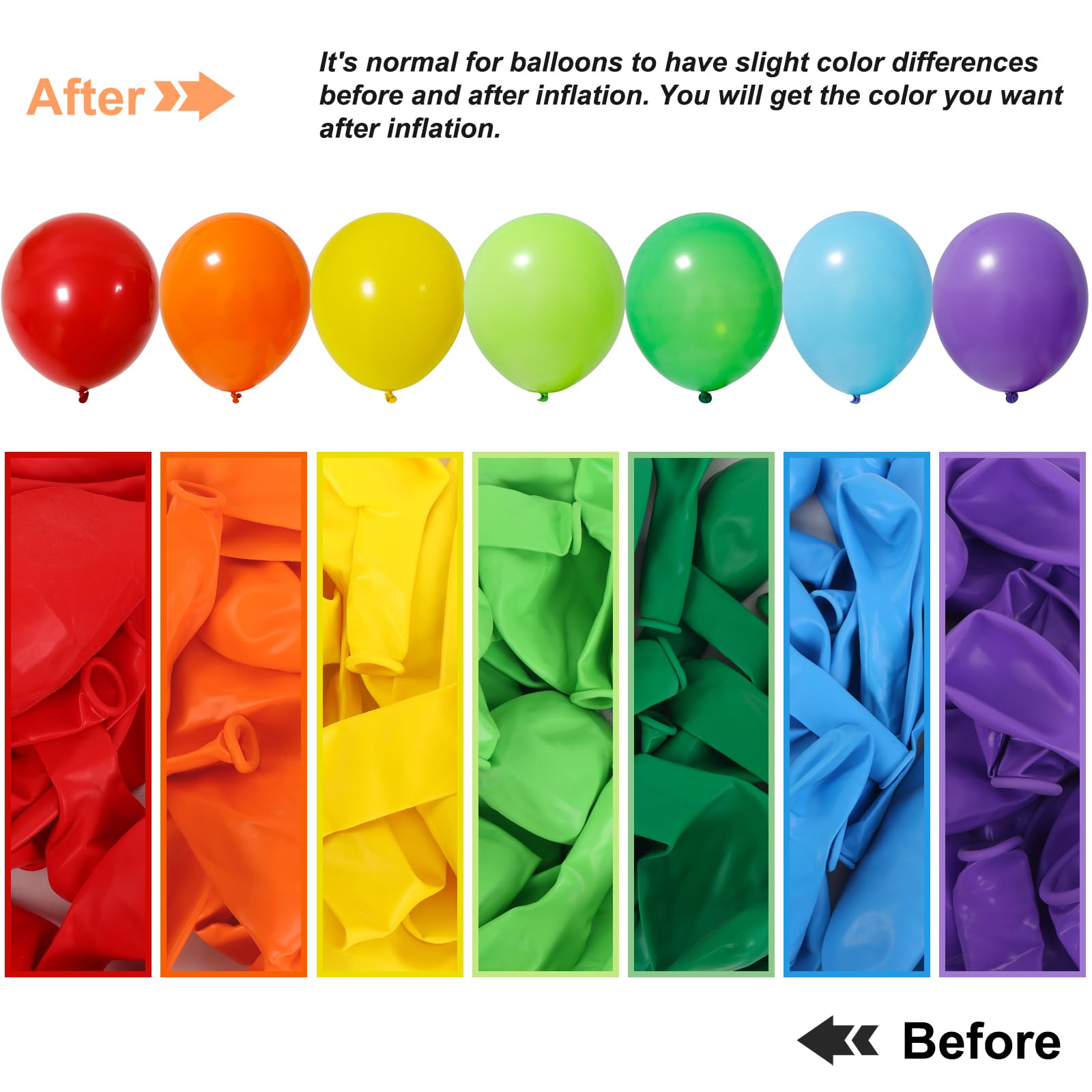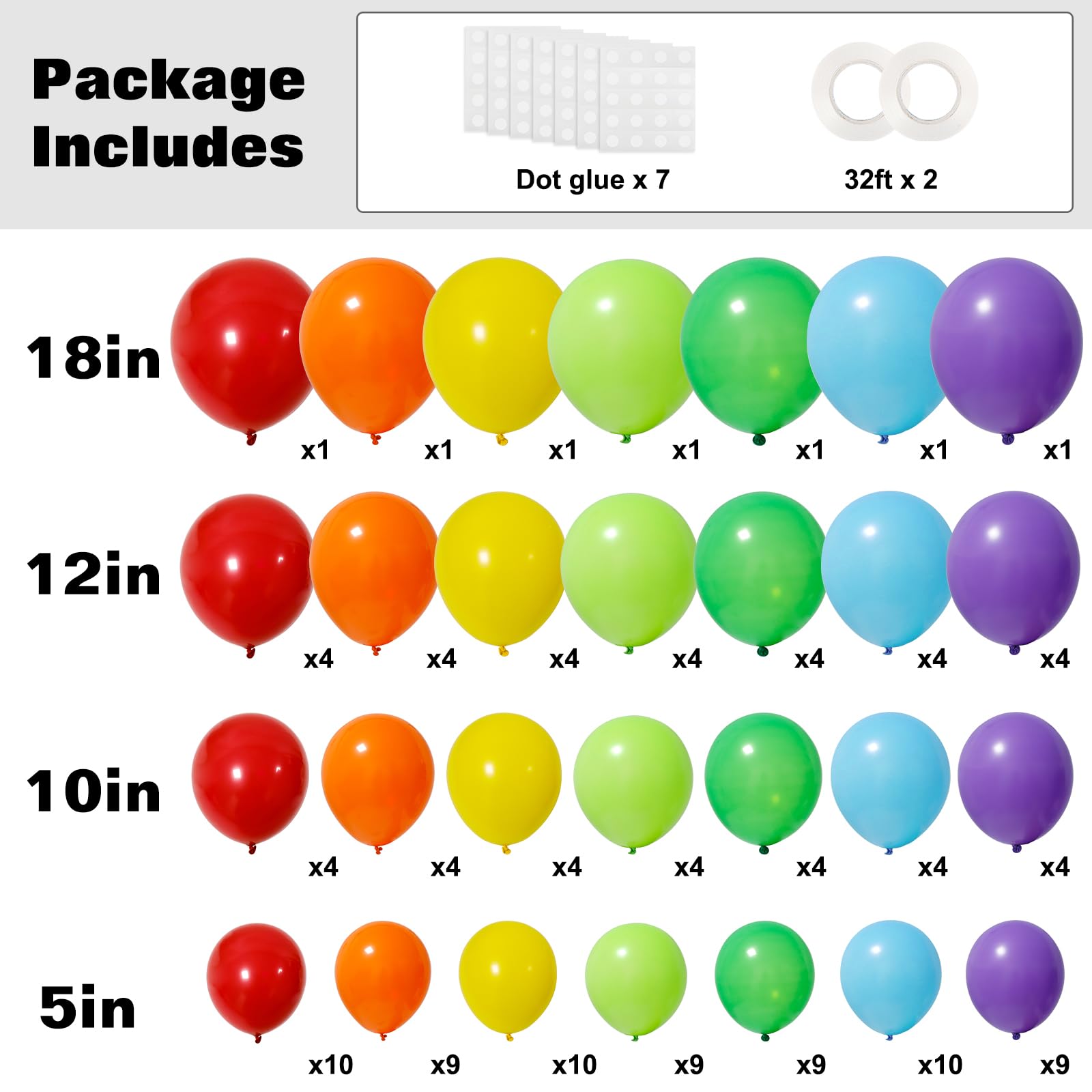 PARTY BALLOONS KIT: Includes 129 Balloons - 18inch 7pcs, 12inch 28pcs, 10inch 28pcs, 5inch 66pcs (total 7 colors: red, orange, yellow, green, lime green, blue, purple), 7 pieces of glue, and 2 rolls of white ribbon. These rainbow balloons with different sizes can meet your needs.