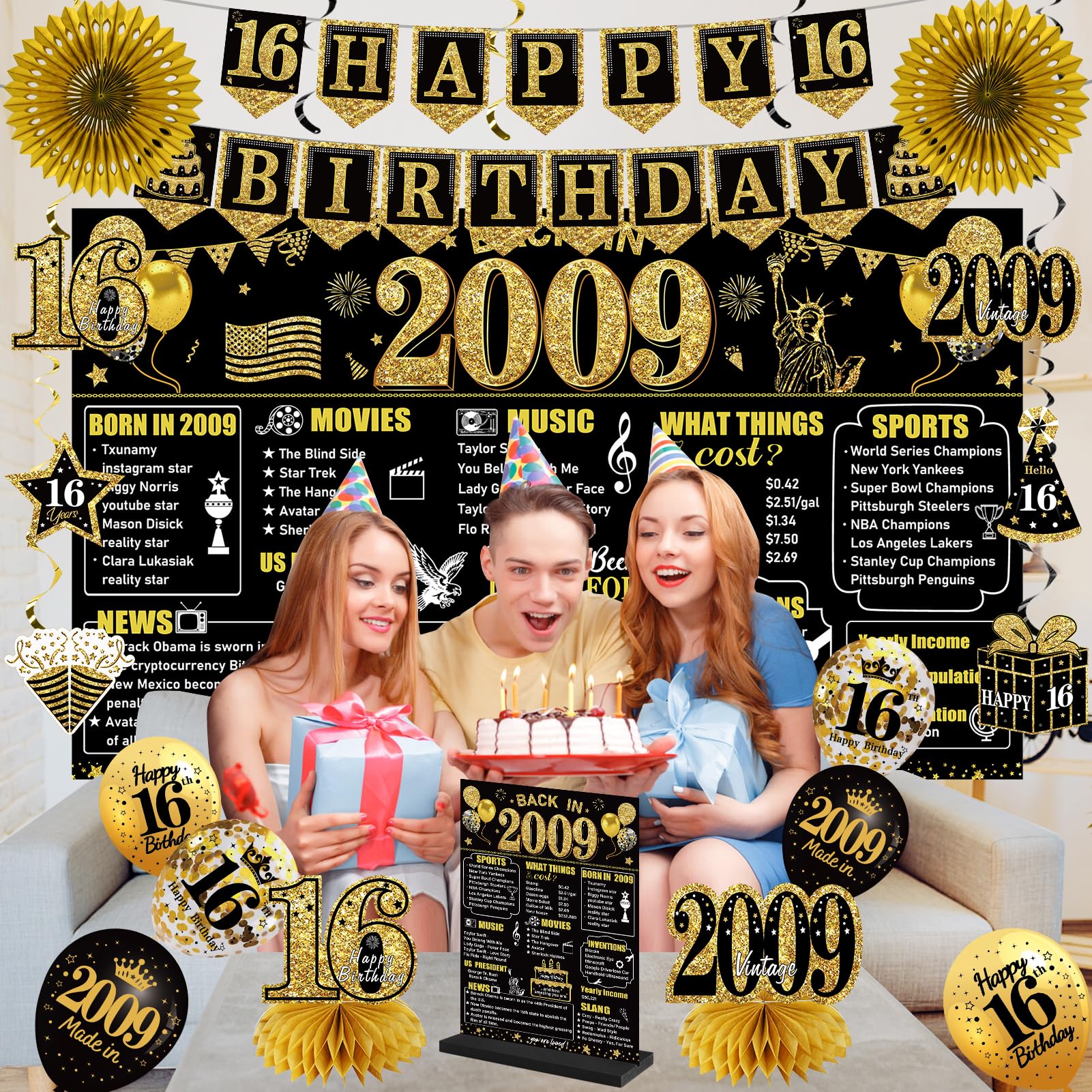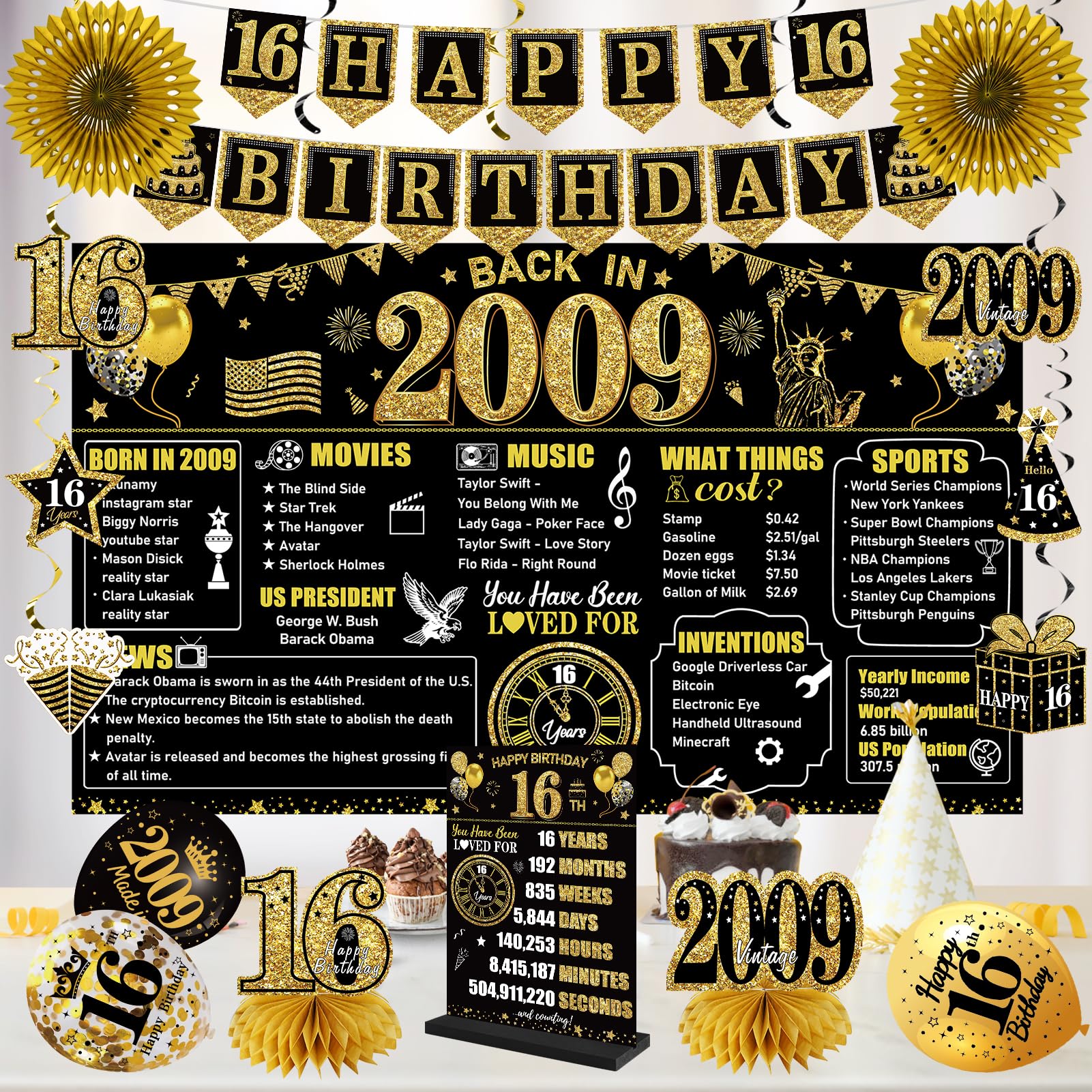 16th Birthday Decorations Kit: 1 Back in 2009 Banner Backdrop,1 Back in 2009 Table Poster Card,1 “16 Happy Birthday” banner, 6pcs Hanging Swirl, 8pcs 12inch balloons,2pcs Honeycomb Centerpiece, 2pcs 10 inch paper fan. The 16th theme birthday party decoration kit is enough to meet your decorating needs and easily create a strong birthday atmosphere in your home
